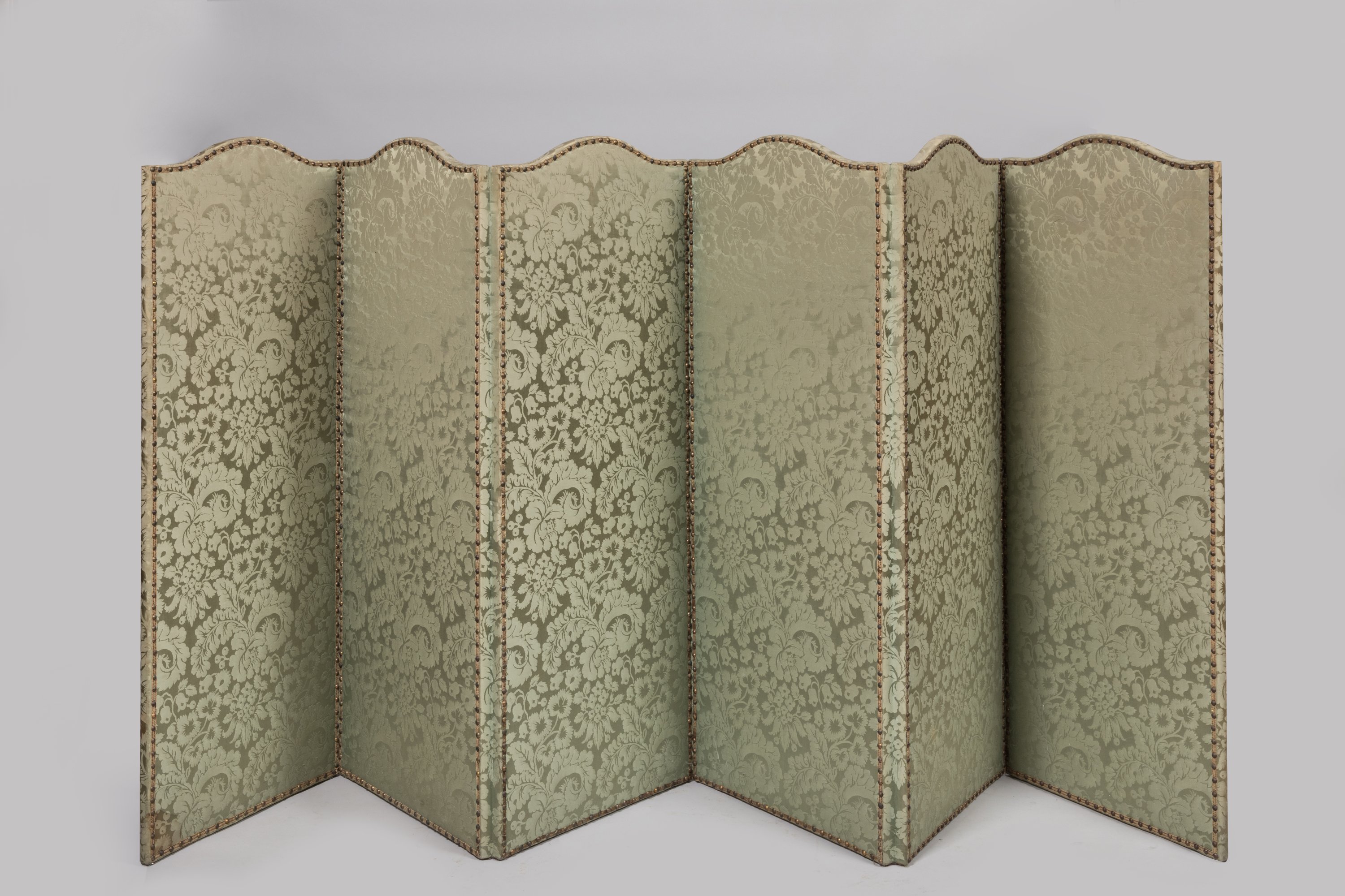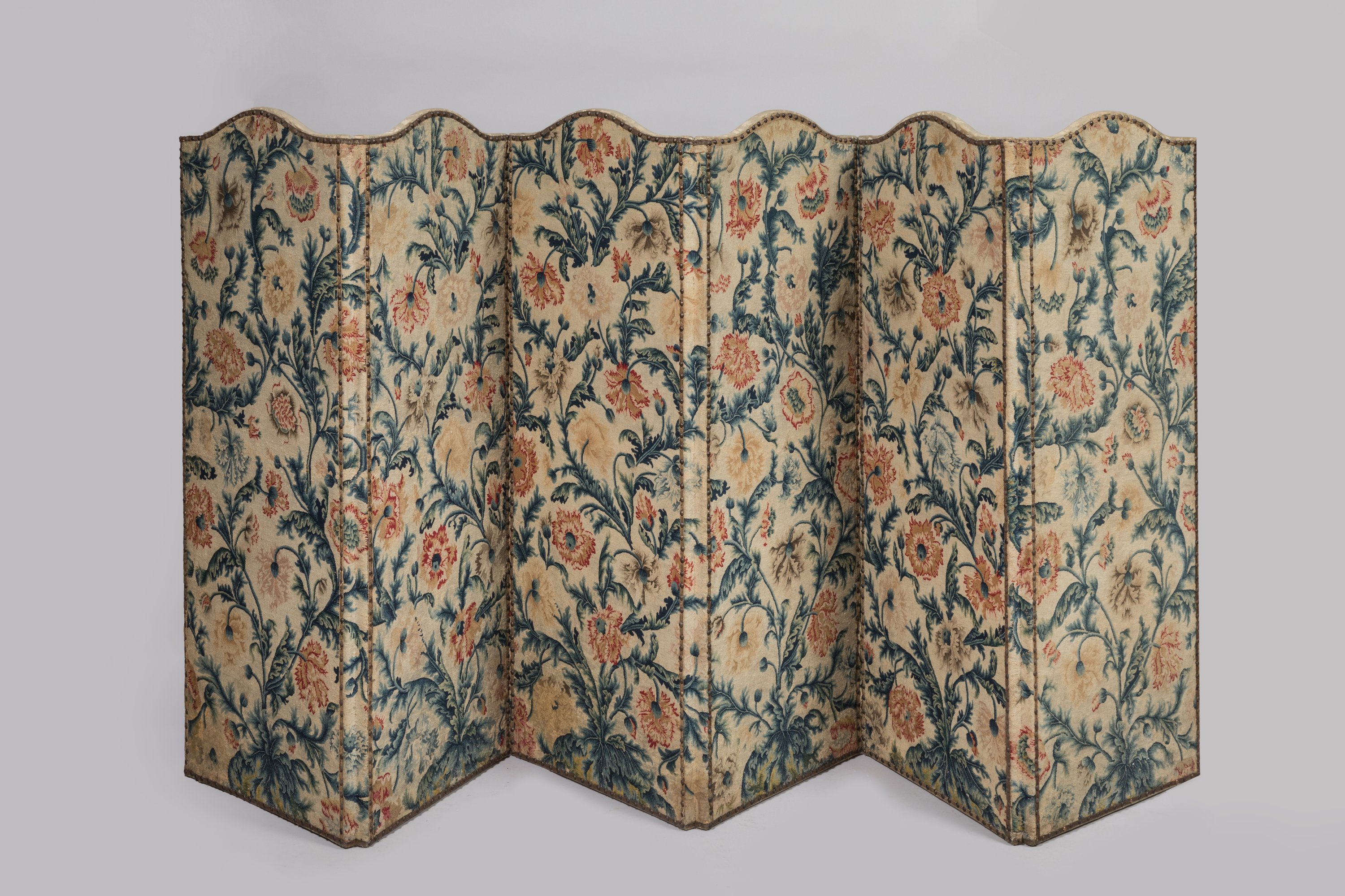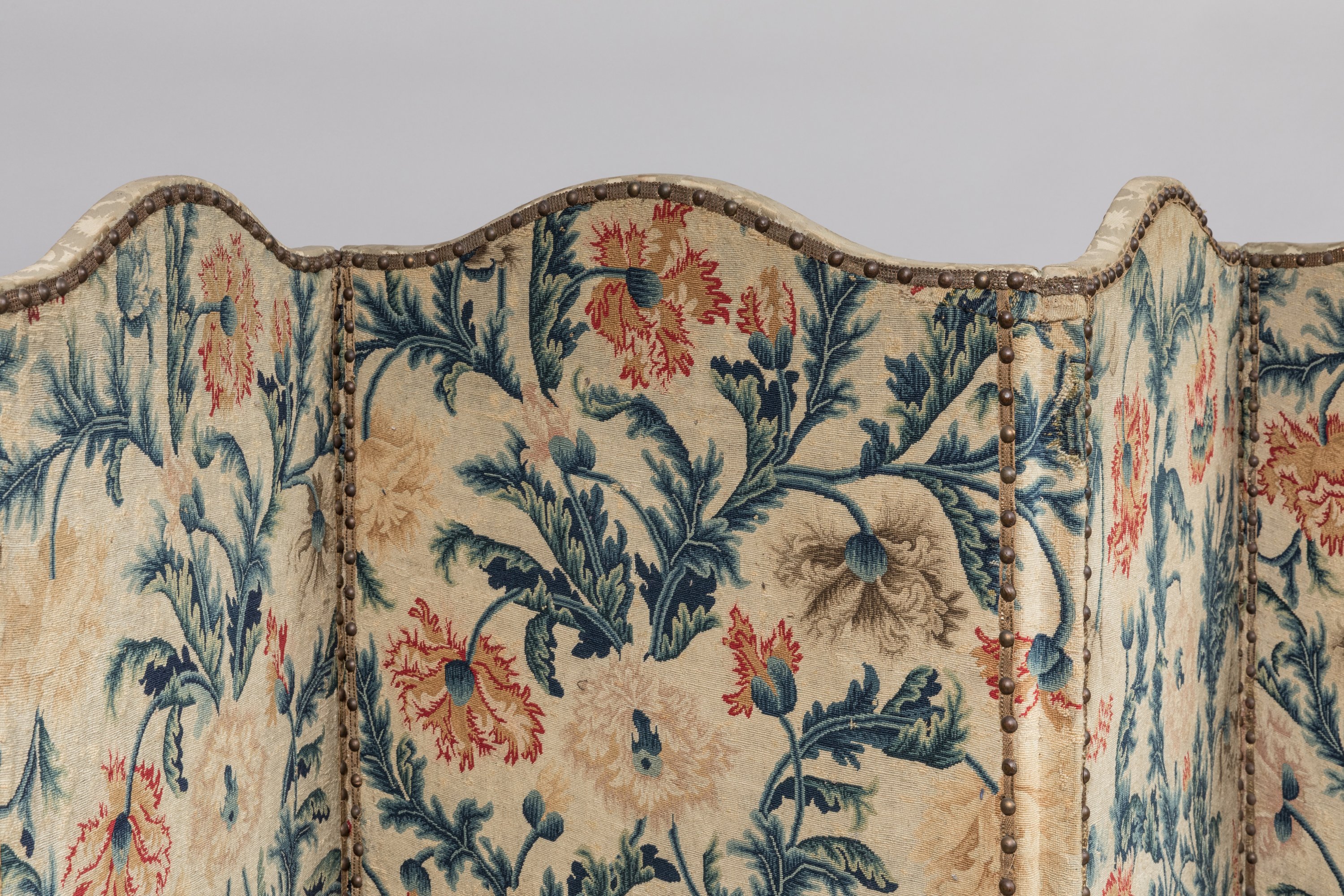 six feuilles, couvert d'une tapisserie au point, fond crème, décor aux pavots, doublure d'un damas vert.