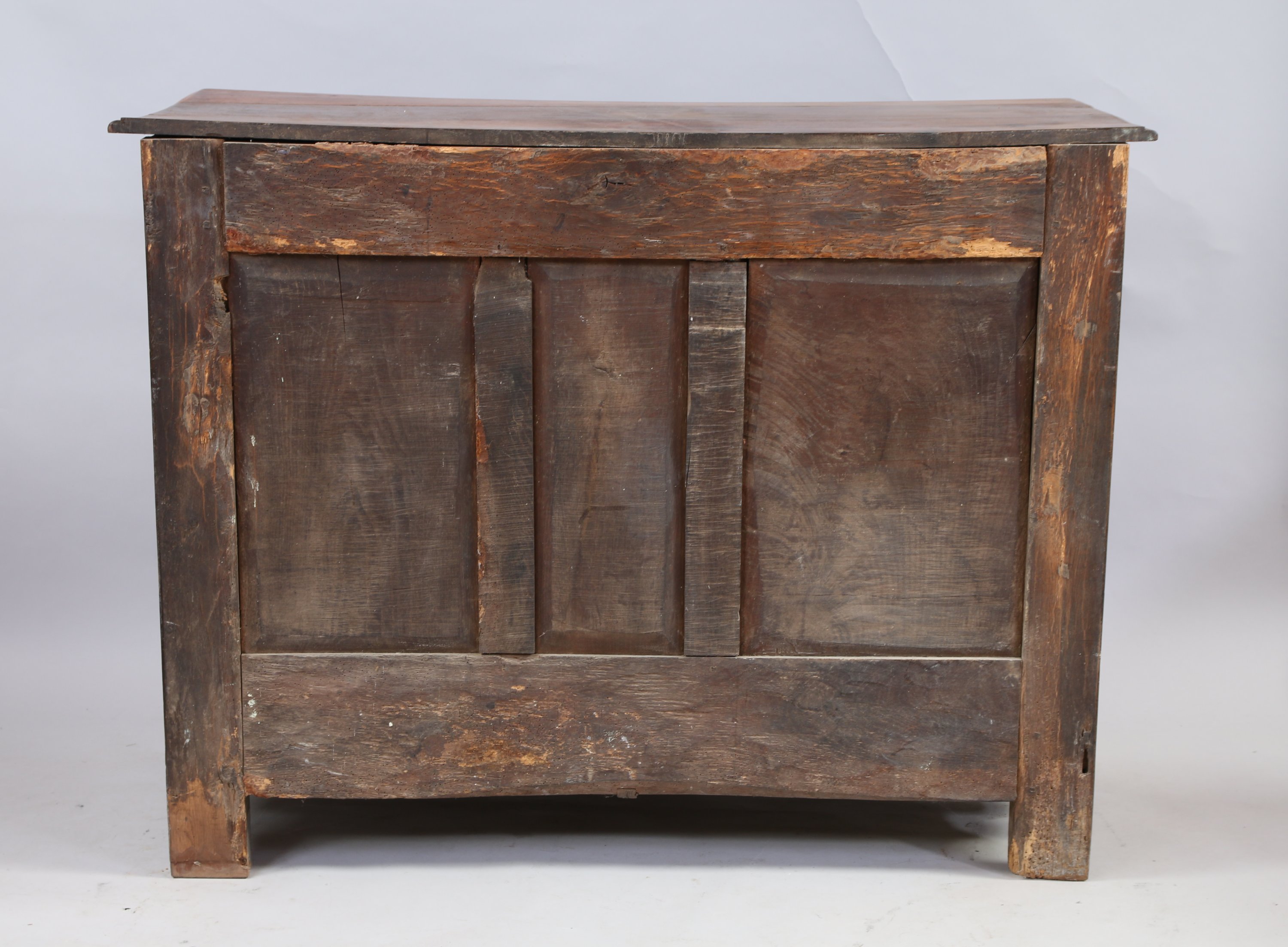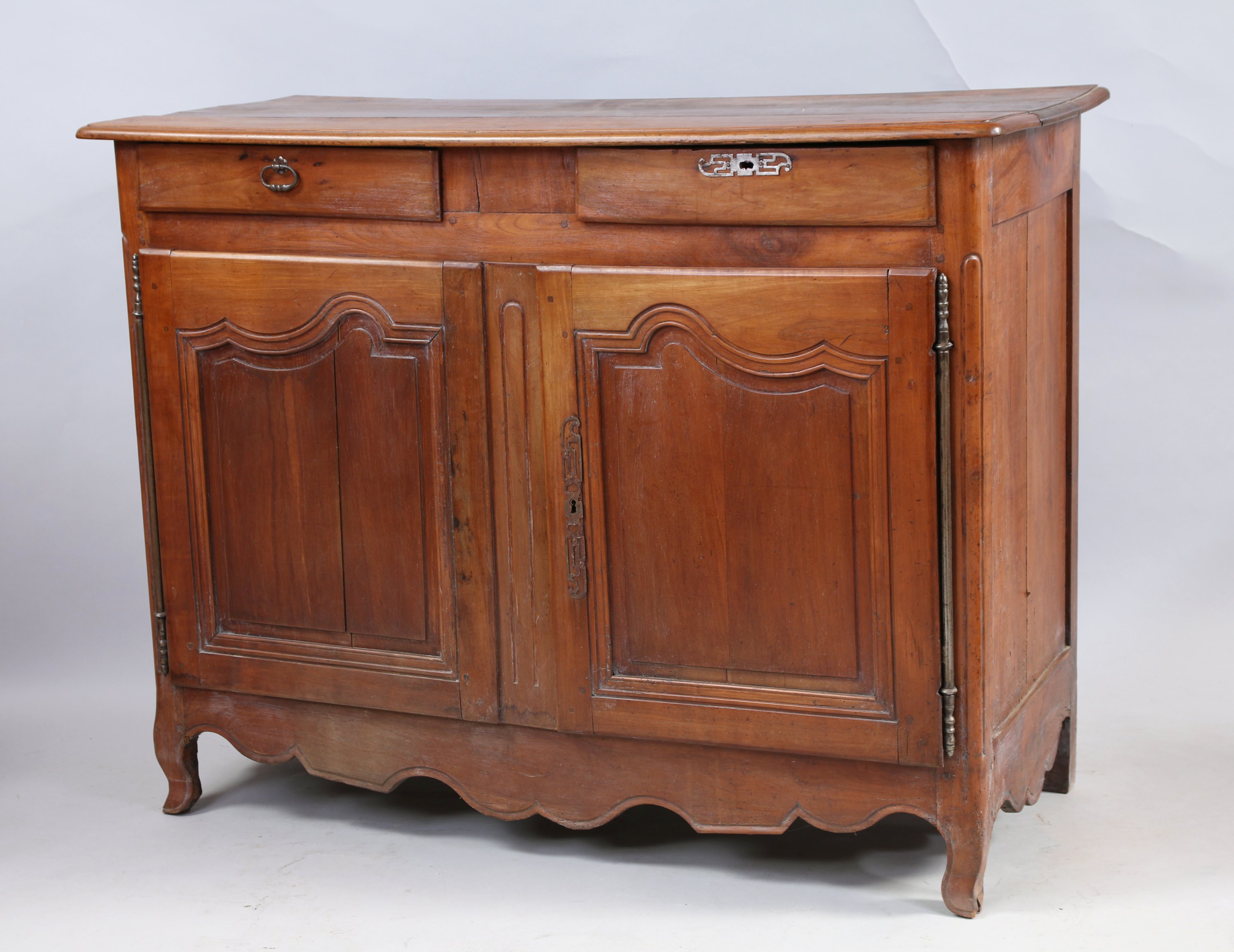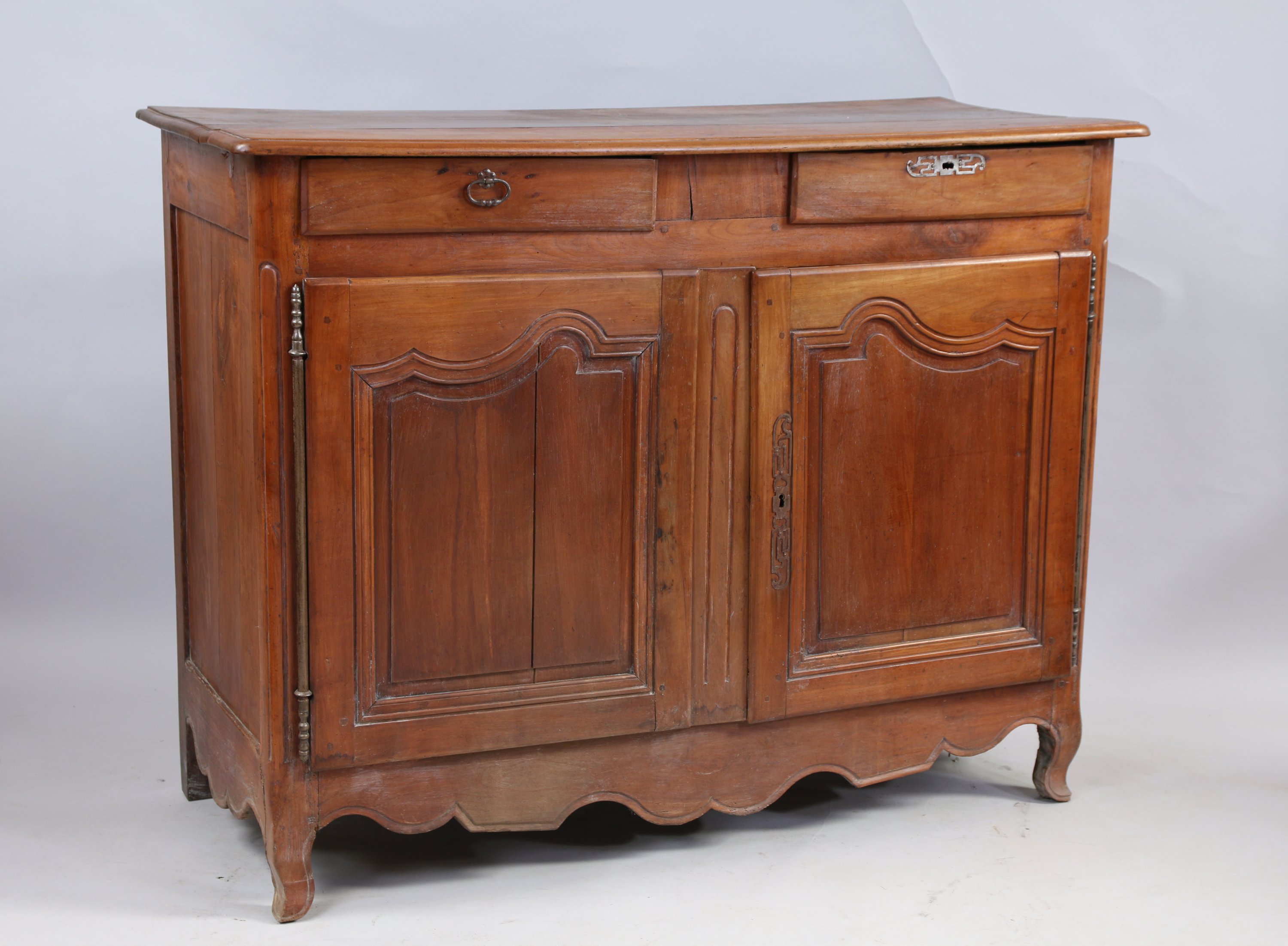 Les portes ornées d'un encadrement à double cuvette formant une vague en partie supérieure. Il repose sur des pieds antérieurs légèrement galbés. Entrées de serrure, poignées de tirage et charnières.