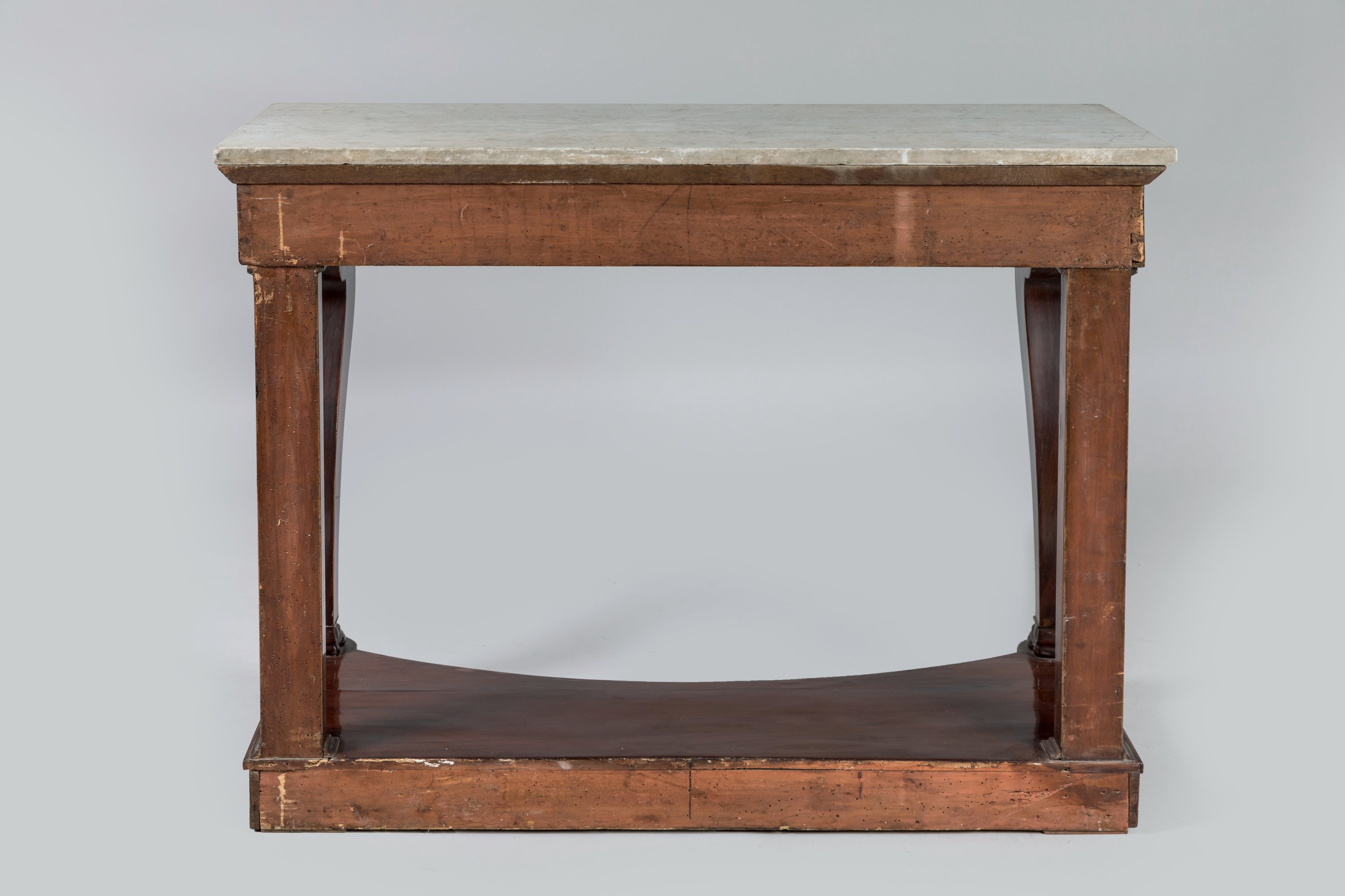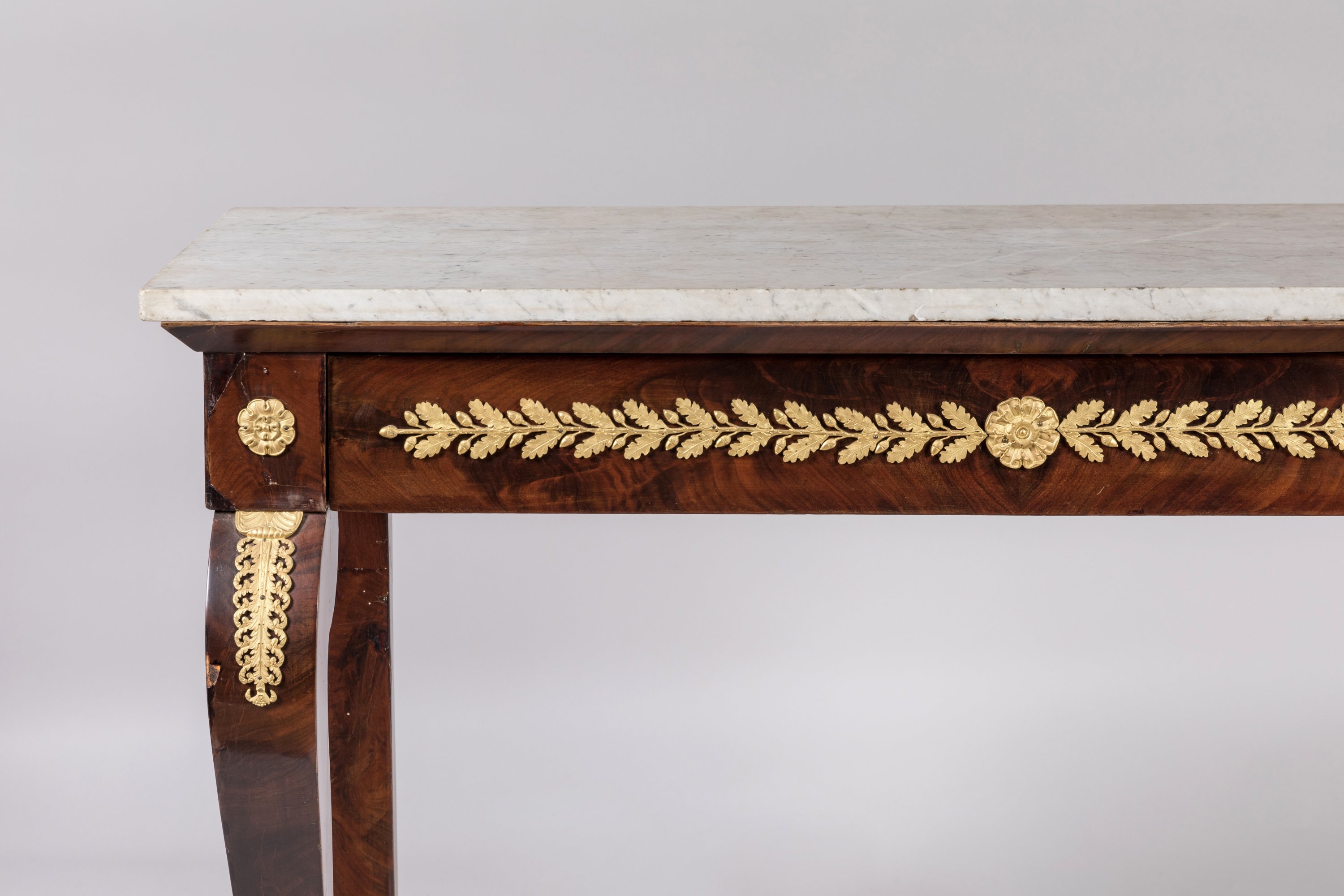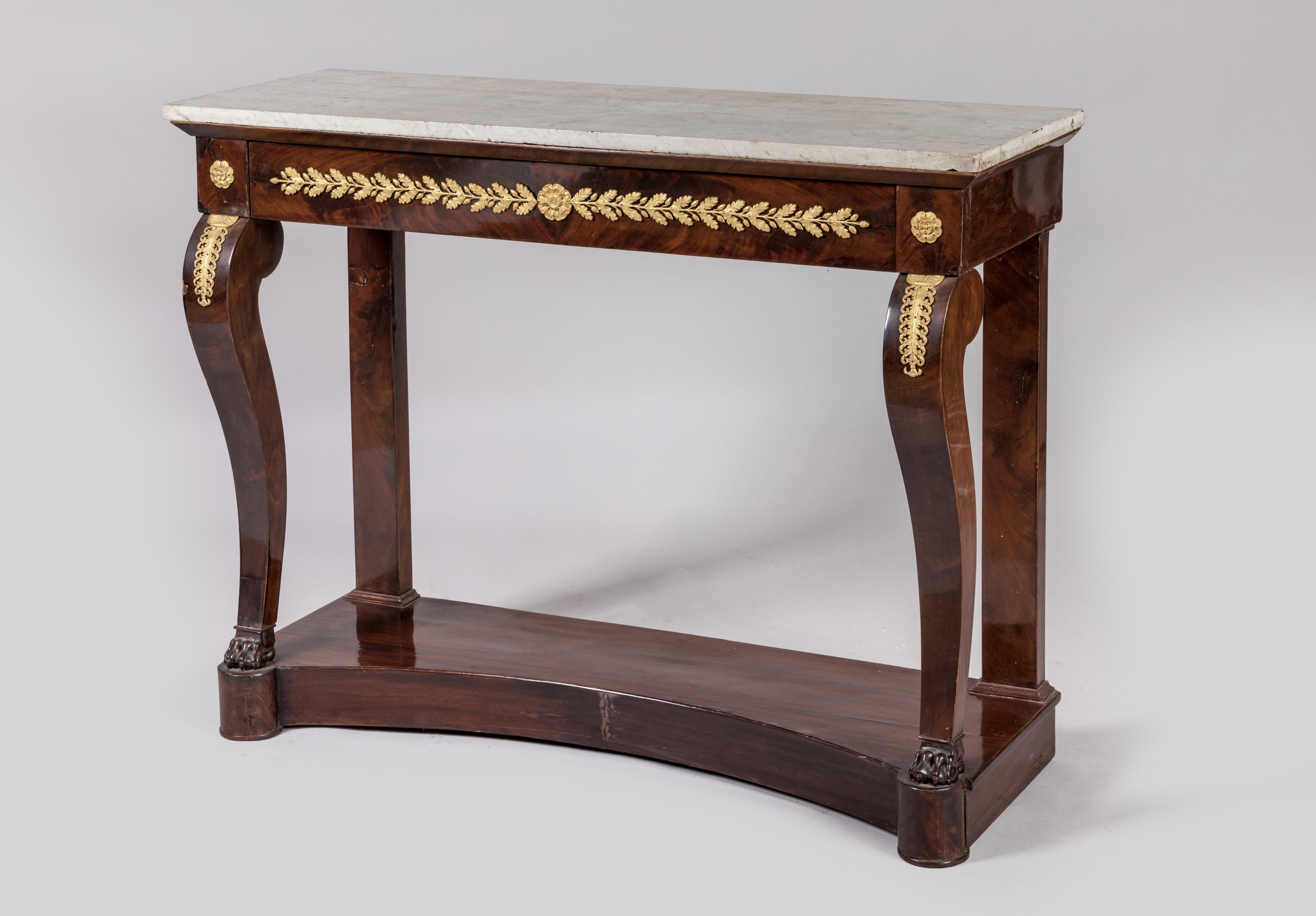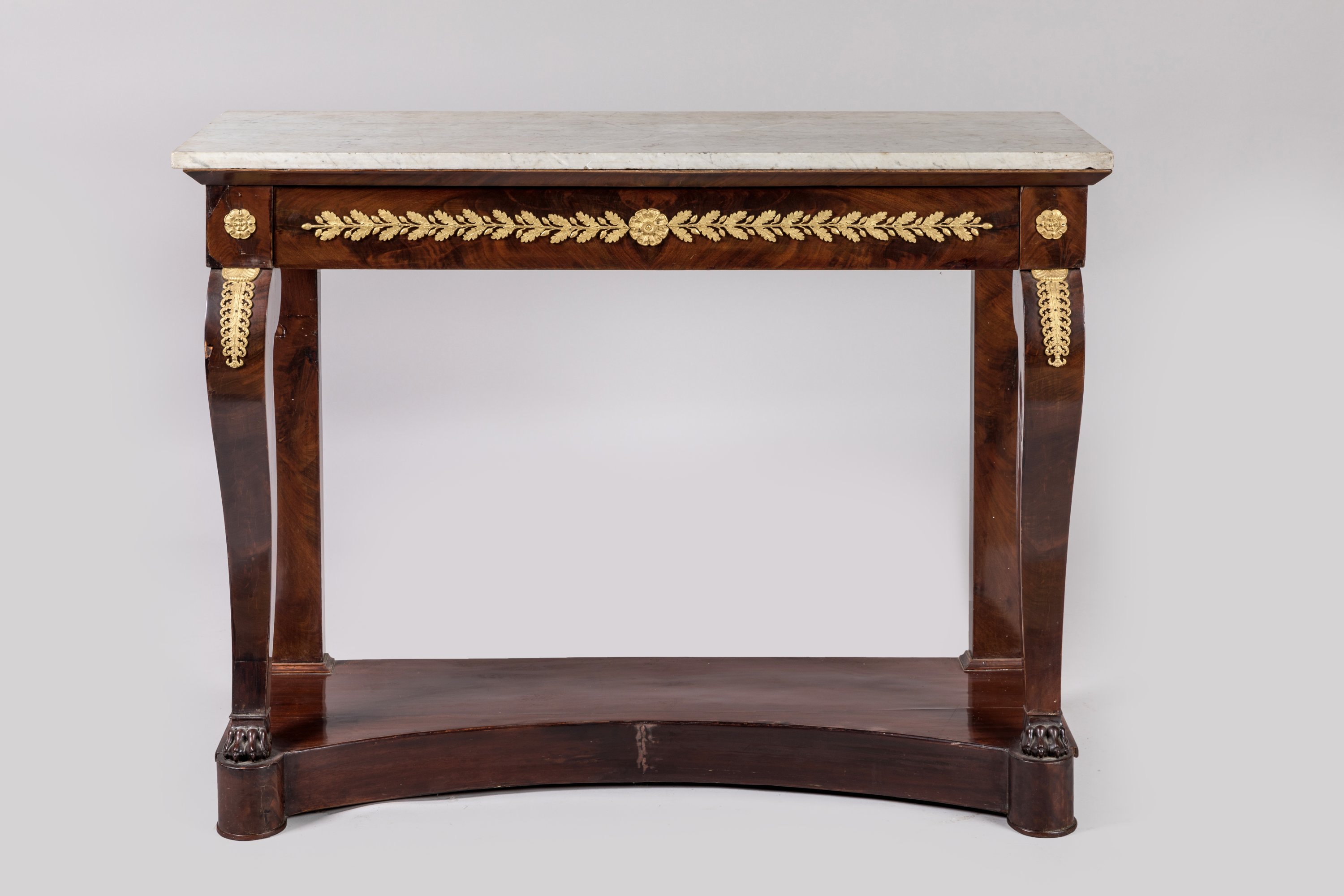 et placage d'acajou, ouvrant par un tiroir en ceinture. Les pieds postérieurs droits et antérieurs en console terminés par des griffes de lion, réunis par une plinthe. Ornementation de bronzes dorés tels : guirlande de feuilles de chêne, palmettes et rosaces.