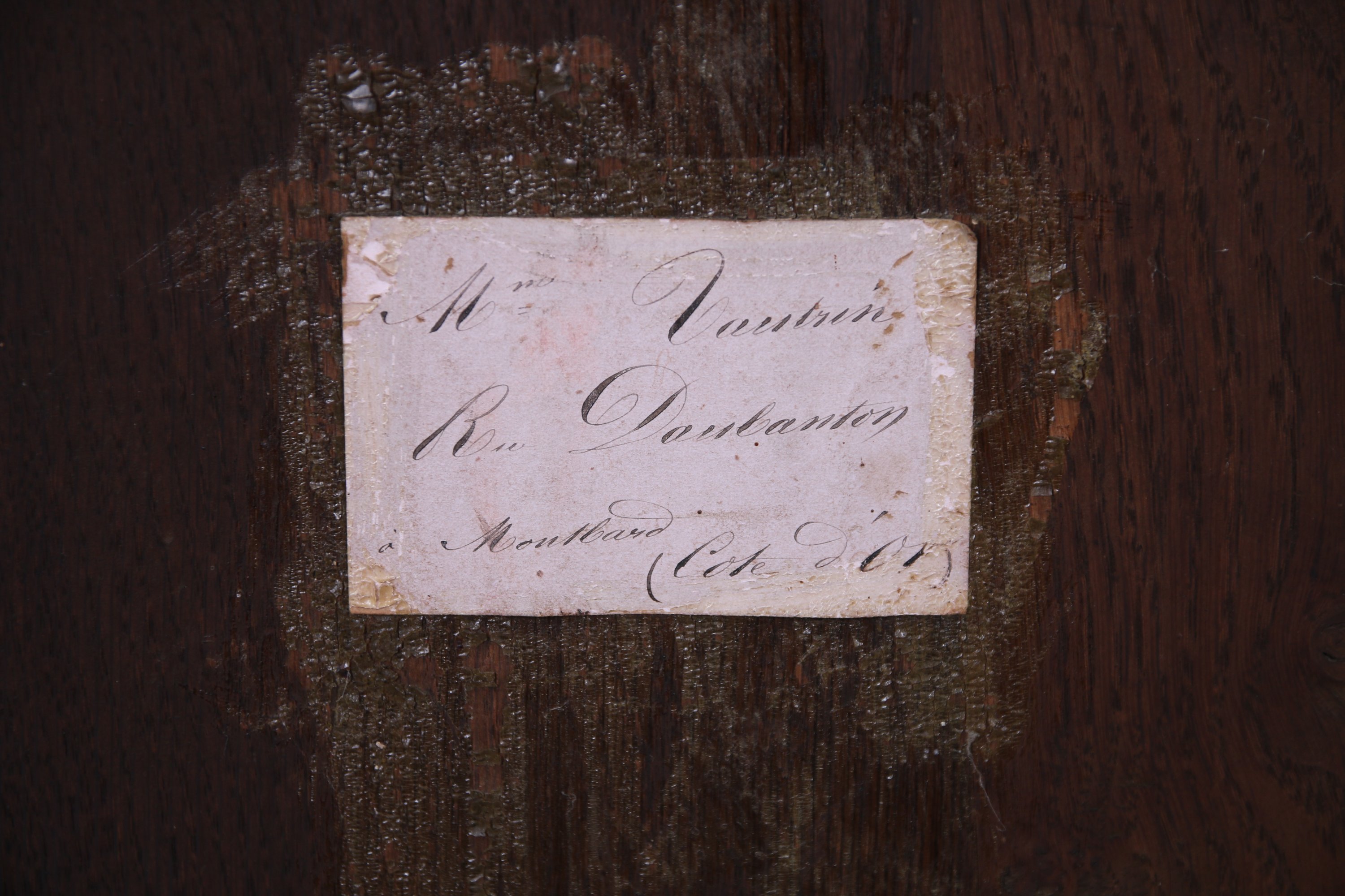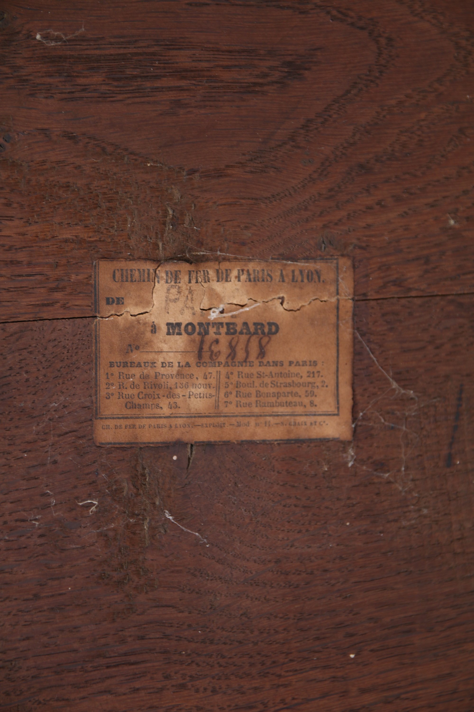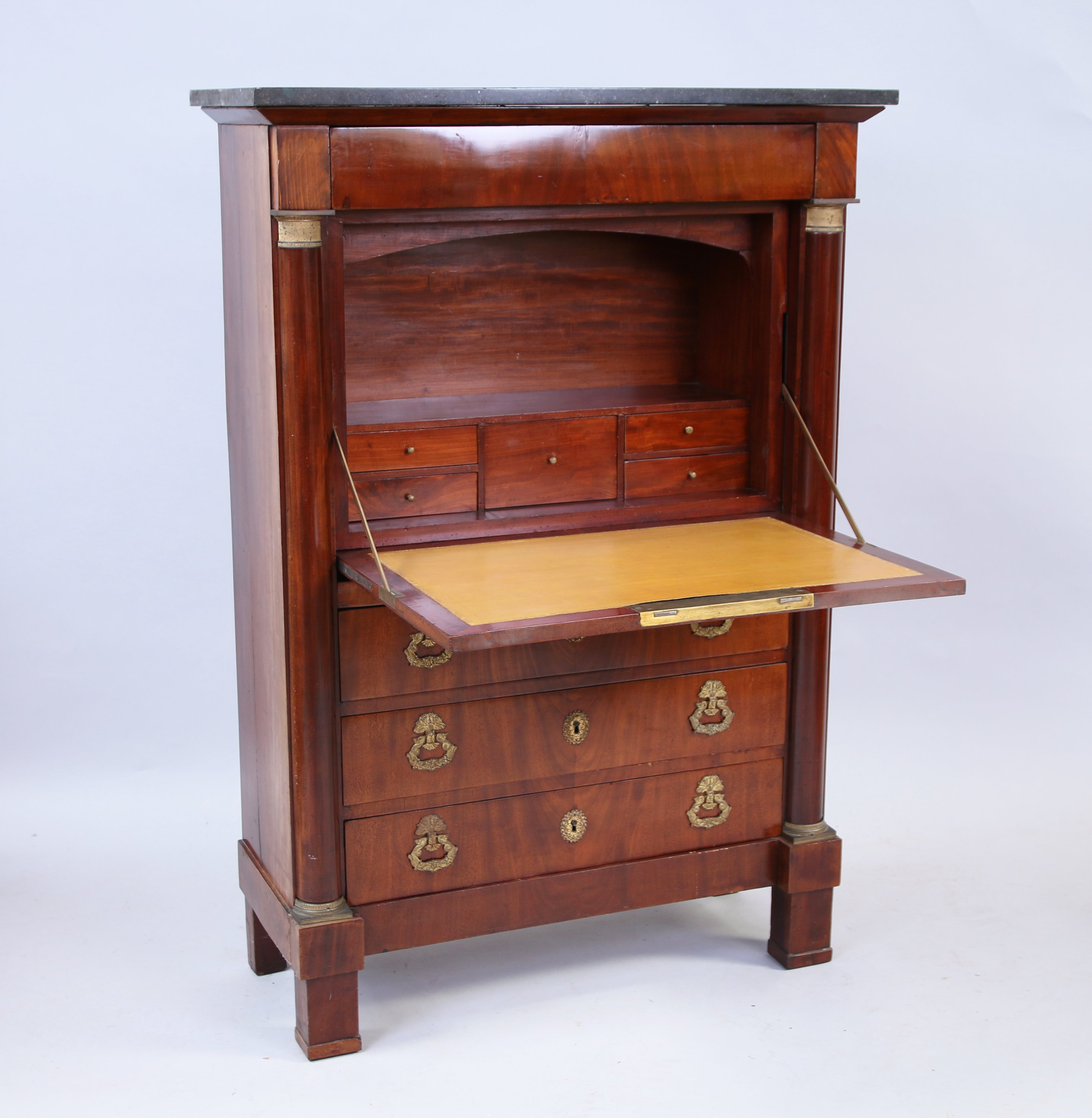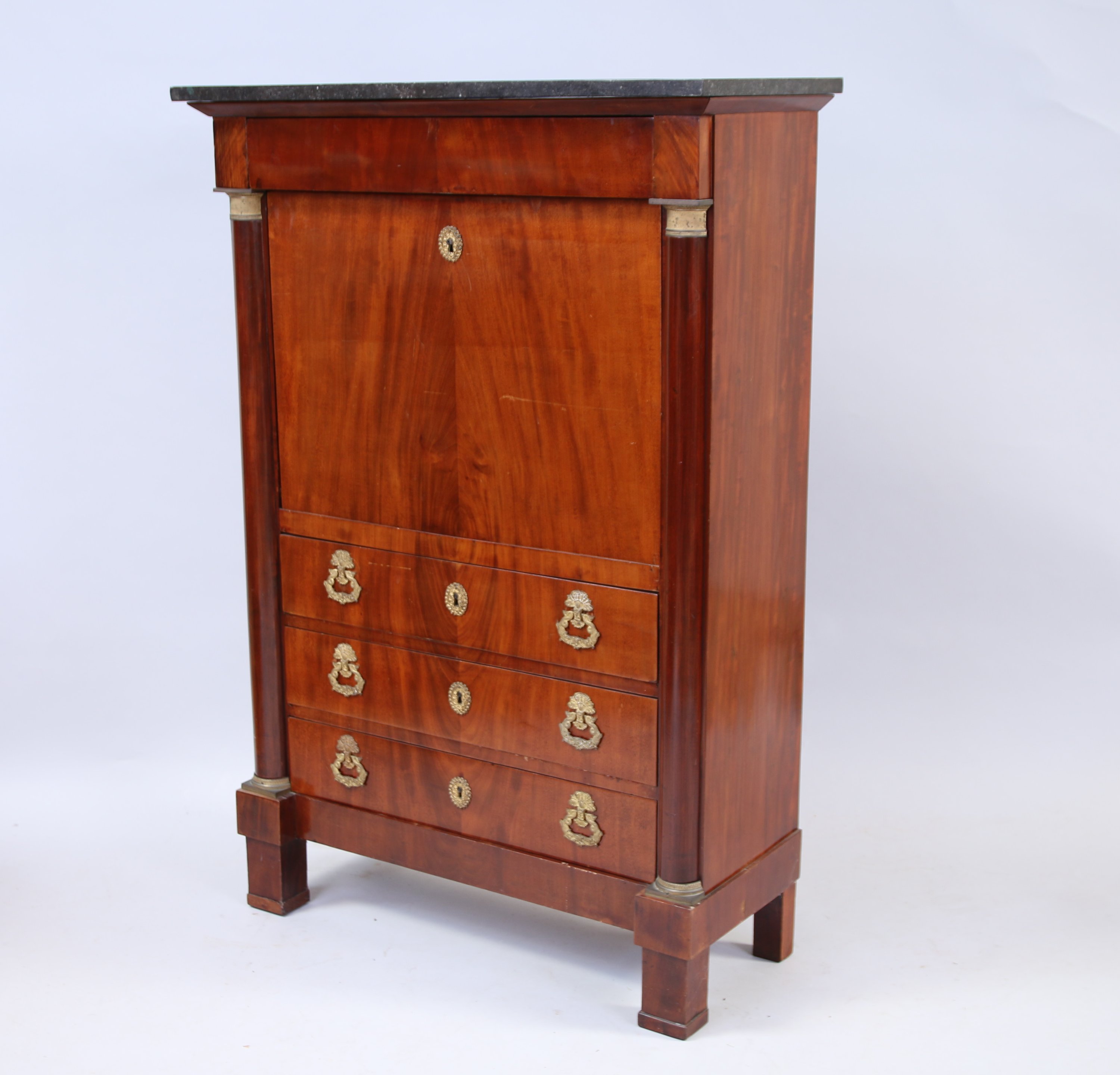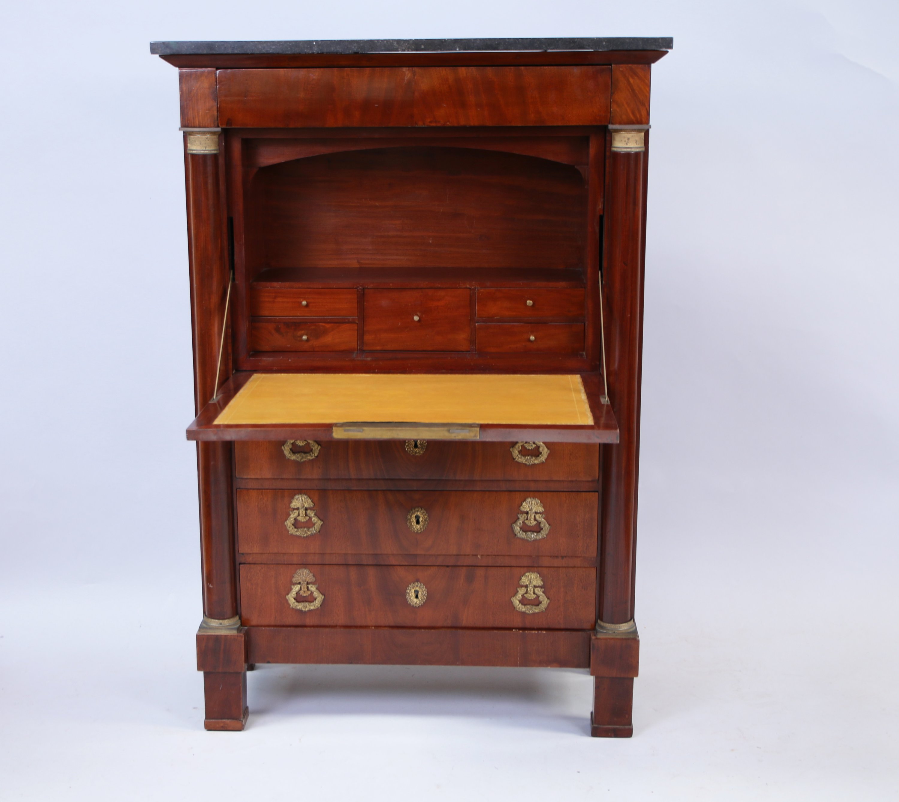 ouvrant en façade par trois tiroirs sur trois rangs et un abattant entouré de deux colonnes. Il découvre une niche surmontant un tiroir central entouré de chaque côté de deux rangées de tiroirs et un cuir jaune gaufré au petit fer. Ornementation en bronze doré tels chapiteaux à décor de feuilles d'eau, bases, poignées et boutons de tirage, entrées de serrure. Recouvert d'un marbre granit belge.