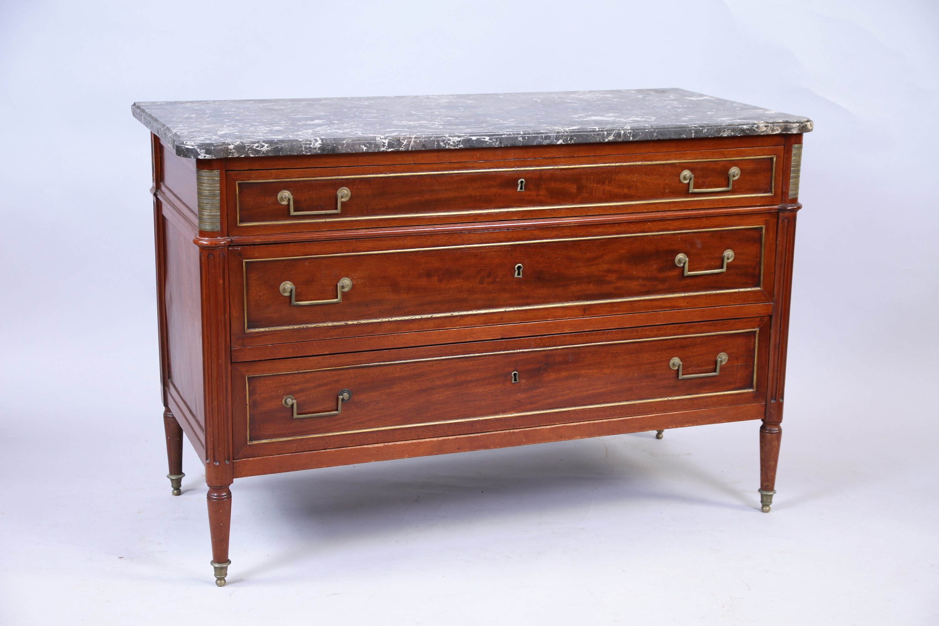 Elle ouvre par trois tiroirs cerclés d'un filet de laiton doré. Le meuble est flanqué de deux colonnes cannelées. Ornementation : baguettes quart de rond en laiton, poignées tombantes, montants à cannelures en bronze doré.