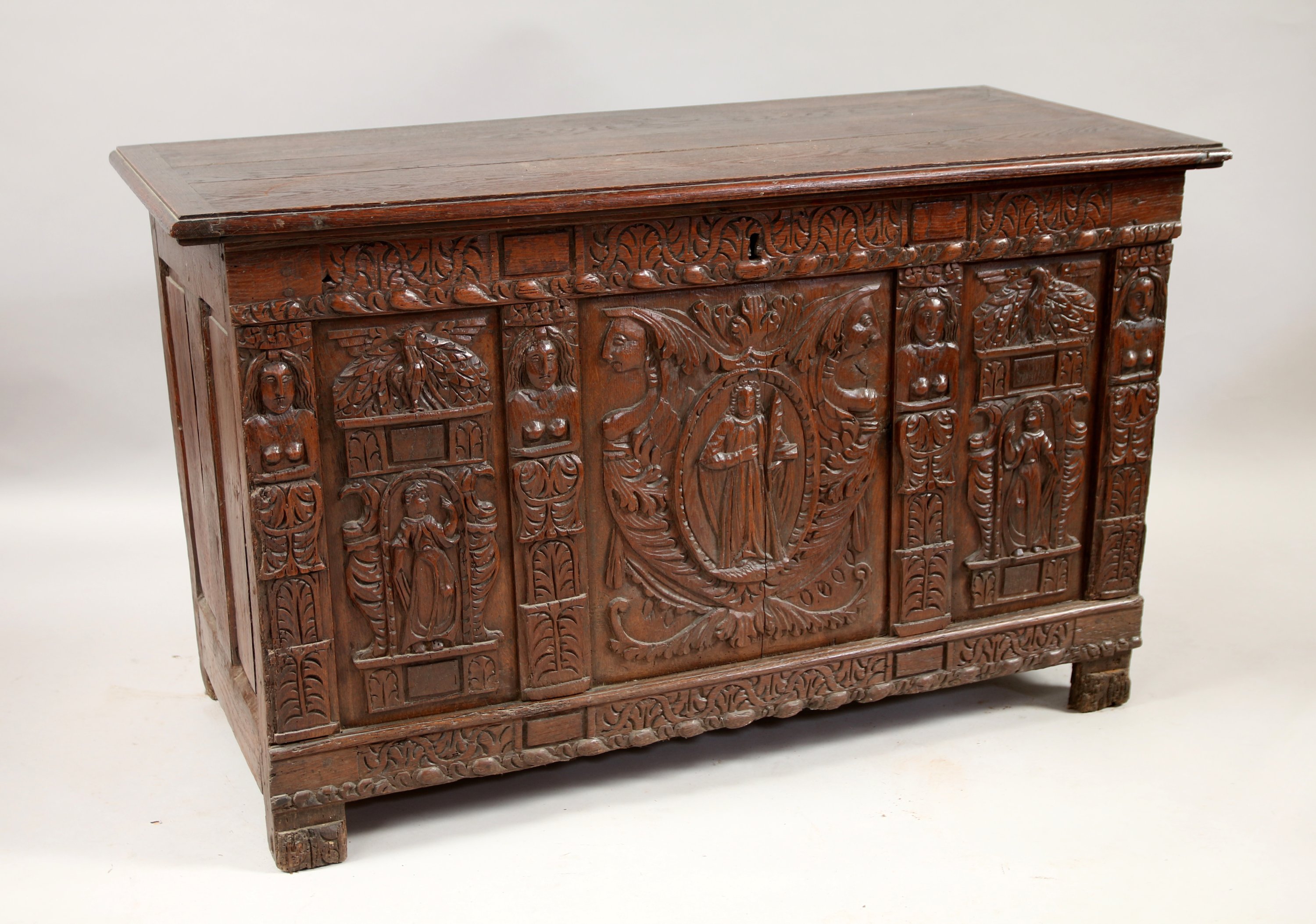 en chêne sculpté et gravé sur la face principale de motifs alternant représentations humaines , motifs hybrides et pur décoratif. Au centre un médaillon présente un martyr à la palme accosté de deux figures hybrides dos à dos. Le meuble est scandé par quatre piles figurant des femmes accroupies. Entre ces piles de chaque côté un médaillon flanqué de deux figures ornithocéphales présente un personnage.