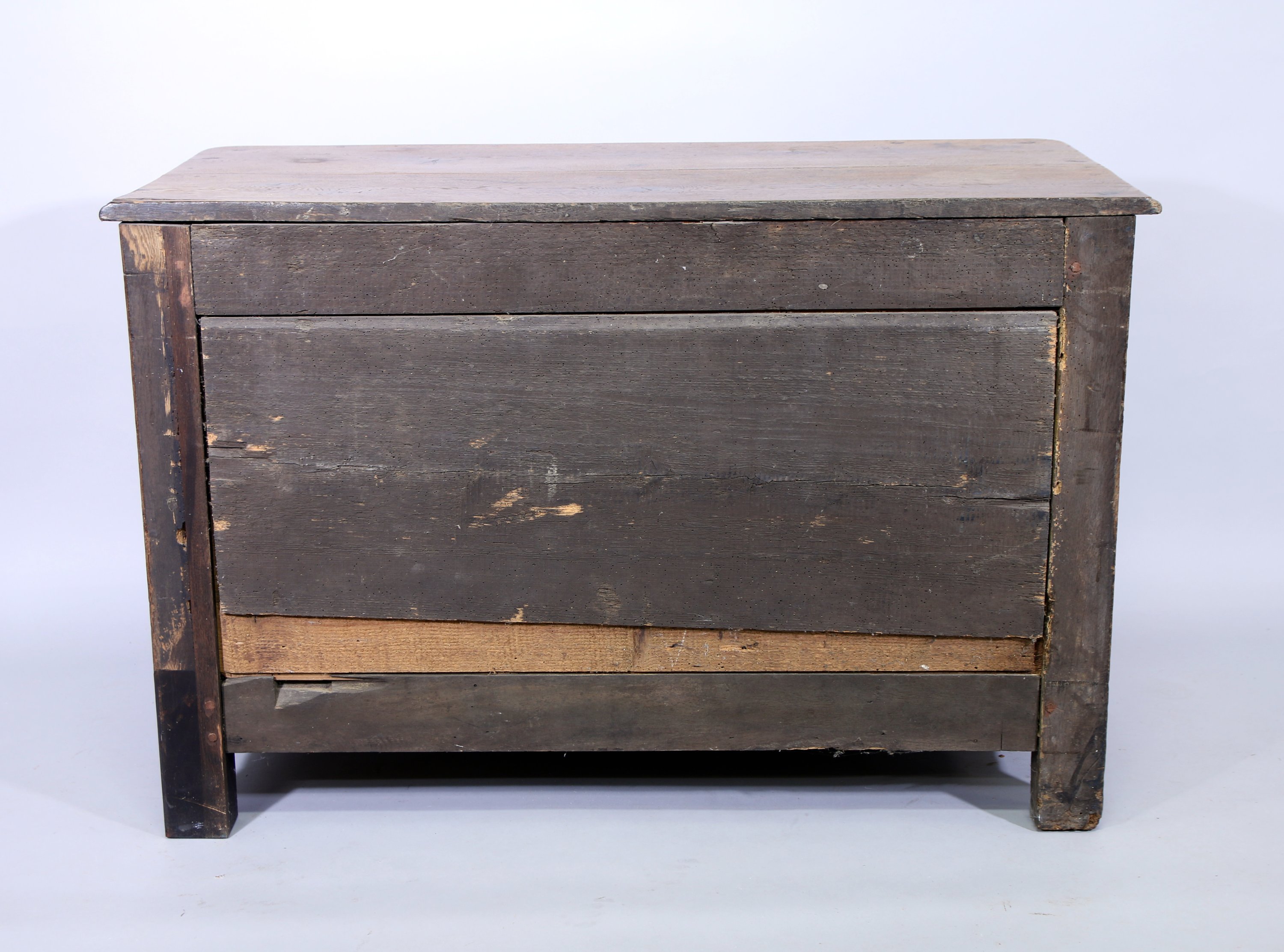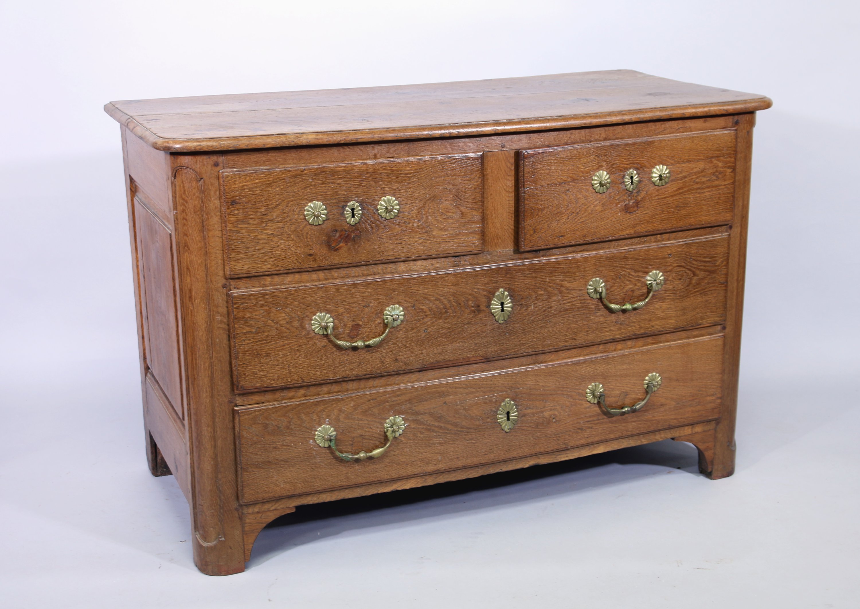 Elle est ornée de mains tombantes et entrées de serrure en bronze doré à décor de pétales rayonnants. Les pieds droits le plateau laissé nu.