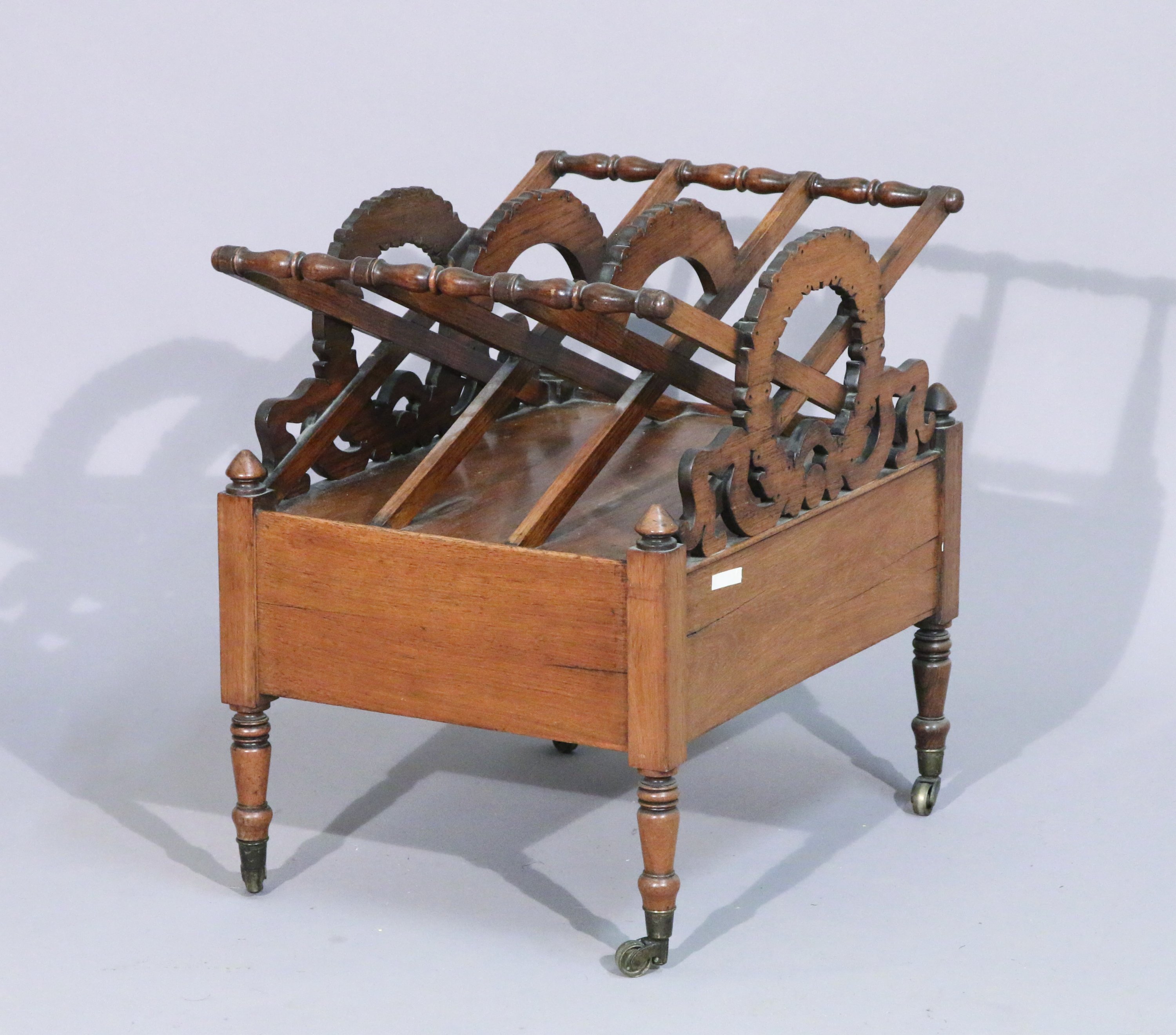 de forme rectangulaire comprenant trois compartiment en X joint par des civières de formes balustres en bois tourné et décoré de couronne de laurier, tiroir à motifs de rinceaux de feuillages en acajou, reposant sur quatre pieds effilés et tournés à sabots de bronze marqué « copes Patent » La moitié supérieure à décor dune couronne remplacée.