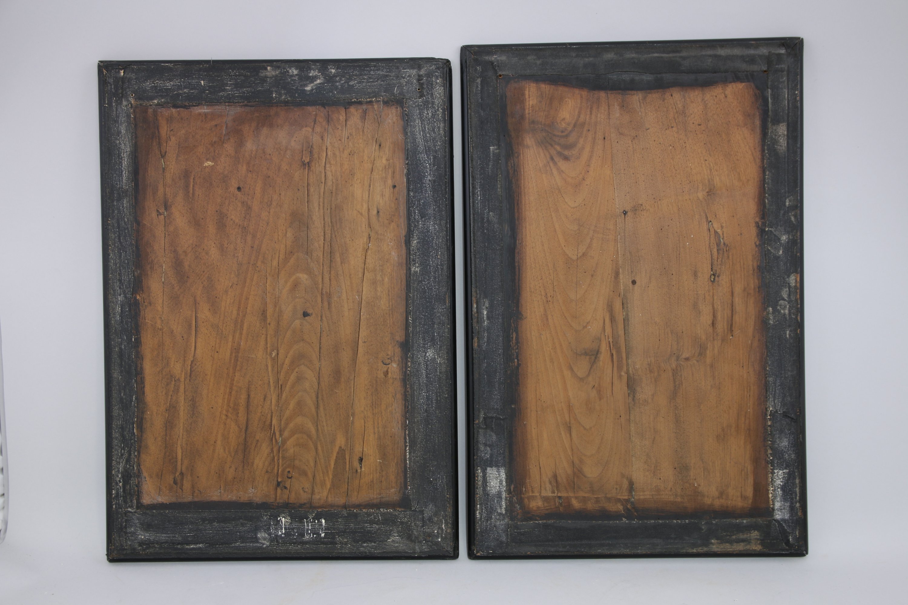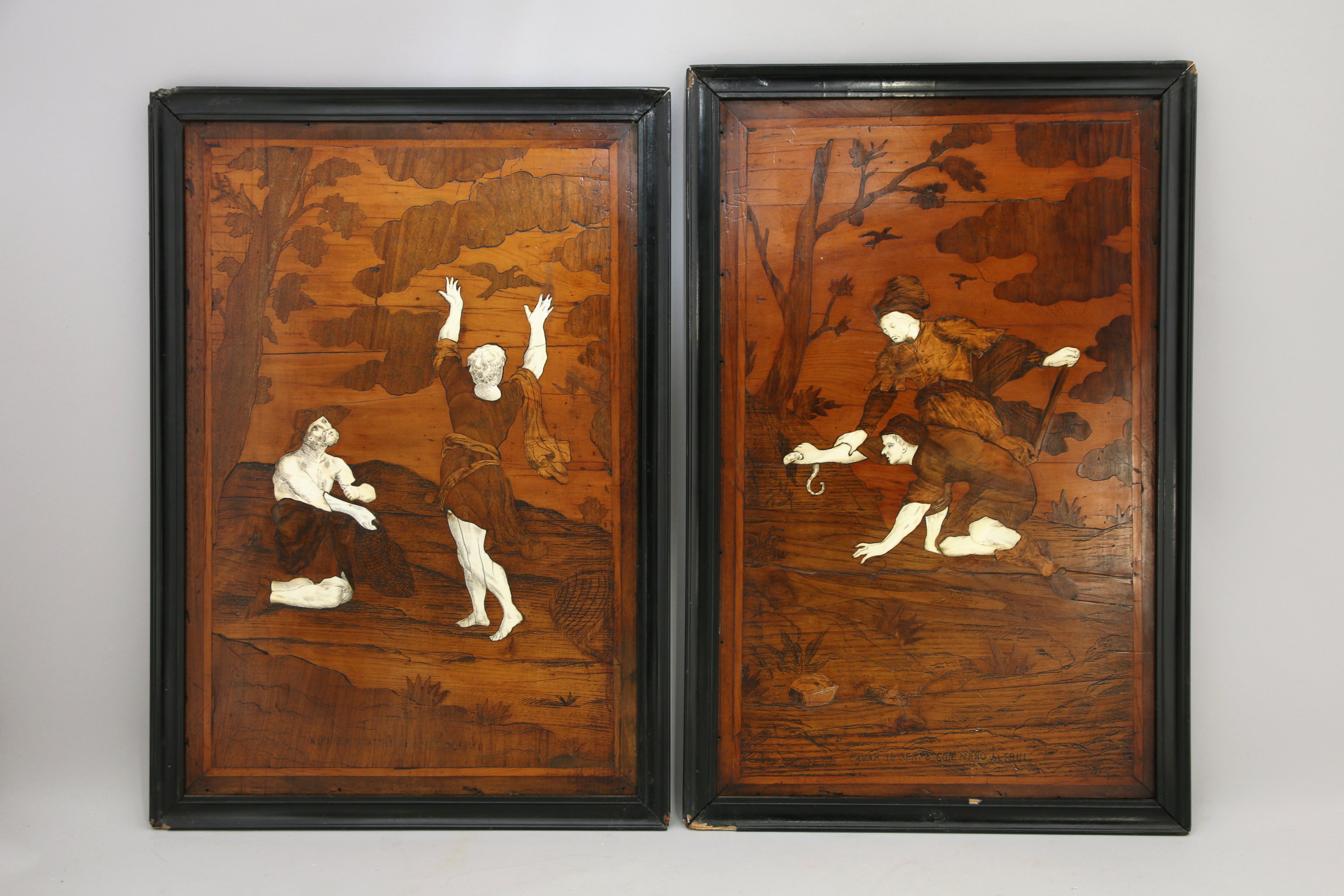 en marqueterie de bois, os et ivoire. Ils figurent des personnages imageant des dictons italiens, "Non dir quattro se non é nel sageo" pour celui figurant un homme attrapant un oiseau, et "Cavar ie serpe son mano altrui" pour l'autre représentant deux hommes attrapant un serpent.