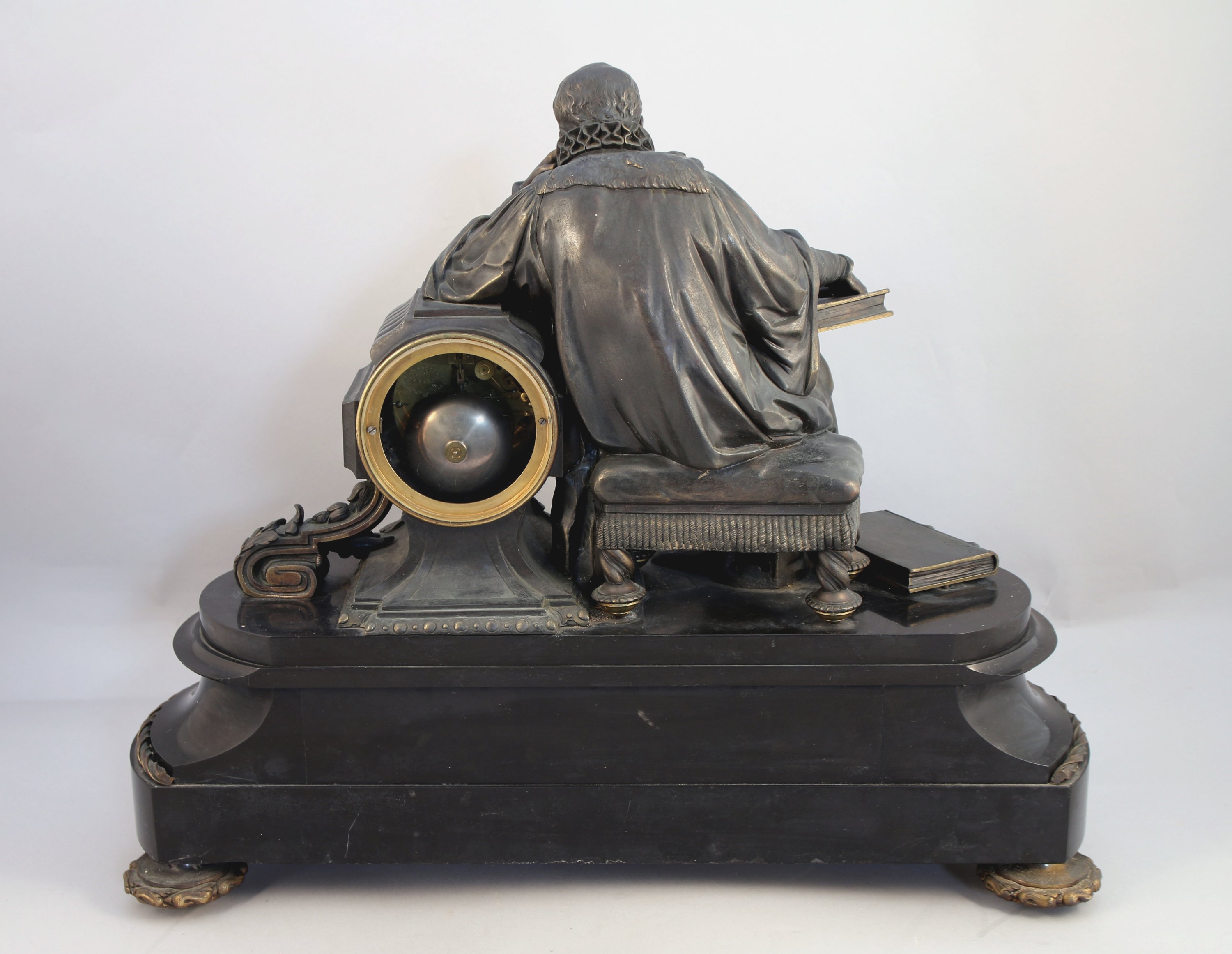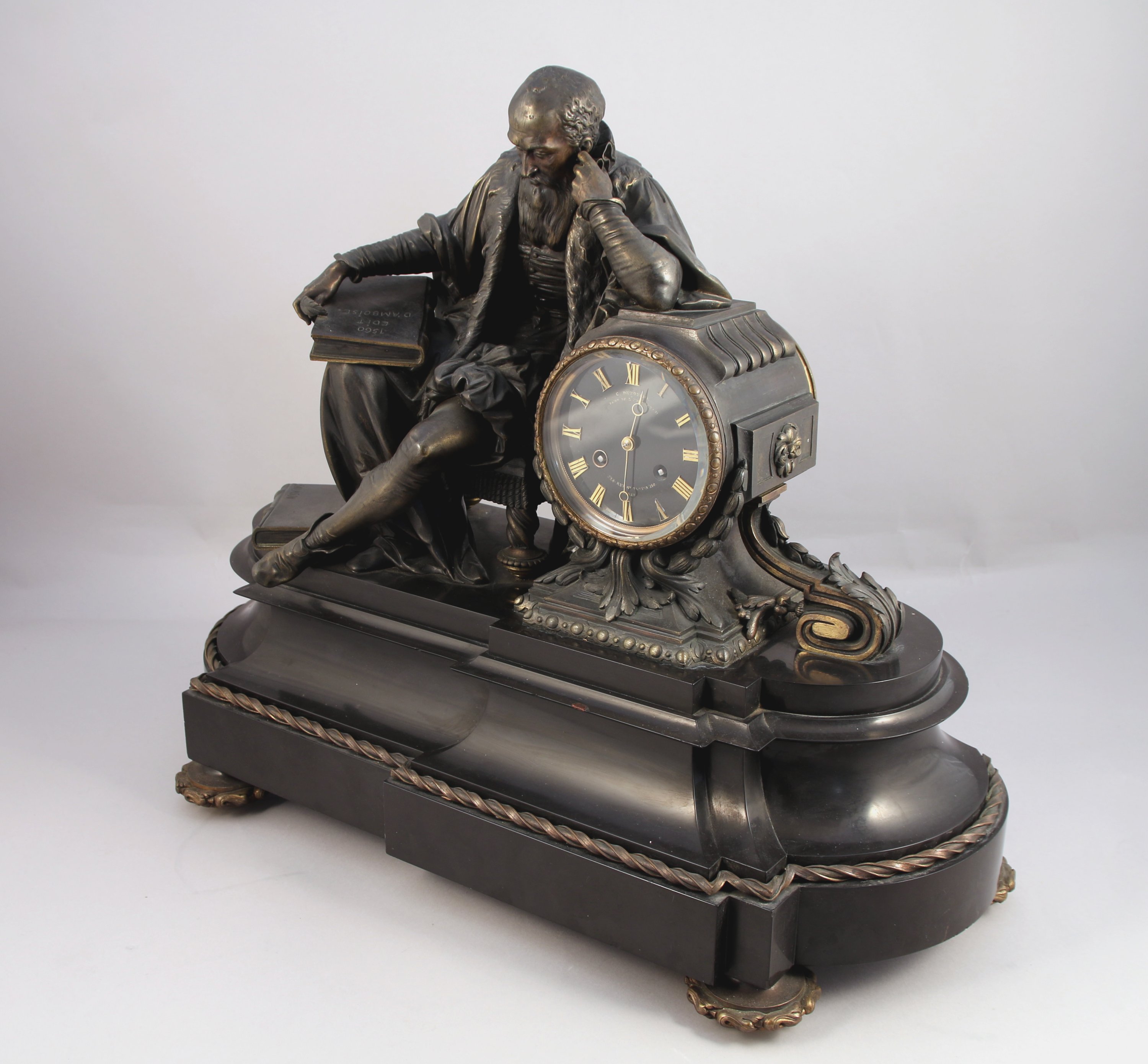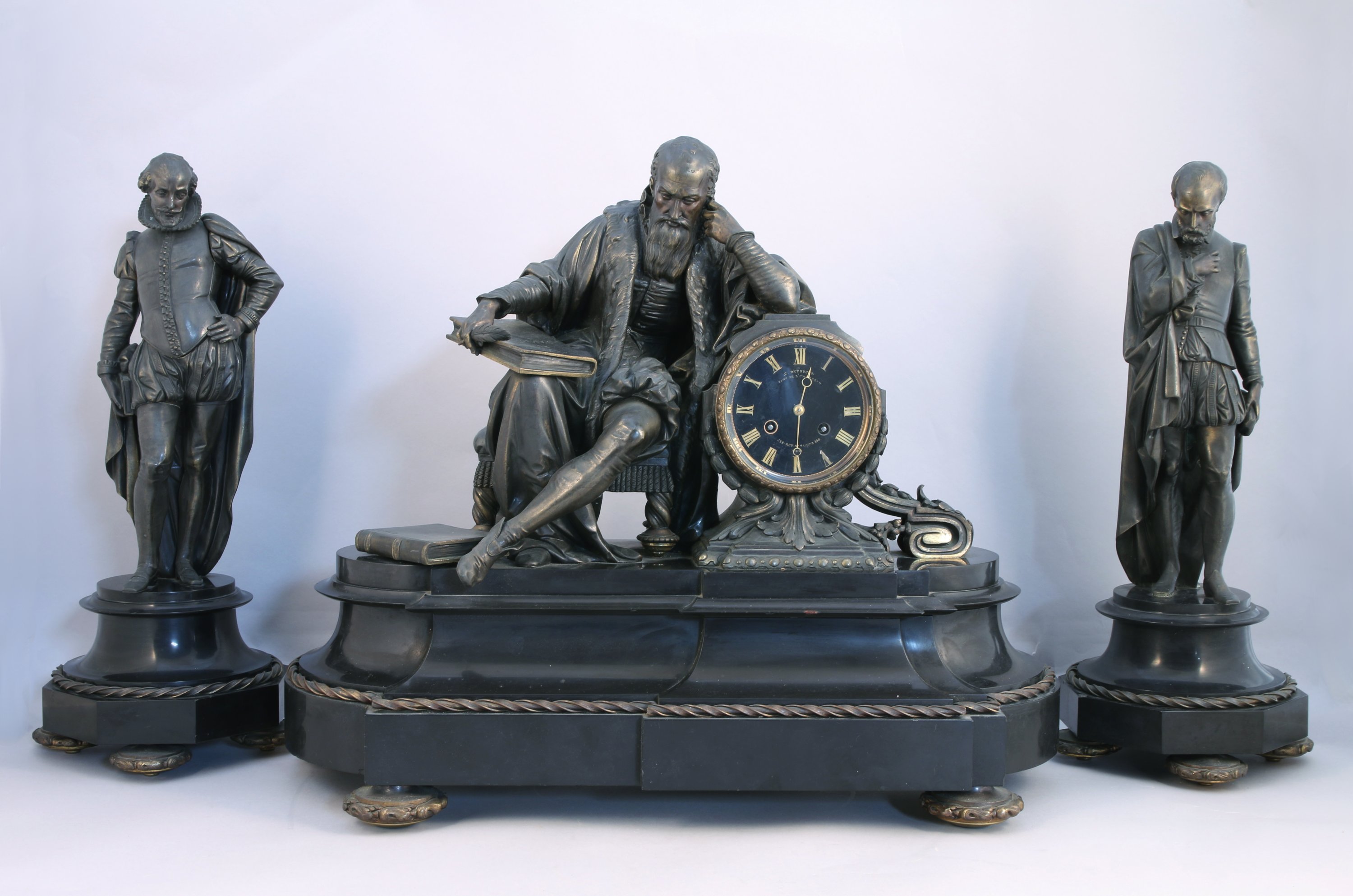 L'élément central dans le lequel s'intègre le cadran signé Destouches, figure Michel de l'Hospital, chancelier du royaume, tenant un livre sur lequel figure l'inscription "Edit d'Amboise 1560". Signé. Les deux autres personnages représentent très probablement Henri Ier de Bourbon, prince de Condé et François Ier de Lorraine, duc de Guise. Base en cavet renversé pour la pendule, et en piédouche pour les personnages, reposant sur quatre pieds galette.