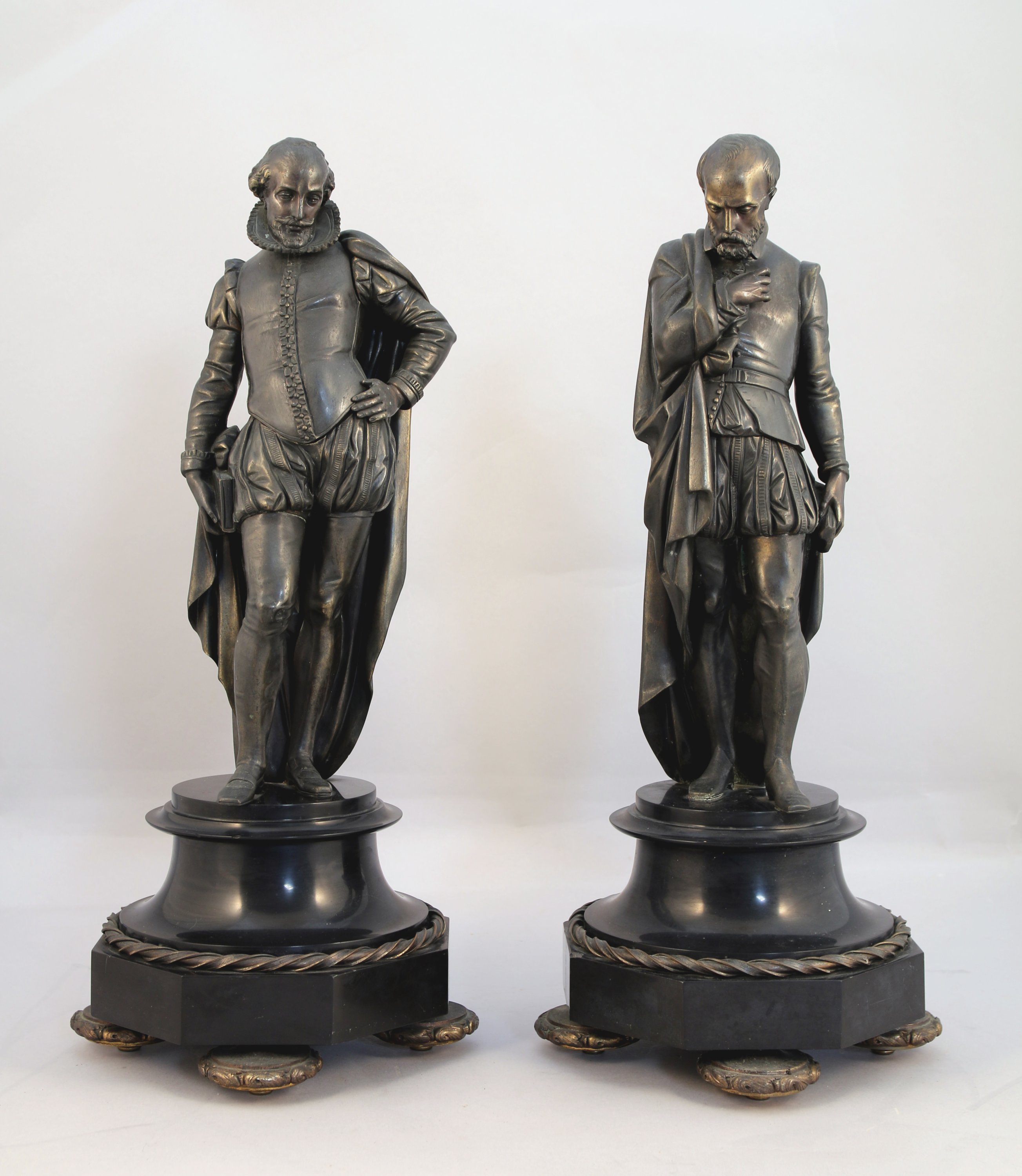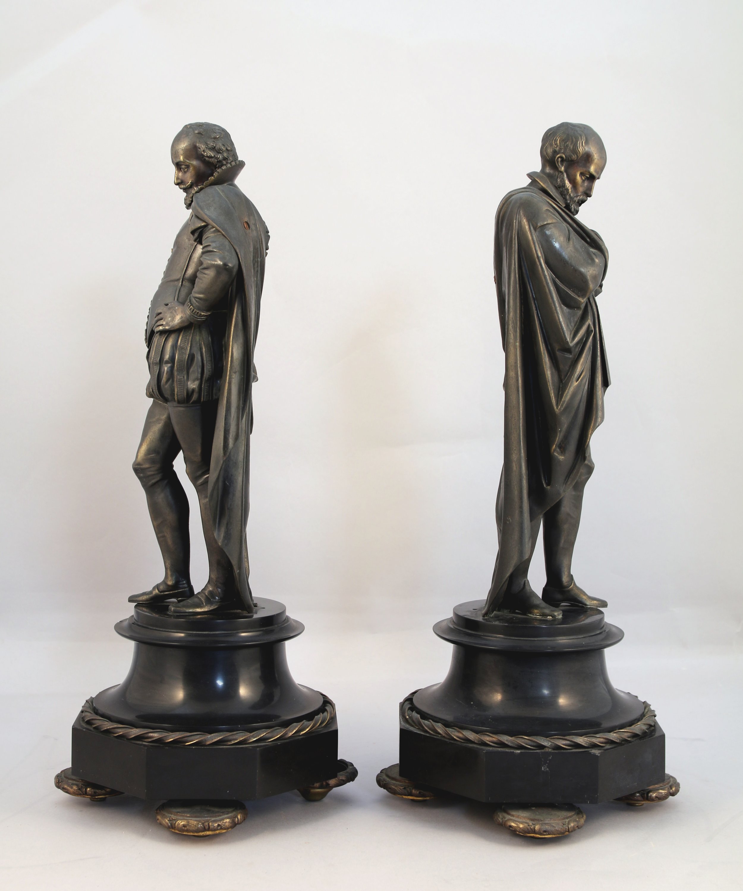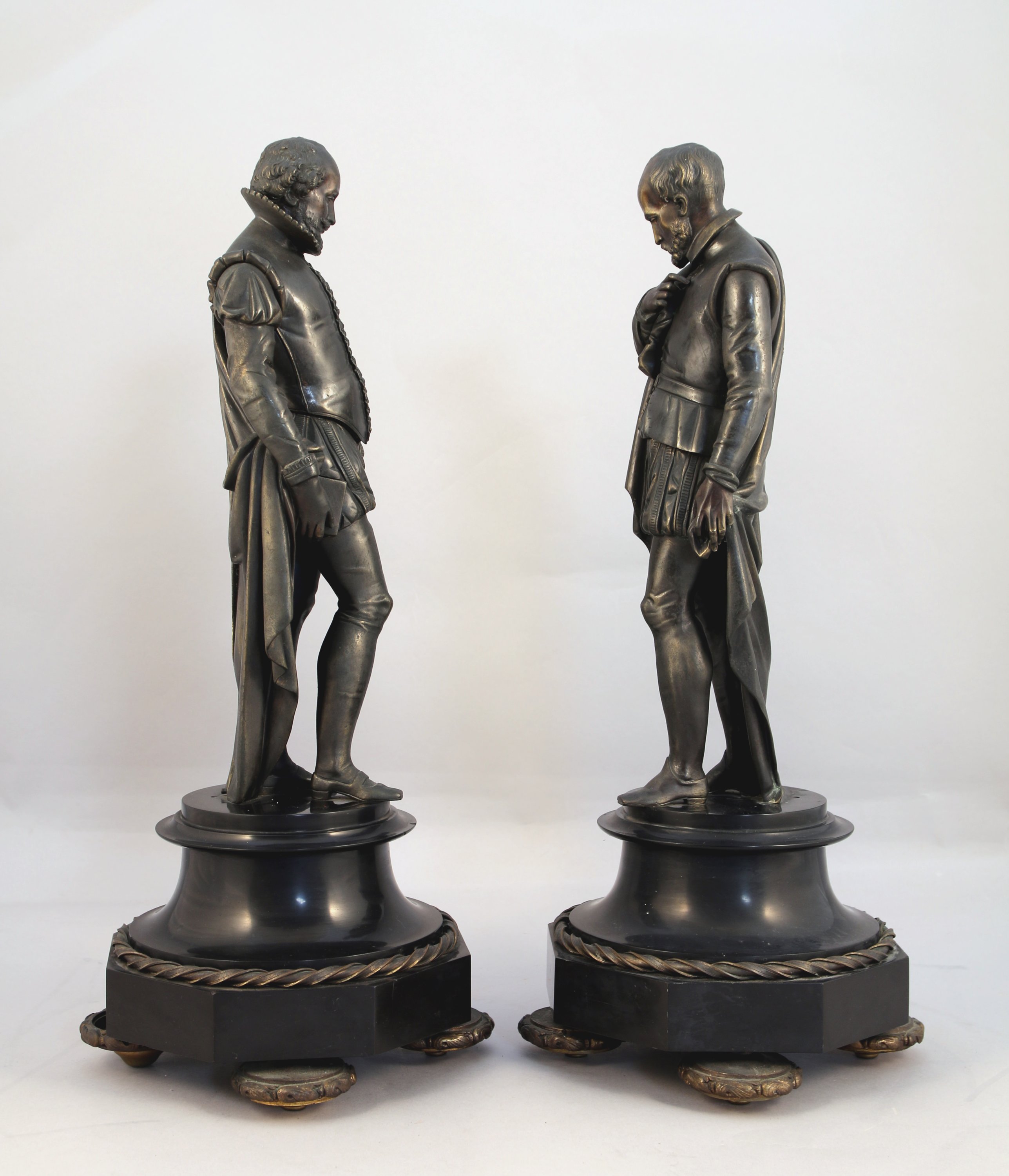 L'élément central dans le lequel s'intègre le cadran signé Destouches, figure Michel de l'Hospital, chancelier du royaume, tenant un livre sur lequel figure l'inscription "Edit d'Amboise 1560". Signé. Les deux autres personnages représentent très probablement Henri Ier de Bourbon, prince de Condé et François Ier de Lorraine, duc de Guise. Base en cavet renversé pour la pendule, et en piédouche pour les personnages, reposant sur quatre pieds galette.