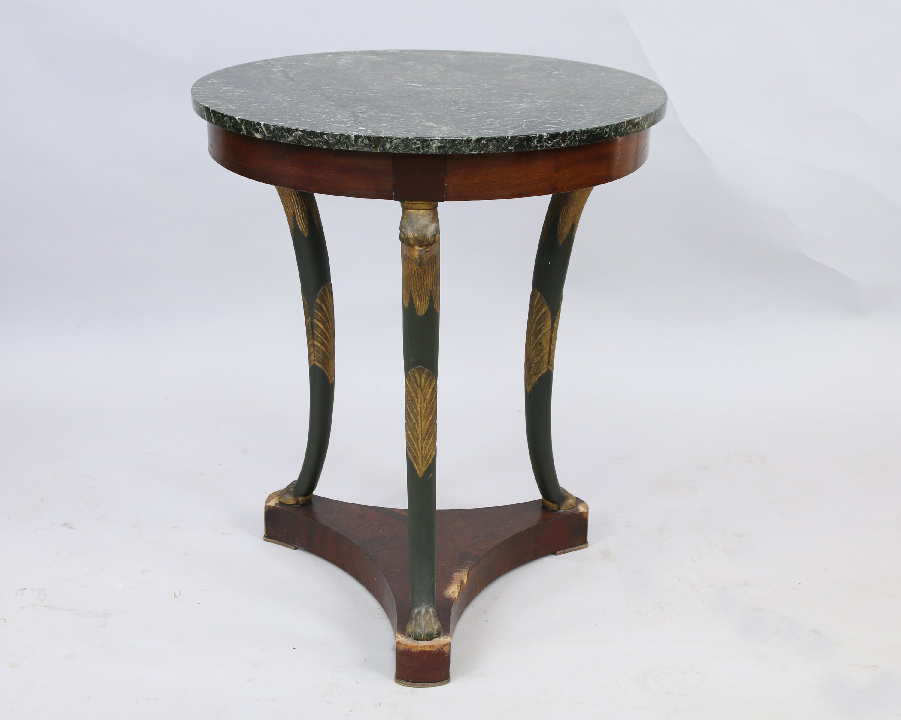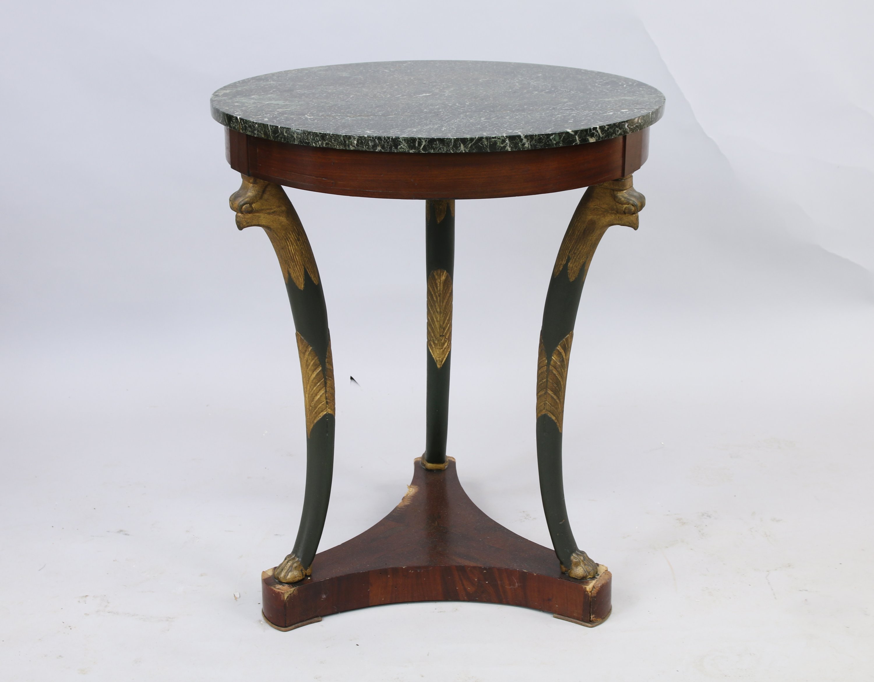 placage d'acajou et bois peint polychrome. Le plateau circulaire reposant sur un piétement tripode aux montants décorés de têtes d'aigle et palmettes. Les pieds réunis par une entretoise. Dessus de marbre gris Sainte Anne.
