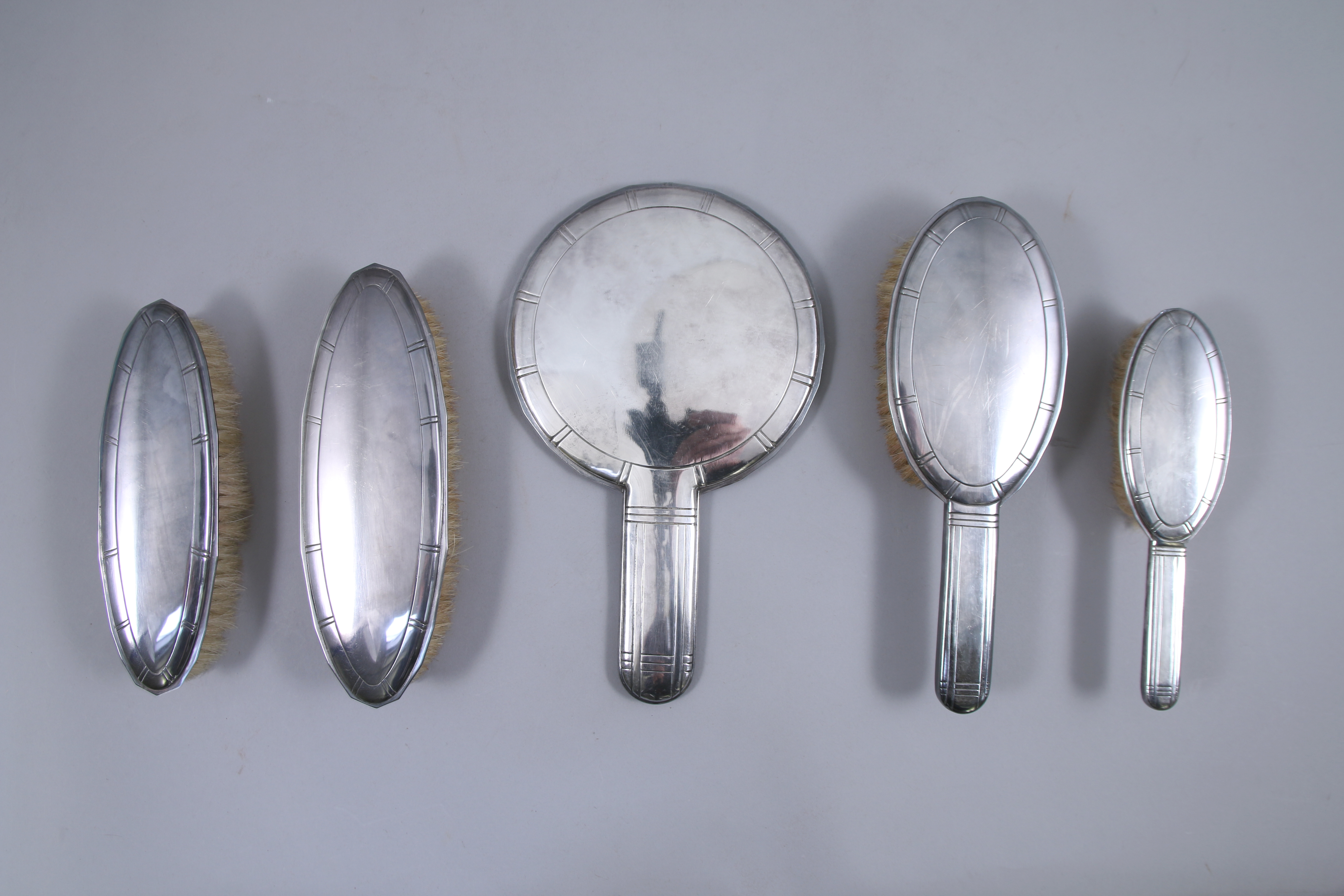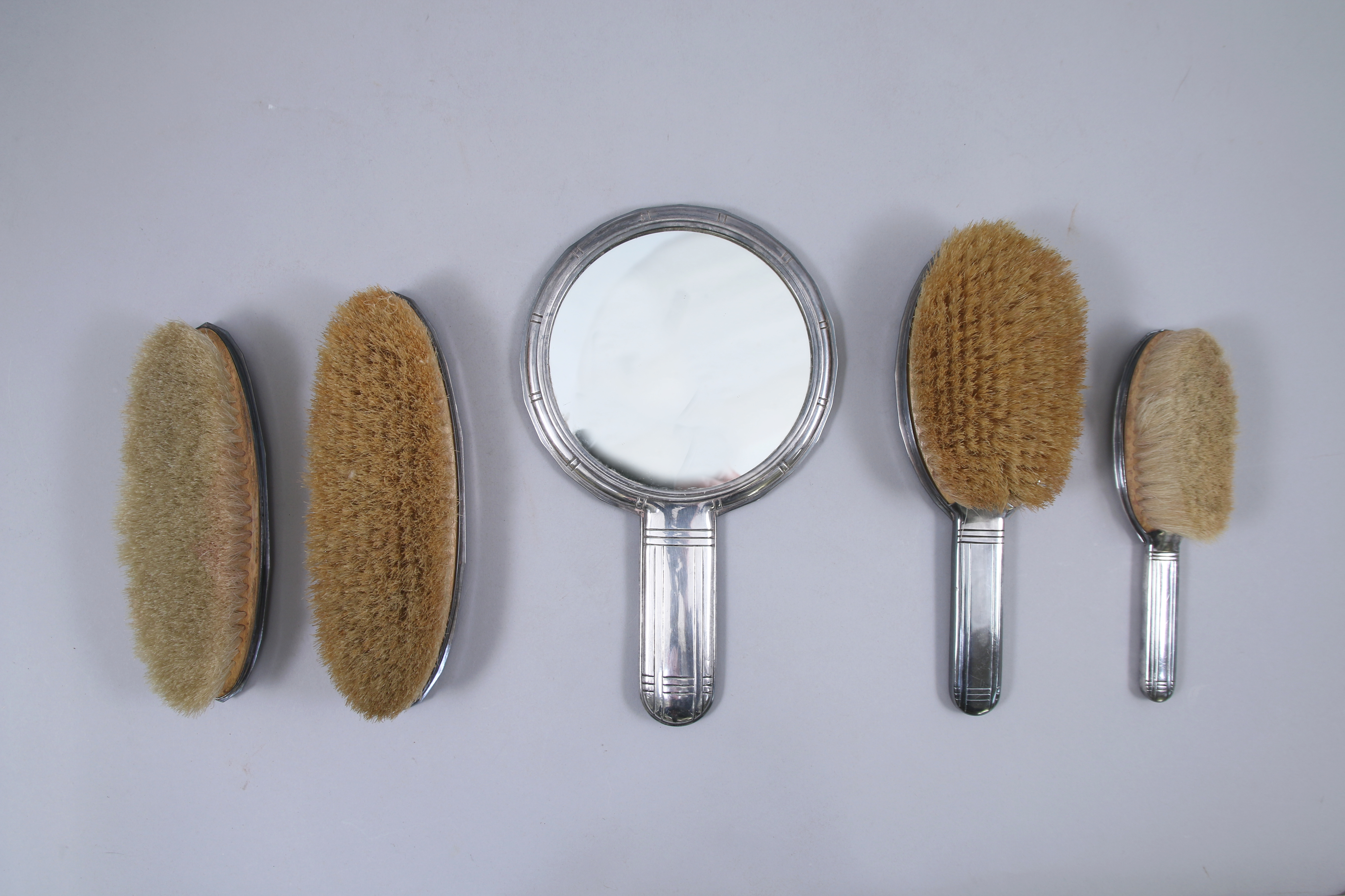 contenant ensemble de quatre BROSSES aux soies de porc, un MIROIR manches et montures en métal argenté ; quatre BROSSES aux soies de porc, un MIROIR, un CHAUSSE-PIED manches en ivoire monogrammé.