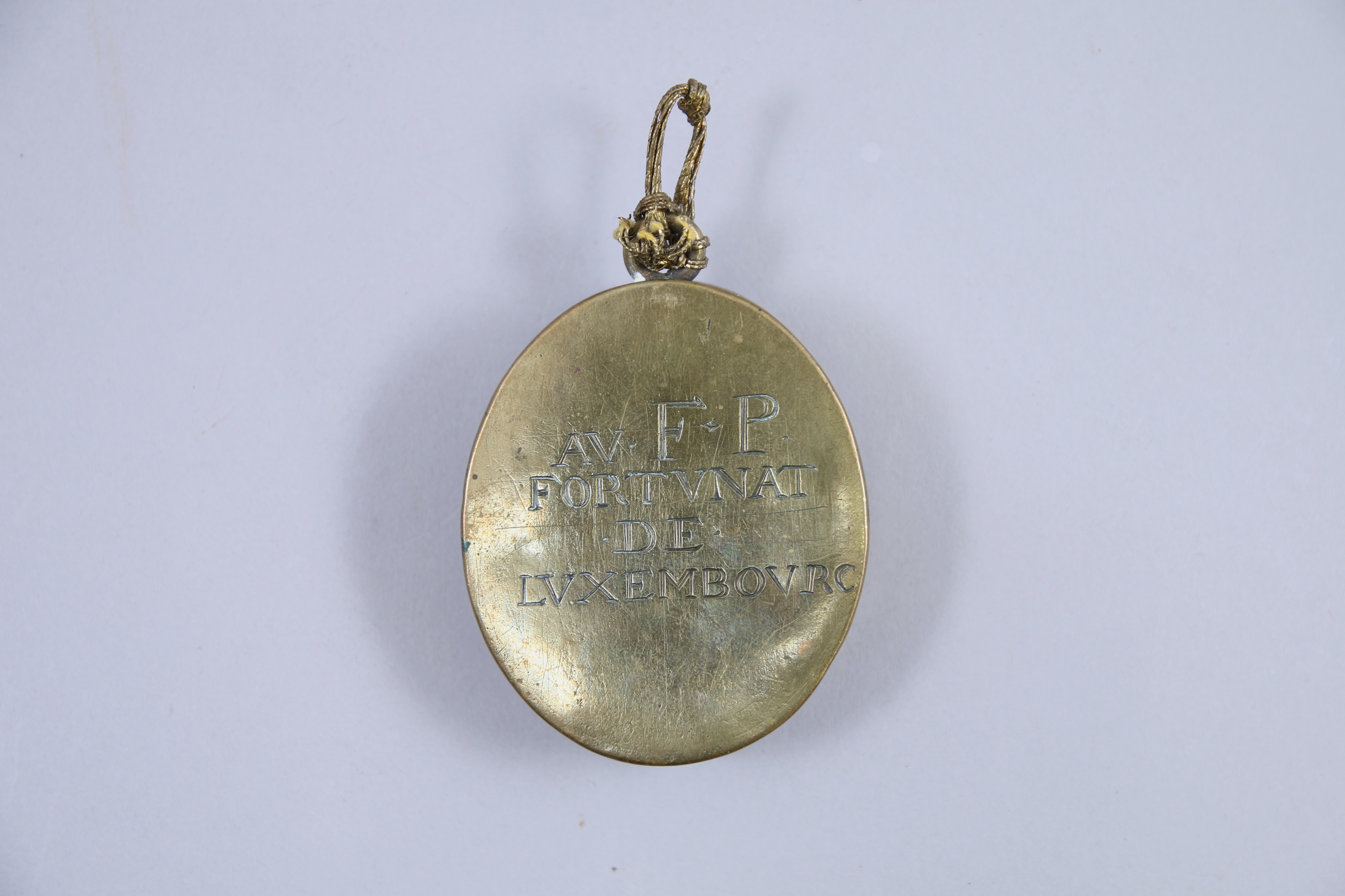 gravé : " AV FP FORTUNAT DE LVXEMBOVRC ", couvercle pivotant gravé d'un crucifix.