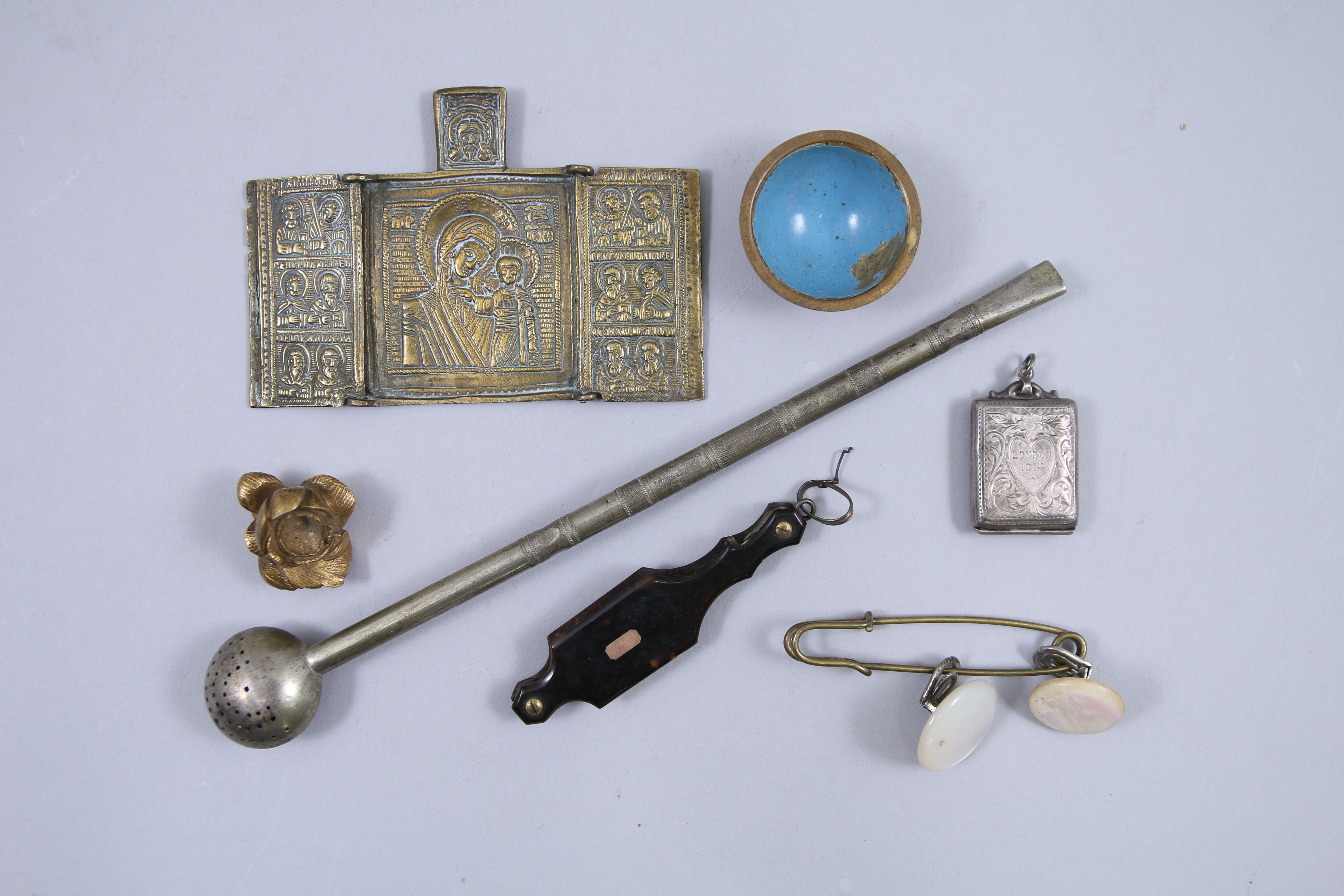 JOINTS : icône portative triptyque en bronze, 2 boutons de col en nacre, monture écaille petit lorgnon (absent), fleurette en bronze doré, infuseur argenté, breloque argenté porte-photos.
