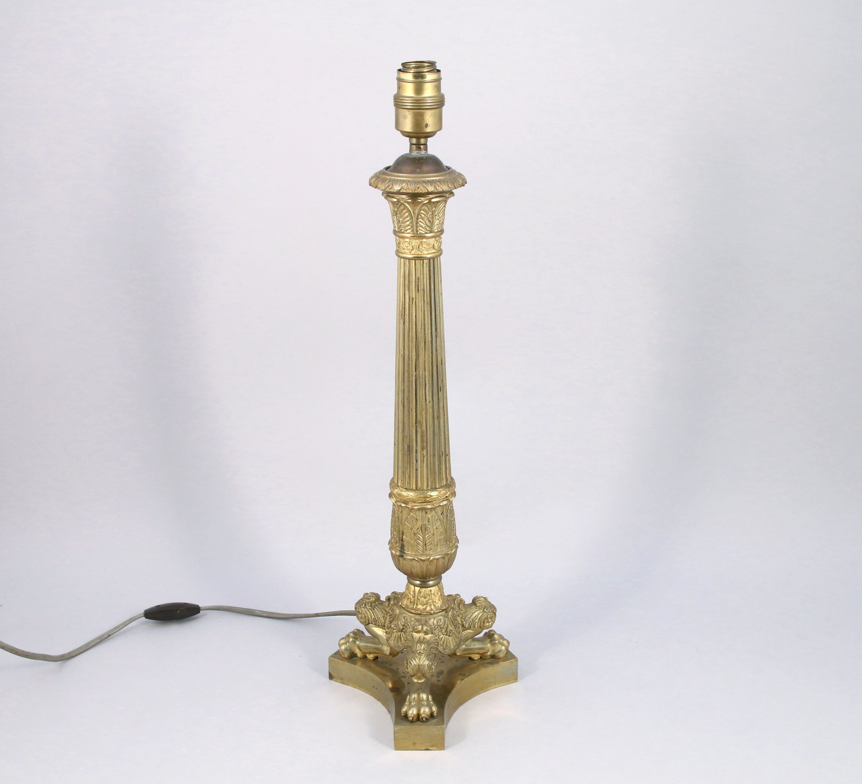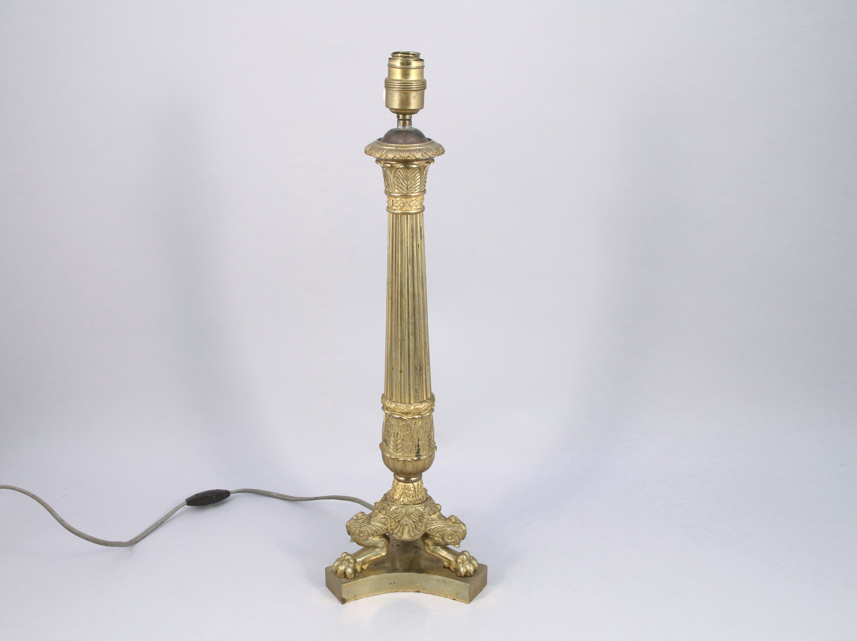 en bronze doré, le chapiteau feuillagé, le fût à colonne cannelée à décor de feuilles d'eaux posant sur un piètement tripode à palmettes se terminant par des jarrets à griffes