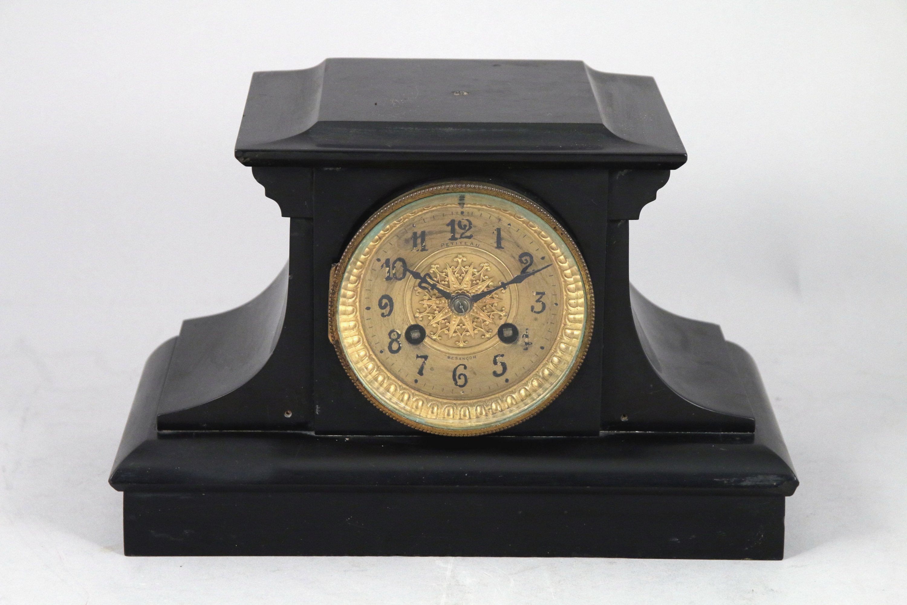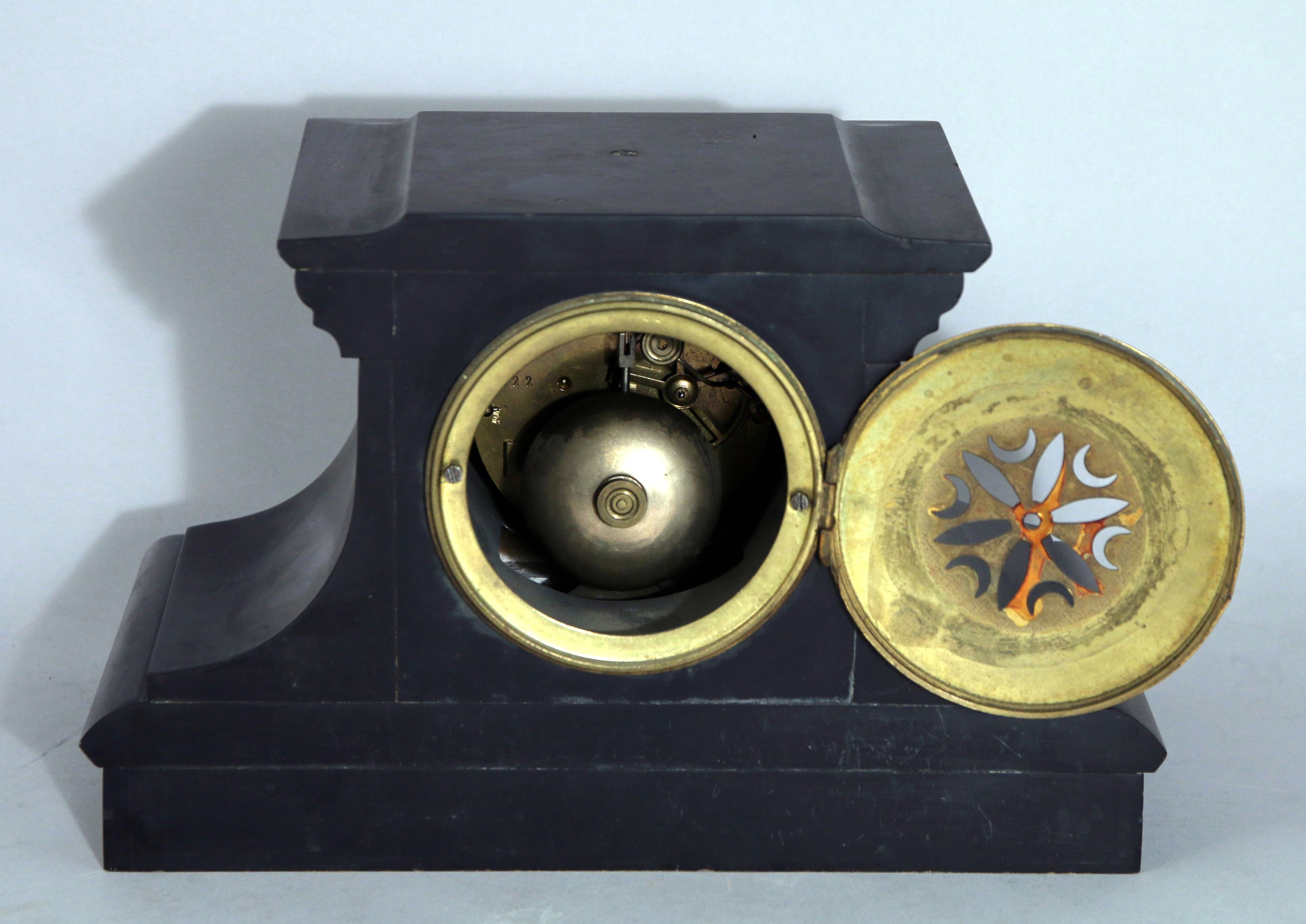 en marbre noir mouluré. Cadran circulaire décoré au centre d'une étoile et d'entrelacs affichant les heures en chiffres arabes, chemin de fer pour les minutes. marqué "PETITEAU BESANCON".