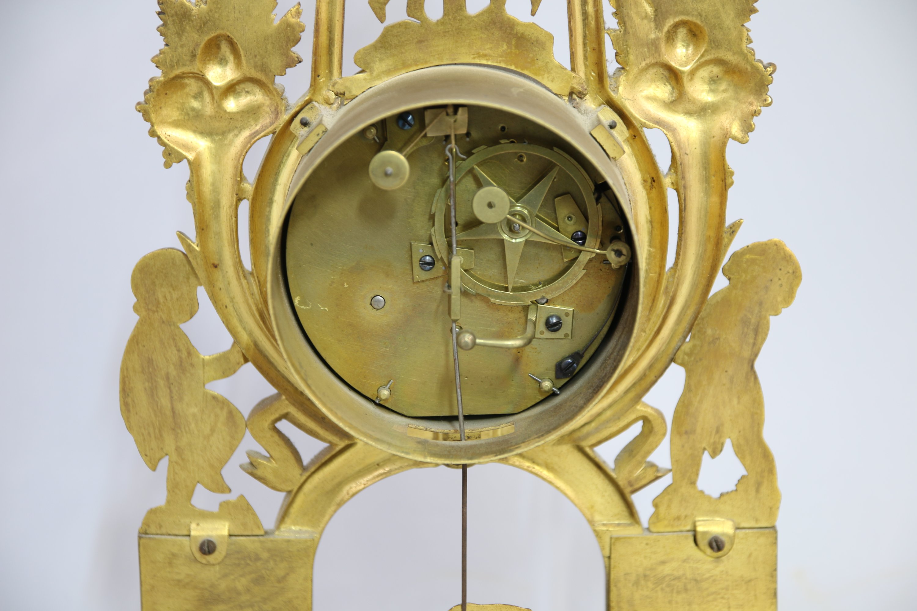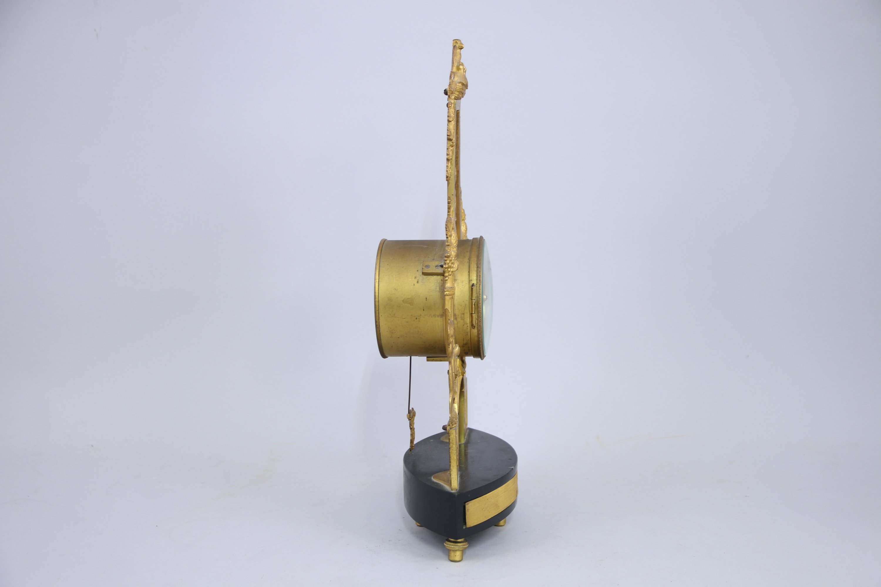 en bronze doré et patiné. Le mouvement flanqué de deux putti soutenant des cornes d'abondance et surmonté de deux putti cueillant les fruits d'un pommier. Ils sont sommés d'un aigle aux ailes déployées défendant son nid. Le tout repose sur une base navette en marbre noir ornée d'une plaque de bronze striée.