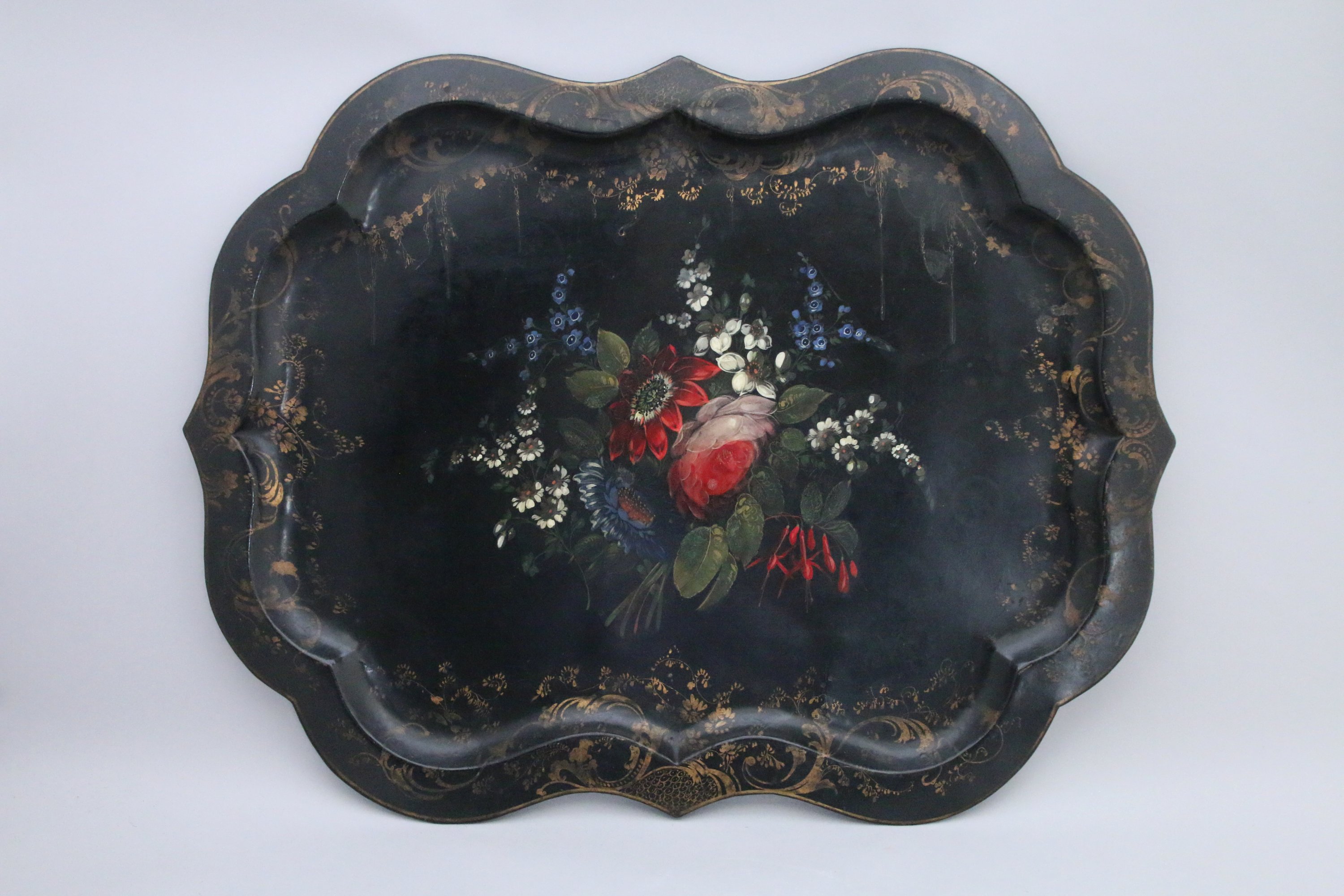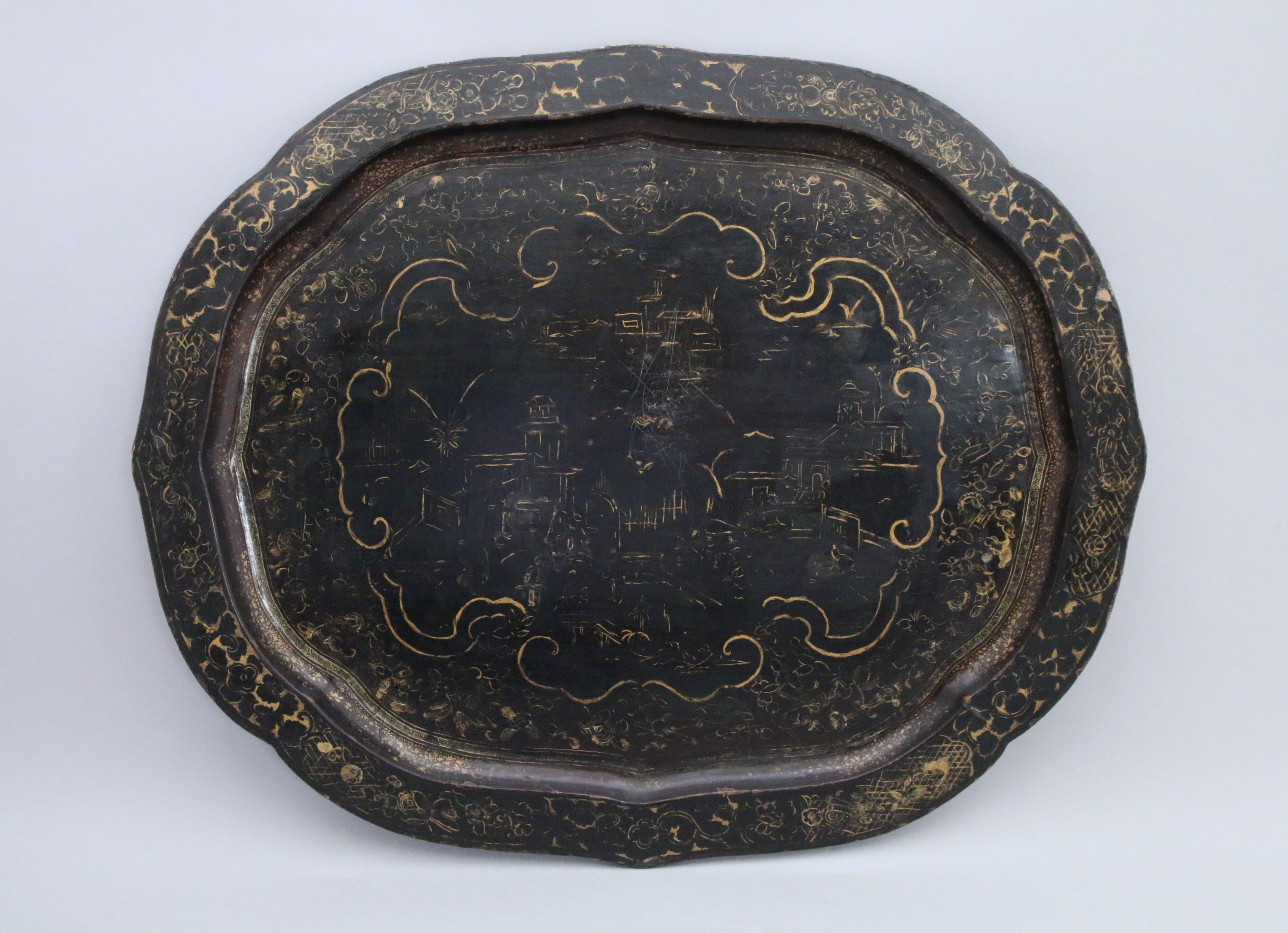 Le premier en tôle peinte aux motifs floraux sur fond noir, le second en carton mâché au motif de temples asiatiques sur fond noir.