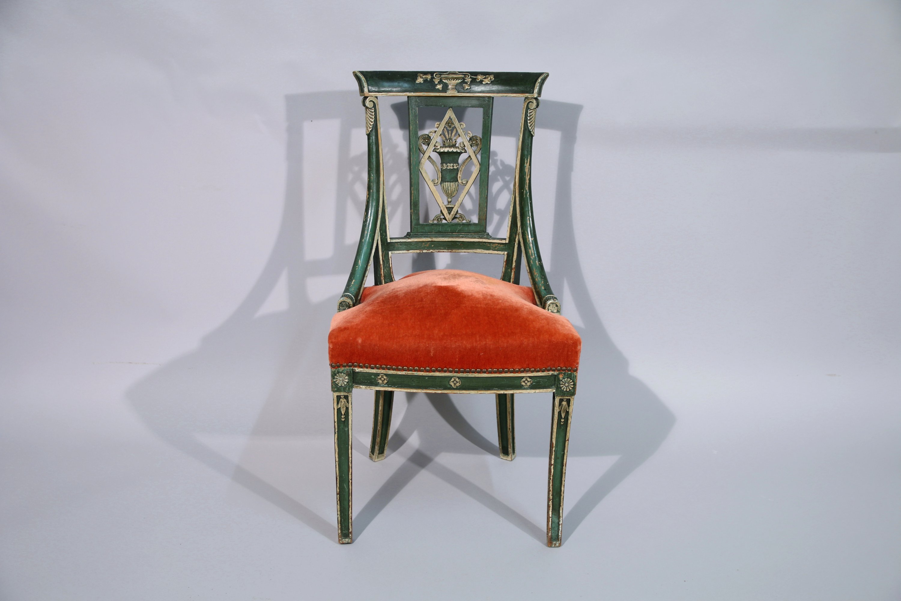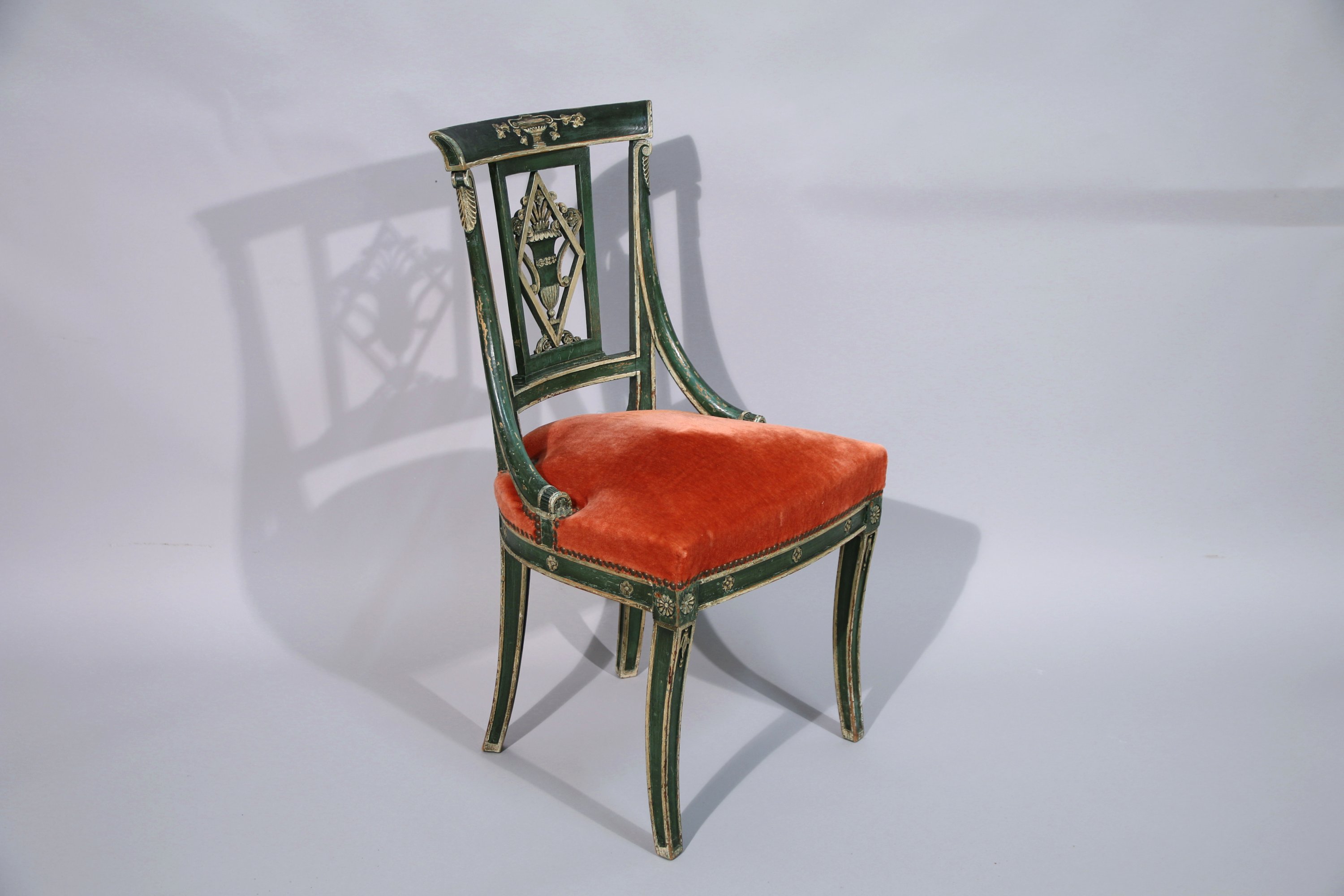 mouluré et teinté vert. Décor de fleurettes, le dossier ajouré d'un vase fleuri.