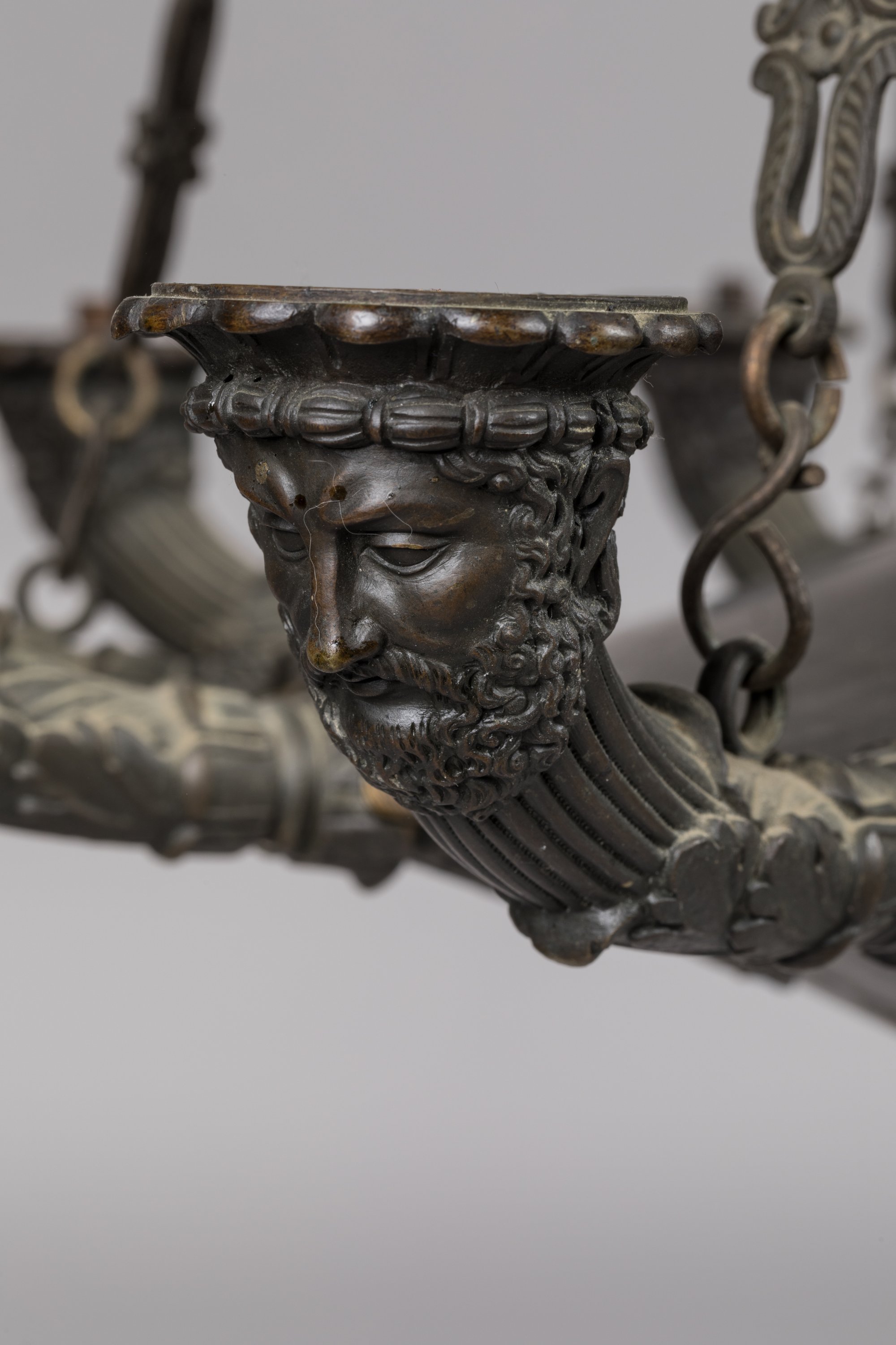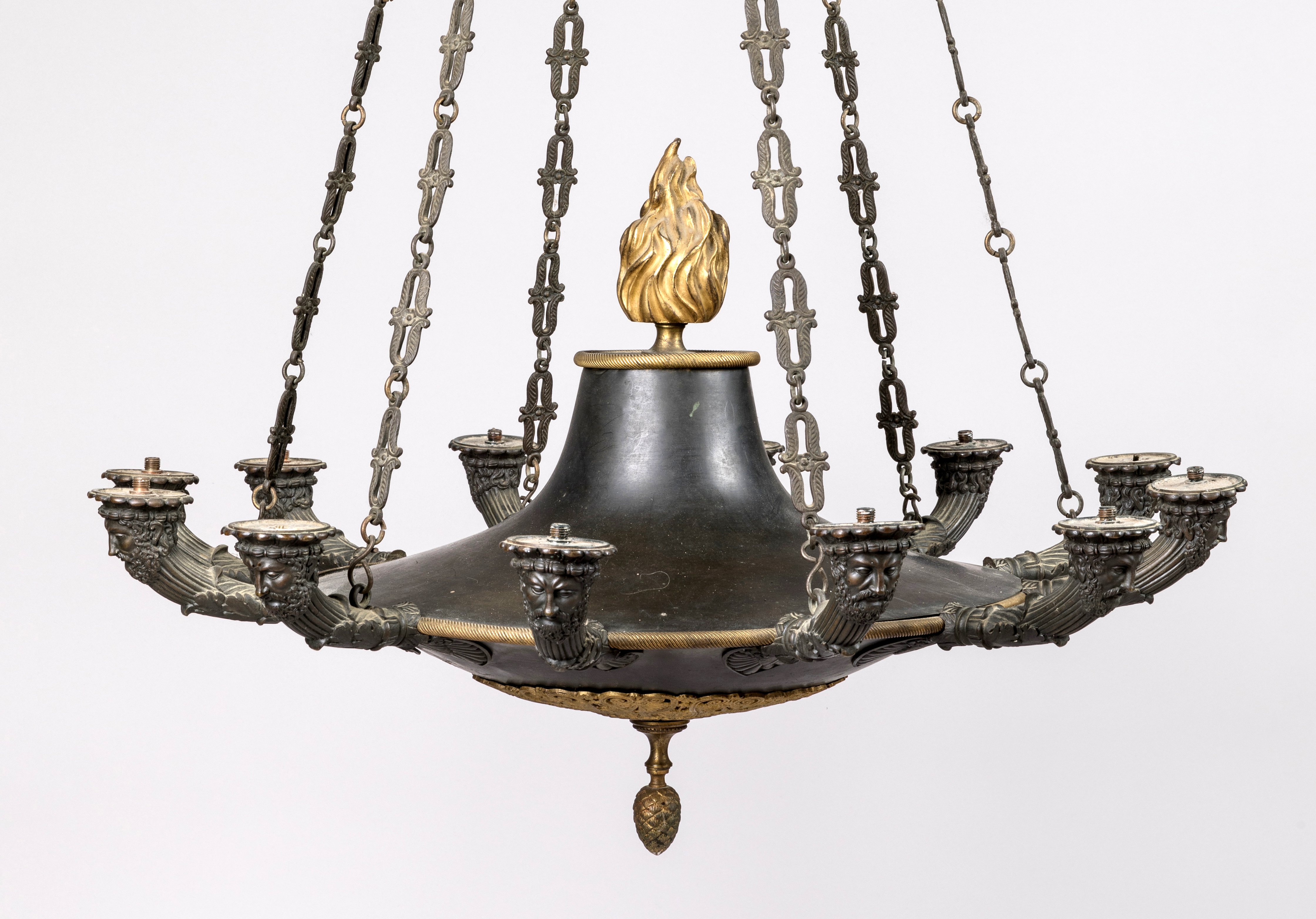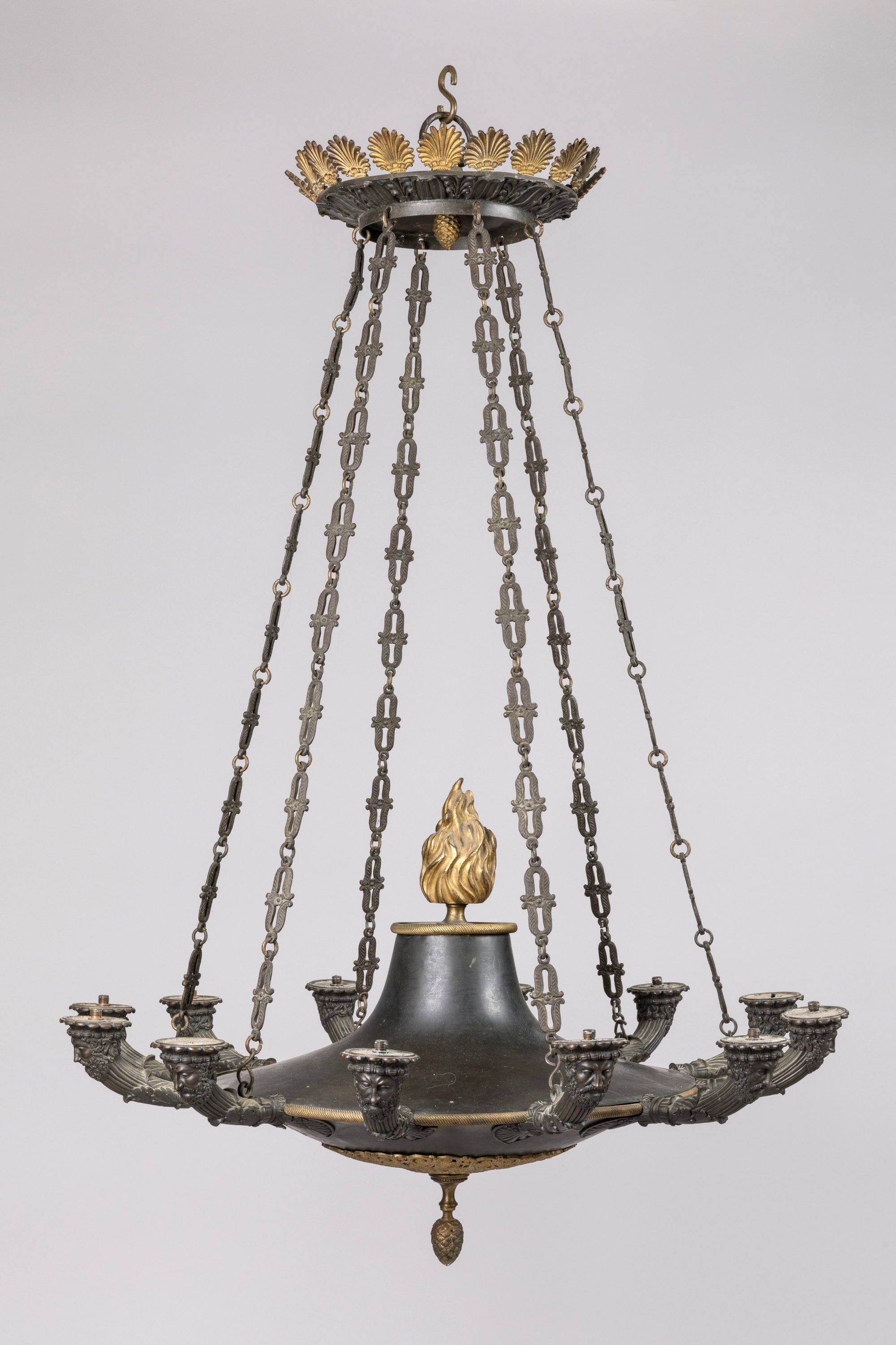 en tôle, bronze doré, patiné et ciselé à douze bras de lumières. La petite couronne retenant six chaînes est coiffée de palmettes et terminée par une pomme de pin. La partie supérieure coiffée d'une flamme, chacun des bras de lumières terminé par des têtes d'hommes barbues finies de feuilles d'eau, le fretel orné d'une pomme de pin retenue sur une terrasse entourée de rinceaux.