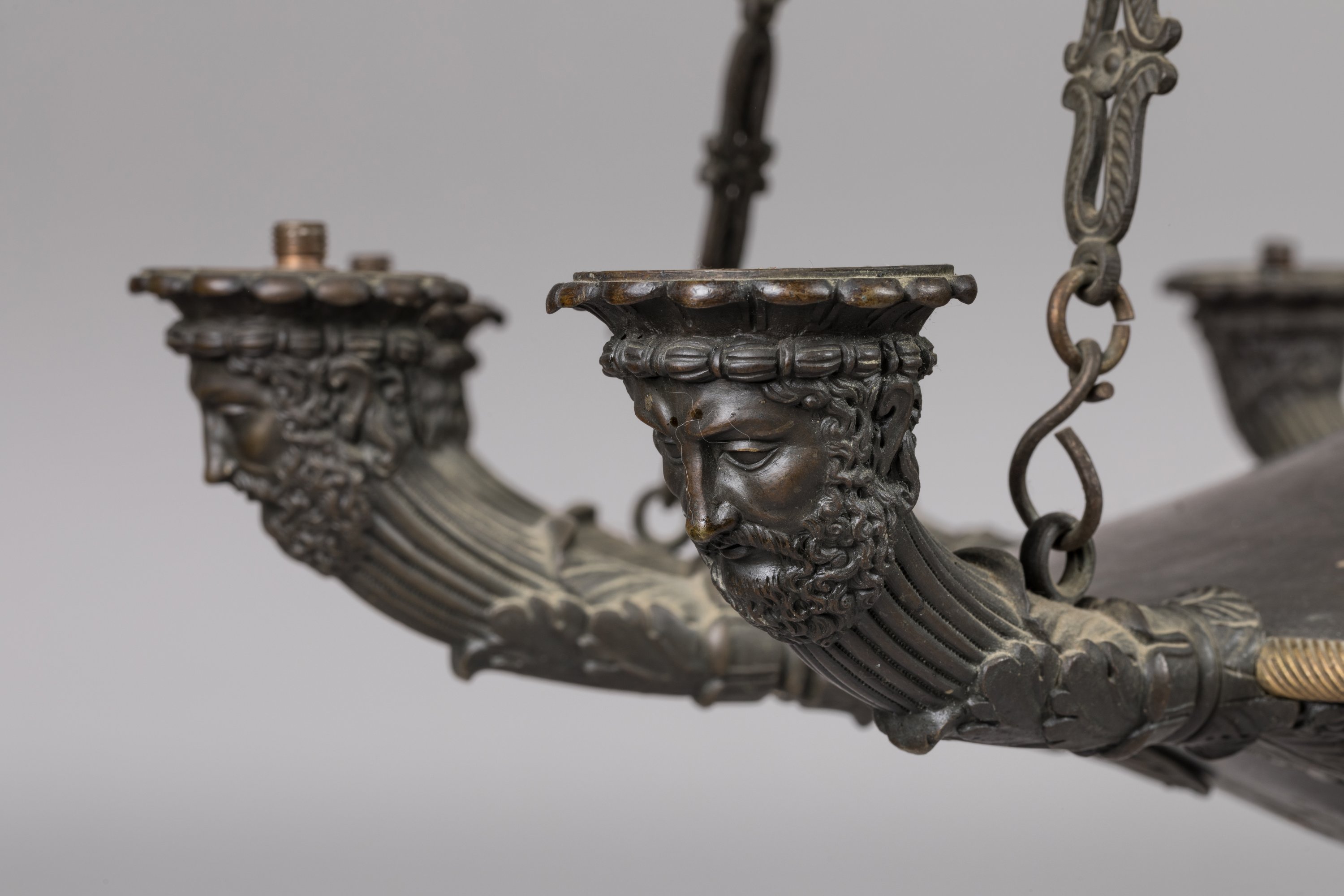 Ces modèles de lustre reprennent la forme d'une lampe à huile antique. Ils sont ornés par des motifs tels que cols de cygne, têtes d'aigle, trompes et surtout têtes d'homme. Ce dernier motif est récurrent pour l'ornementation des lustres sous l'Empire et la Restauration. Un dessin conservé au Victoria and Albert Museum inscrit dans un volume relié avec d'autres modèles destinés au magasin Morant & Co de Londres montre un lustre offrant un décor et une composition très comparable. Le traitement des bras de lumière ou la forme du fretel inscrit sur une terrasse en bronze doré ornée de rinceaux, sont très similaires à celui-ci (BOURNE, Jonathan, BRETT, Vanessa, L'art du luminaire, Paris, Flammarion, 1992, p. 164), tout comme pour celui reproduit dans l'ouvrage de référence sur les arts décoratifs de l'Empire et de la Restauration (CHADENET, Sylvie, Les styles Empire & Restauration, s.l, Basch et Cie, p. 76).