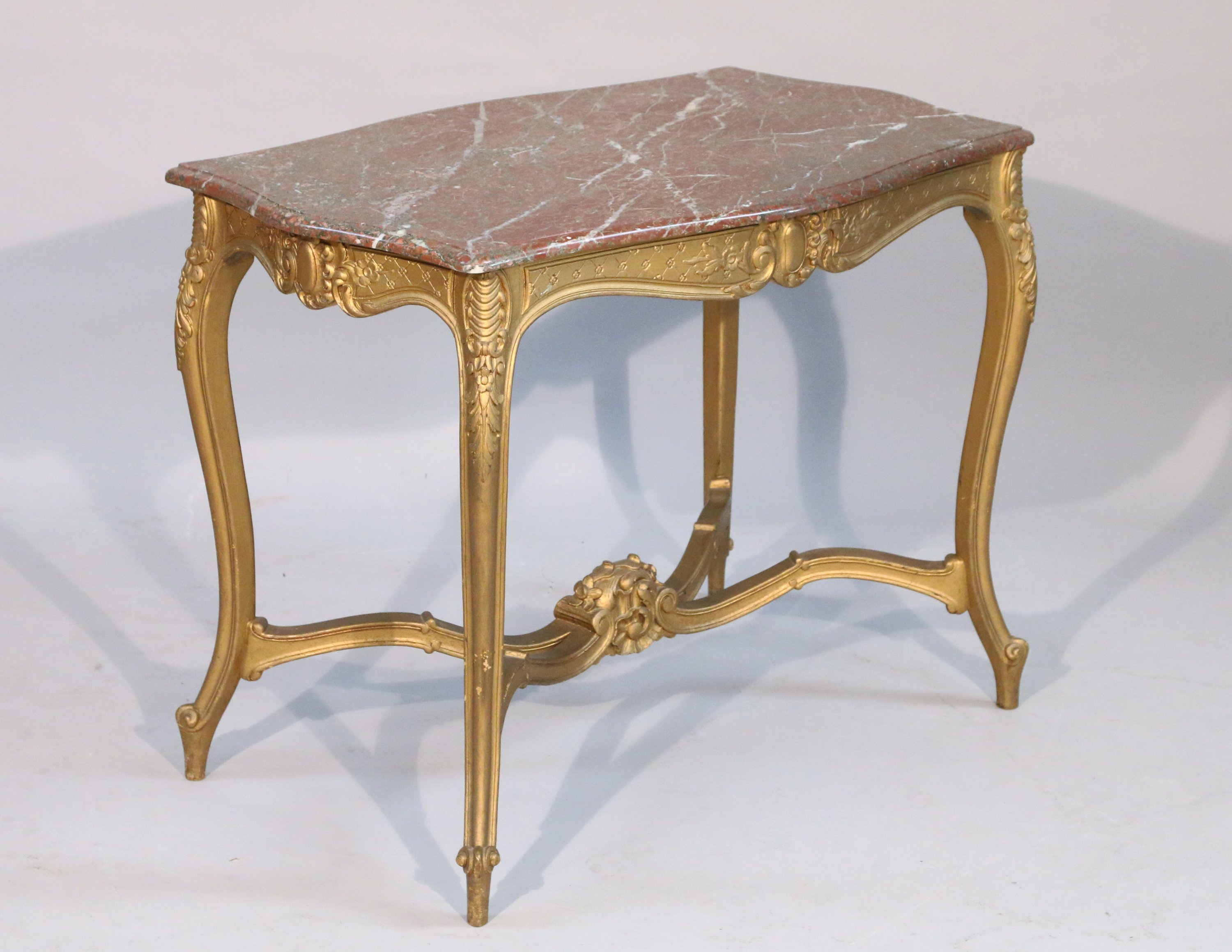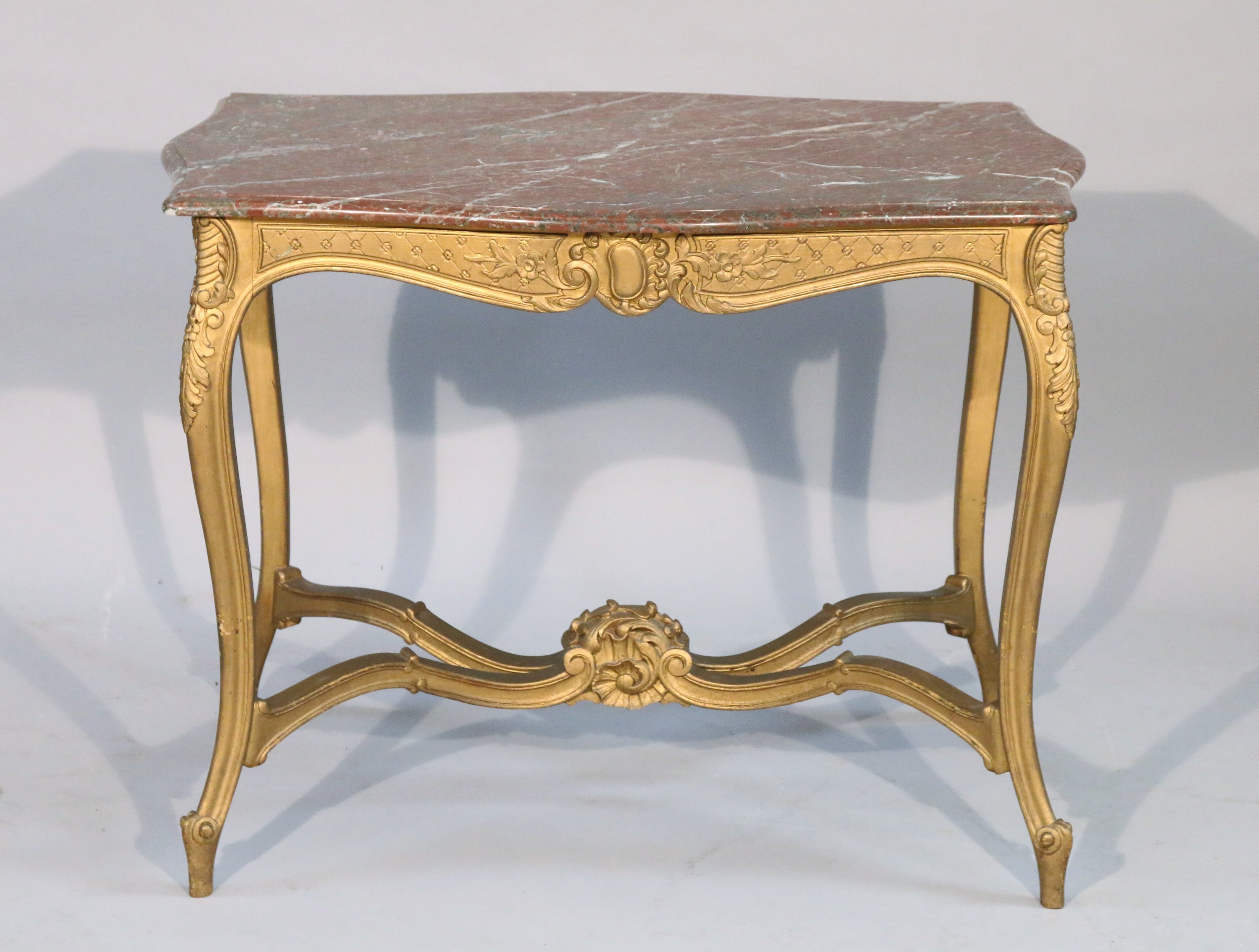 la ceinture chantournée à décor de médaillon central entouré de rinceaux, le piétement cambré réunis par une entretoise. Dessus de marbre rouge veiné.