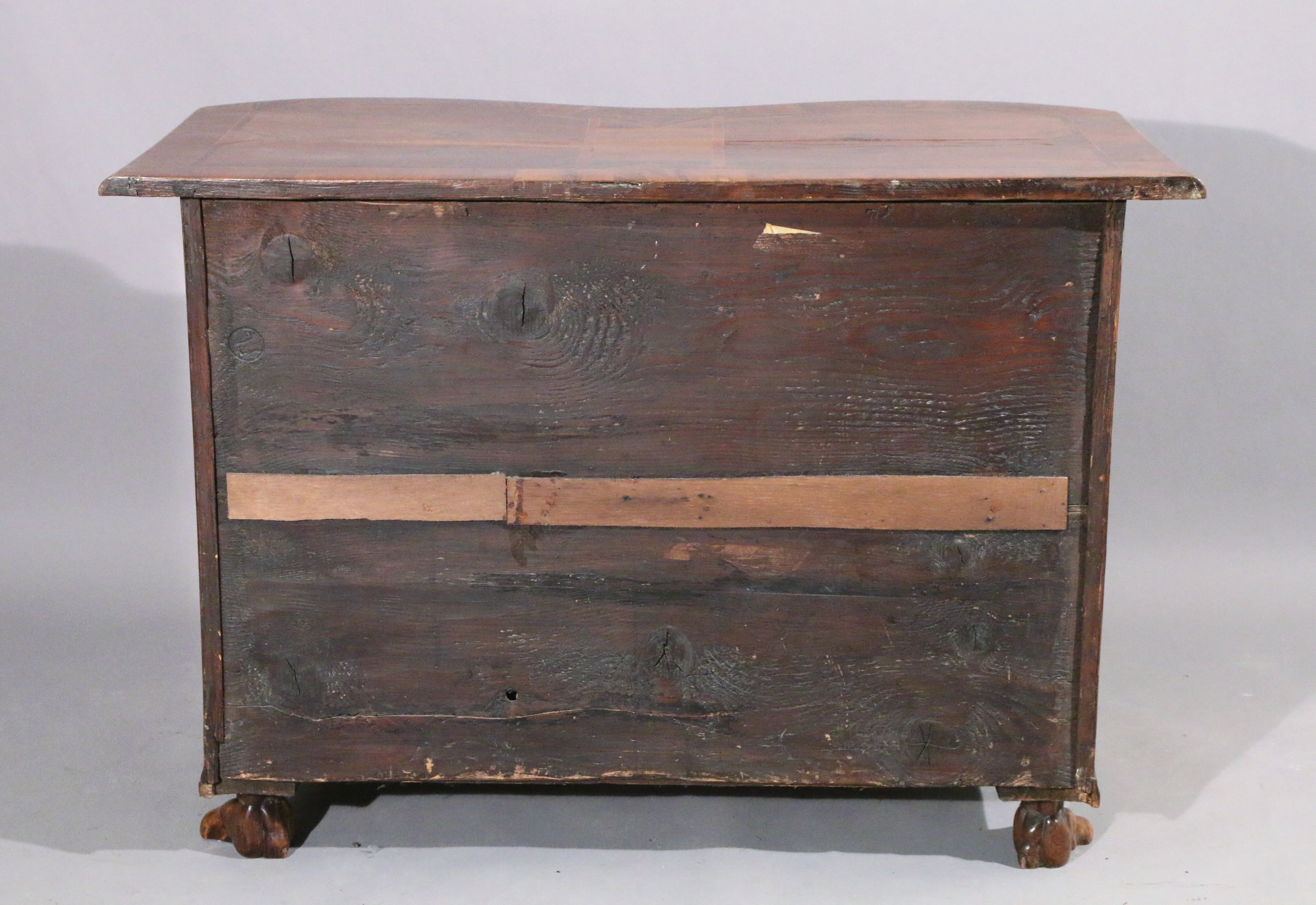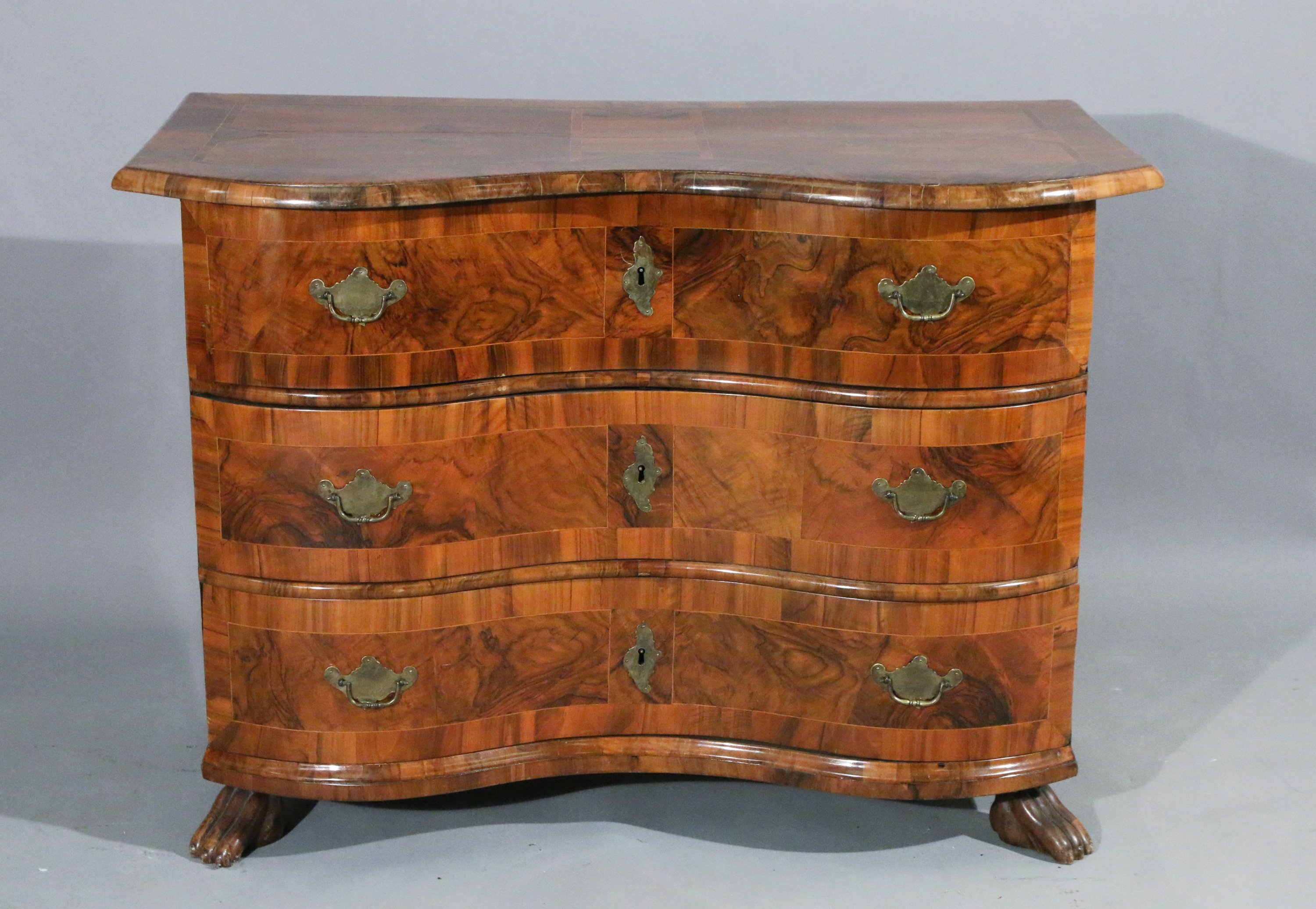 en noyer et placage de noyer, la façade en arbalète ouvrant par trois tiroirs à décor de frisage et encadrements de filets de bois clair. Plateau à décor marqueté à motifs géométrique et double filets. Quatre pieds griffes. Poignées et entrées de serrures en laiton.