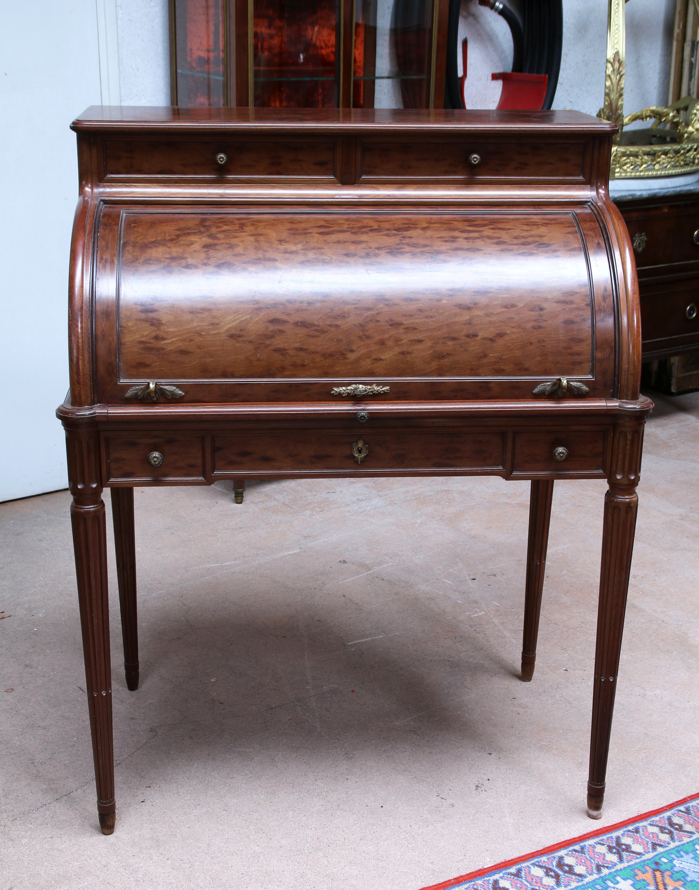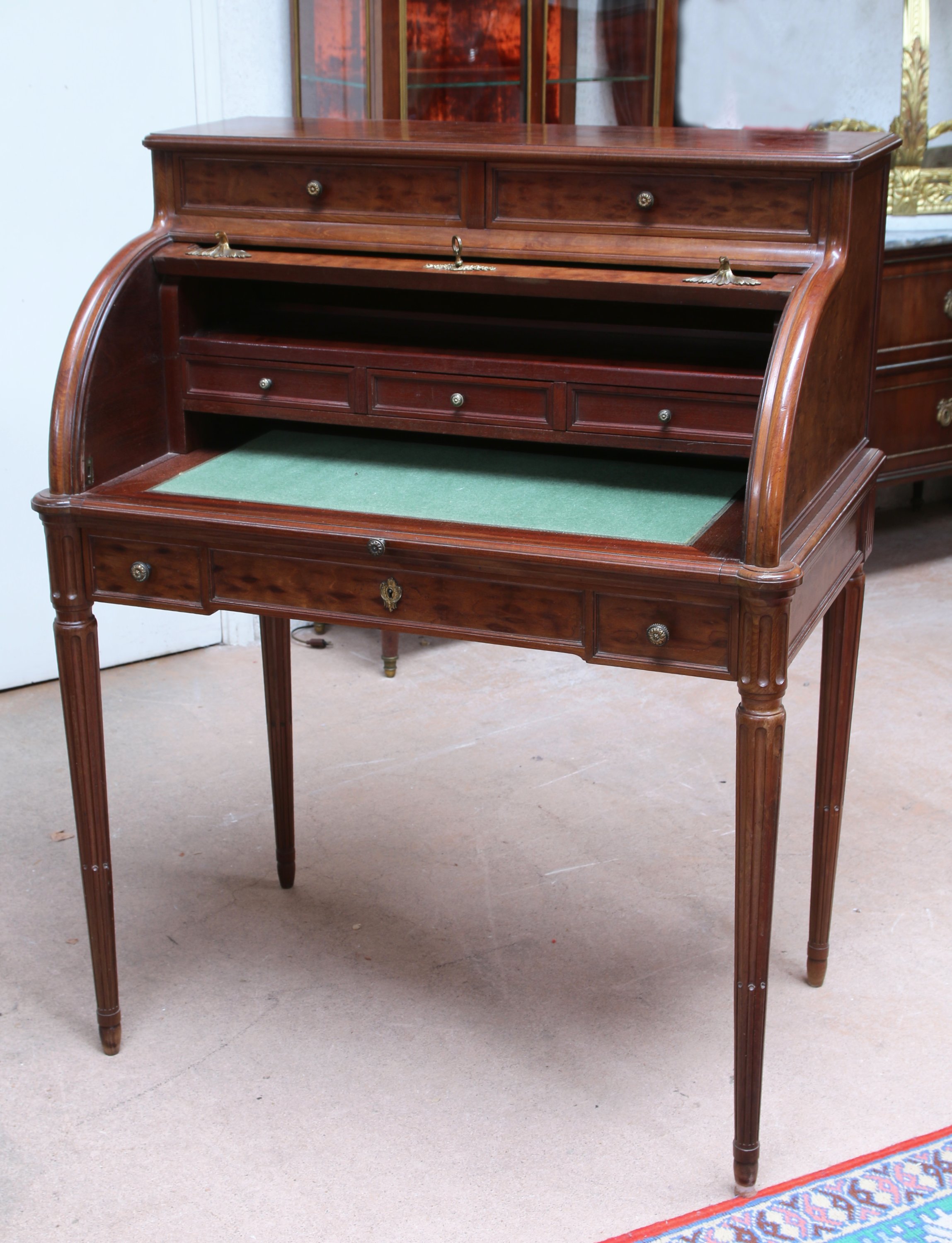 en acajou et placage d'acajou moucheté. Il ouvre par un tiroir en ceinture, deux dans le gradin et par un cylindre découvrant un intérieur compartimenté. Il repose sur quatre pieds fuselés, cannelés et rudentés.