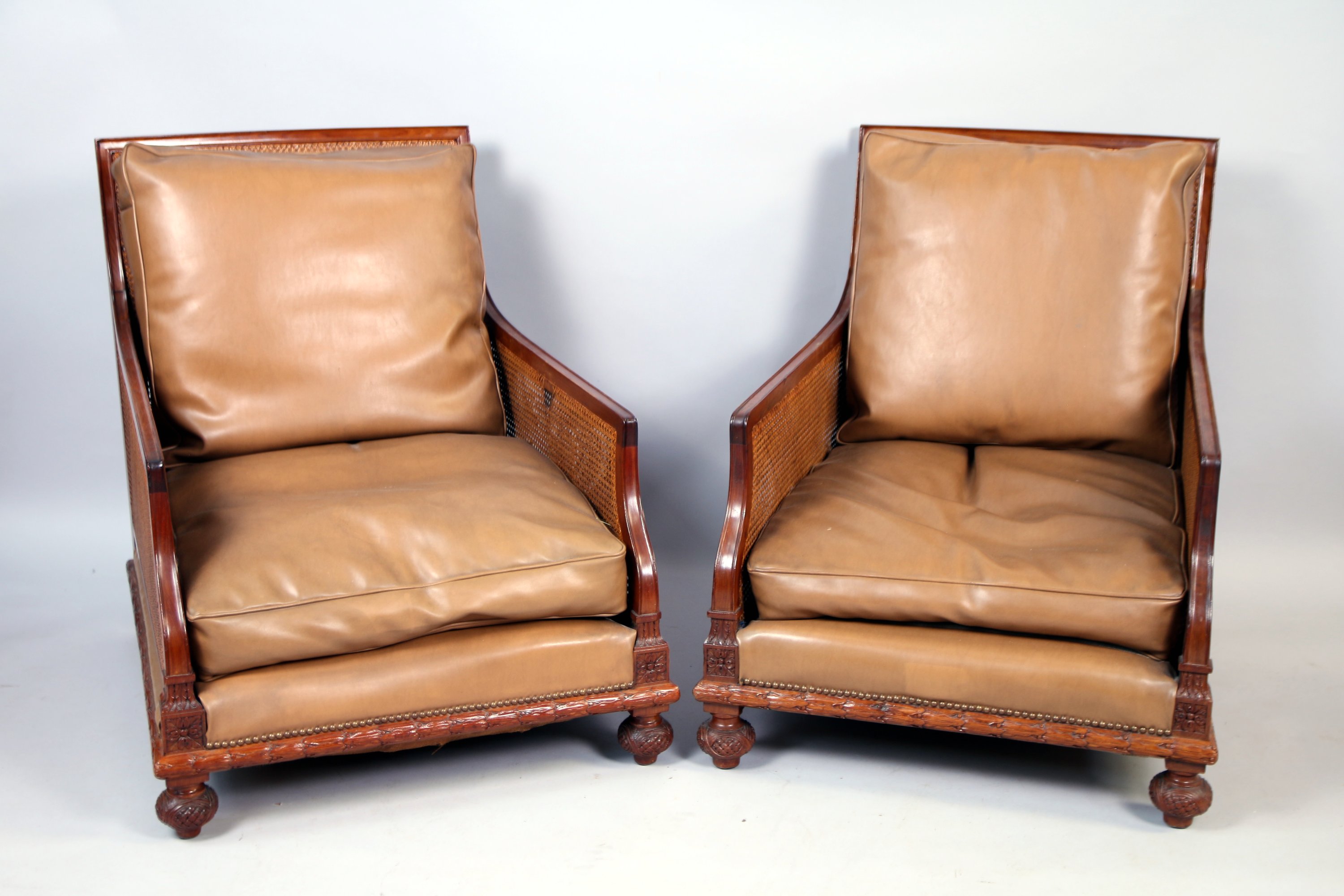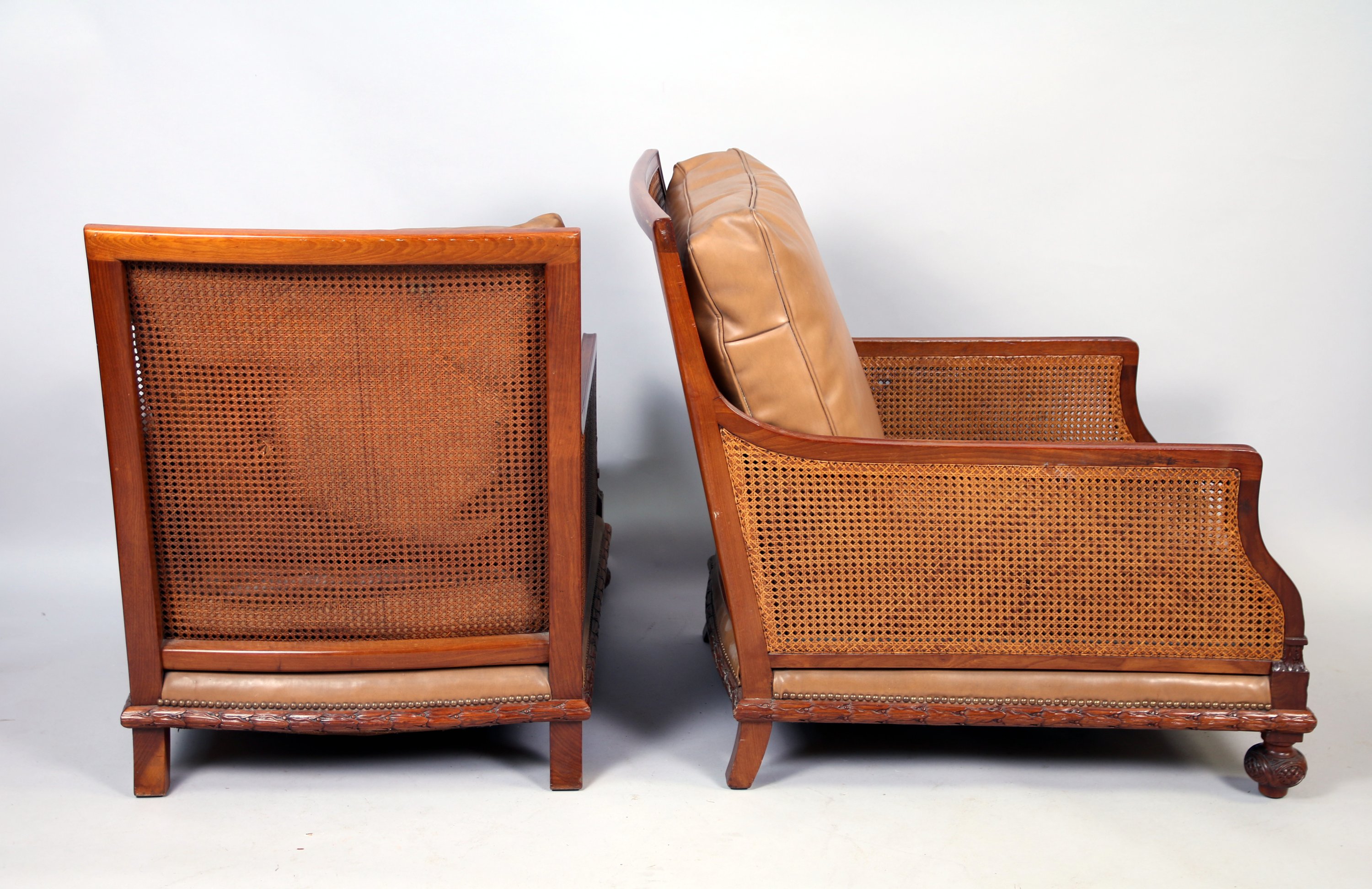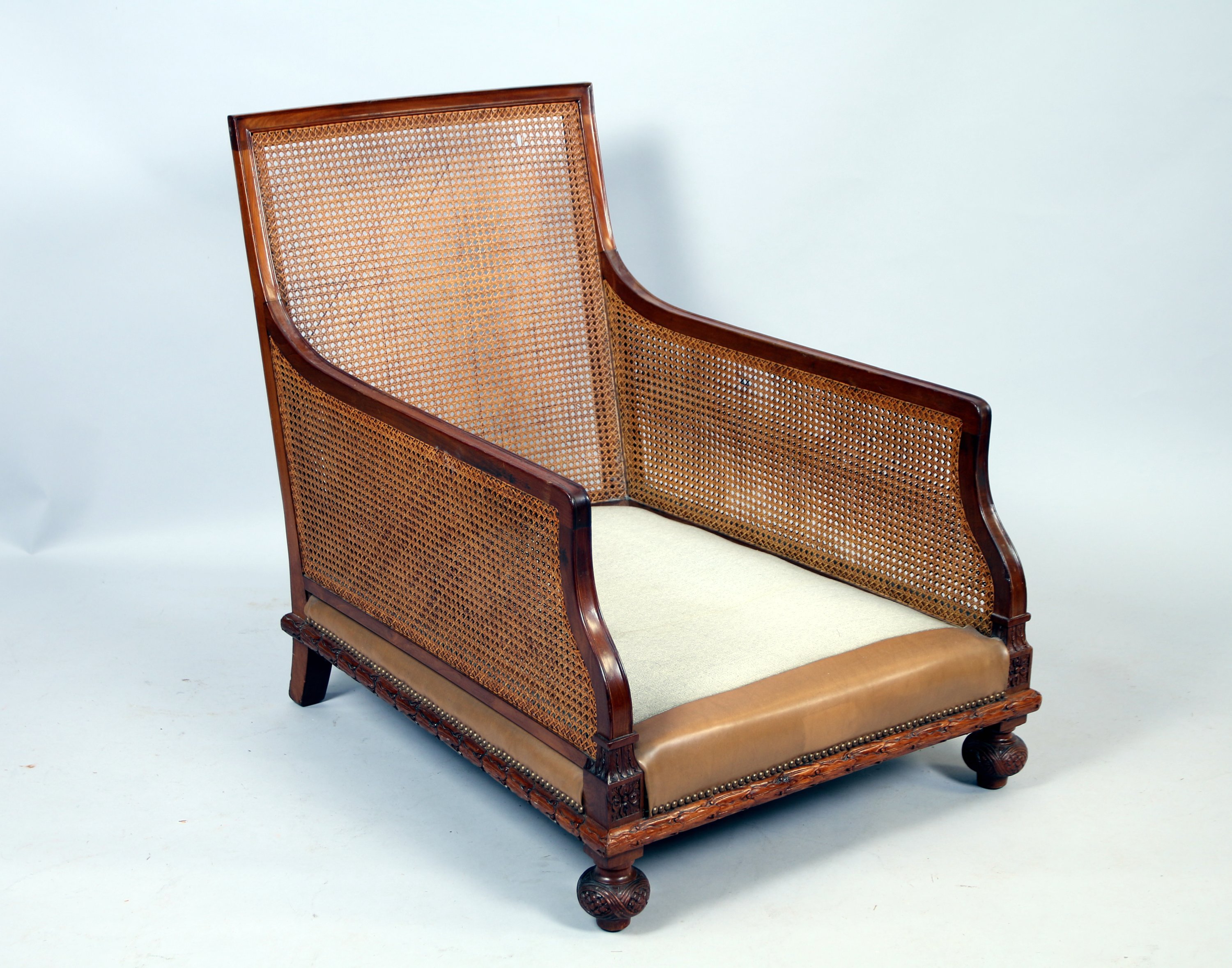 l'assise et les accotoirs cannées. En bois sculpté de fleurs. Repose à l'avant sur deux sphères sculptées.