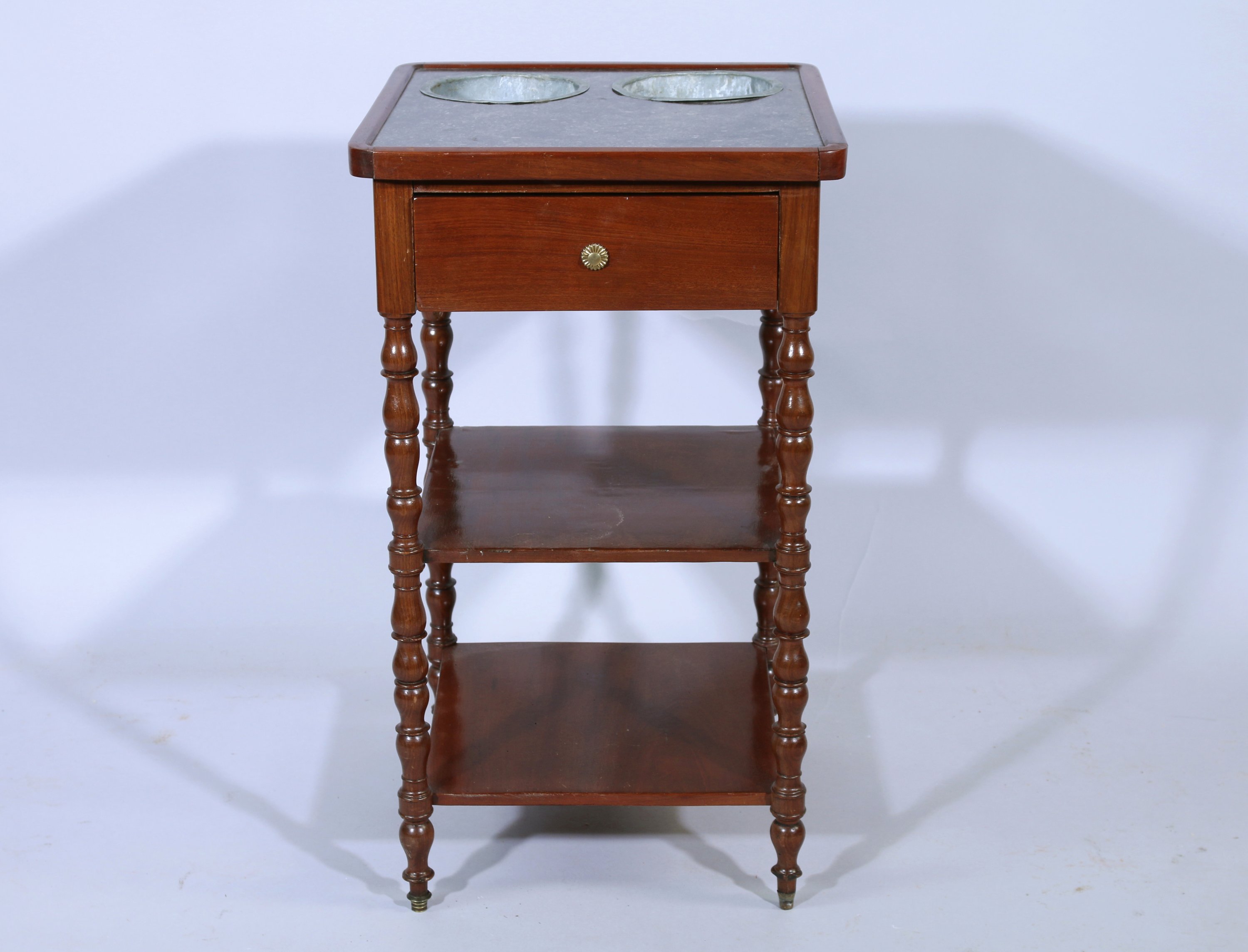 et placage d'acajou ouvrant en façade par un tiroir présentant un bouton de tirage en laiton. Elle repose sur quatre pieds tournés de forme balustre réunis par deux tablettes. Dessus de marbre gris Sainte Anne présentant deux niches pour déposer les seaux en métal.