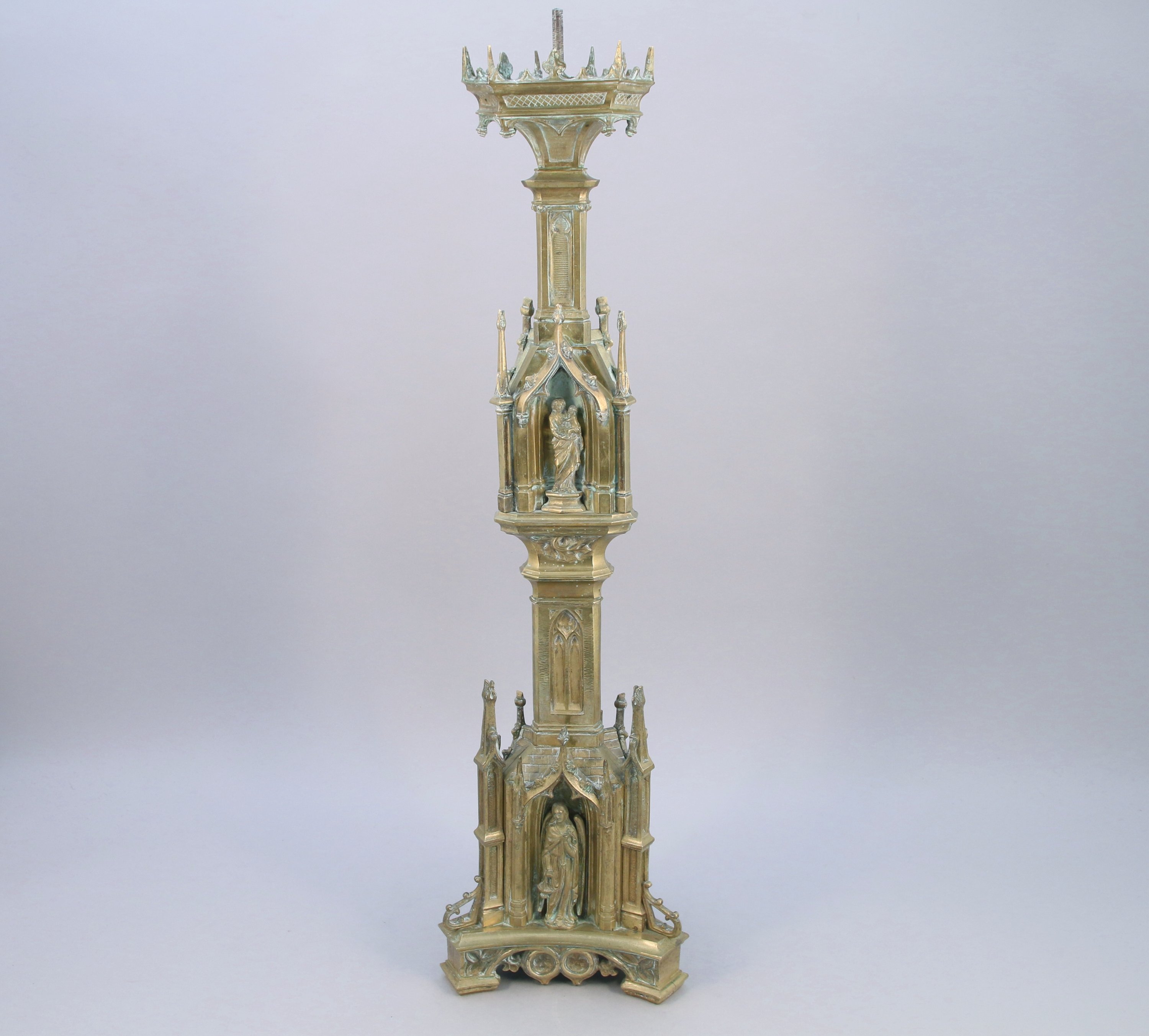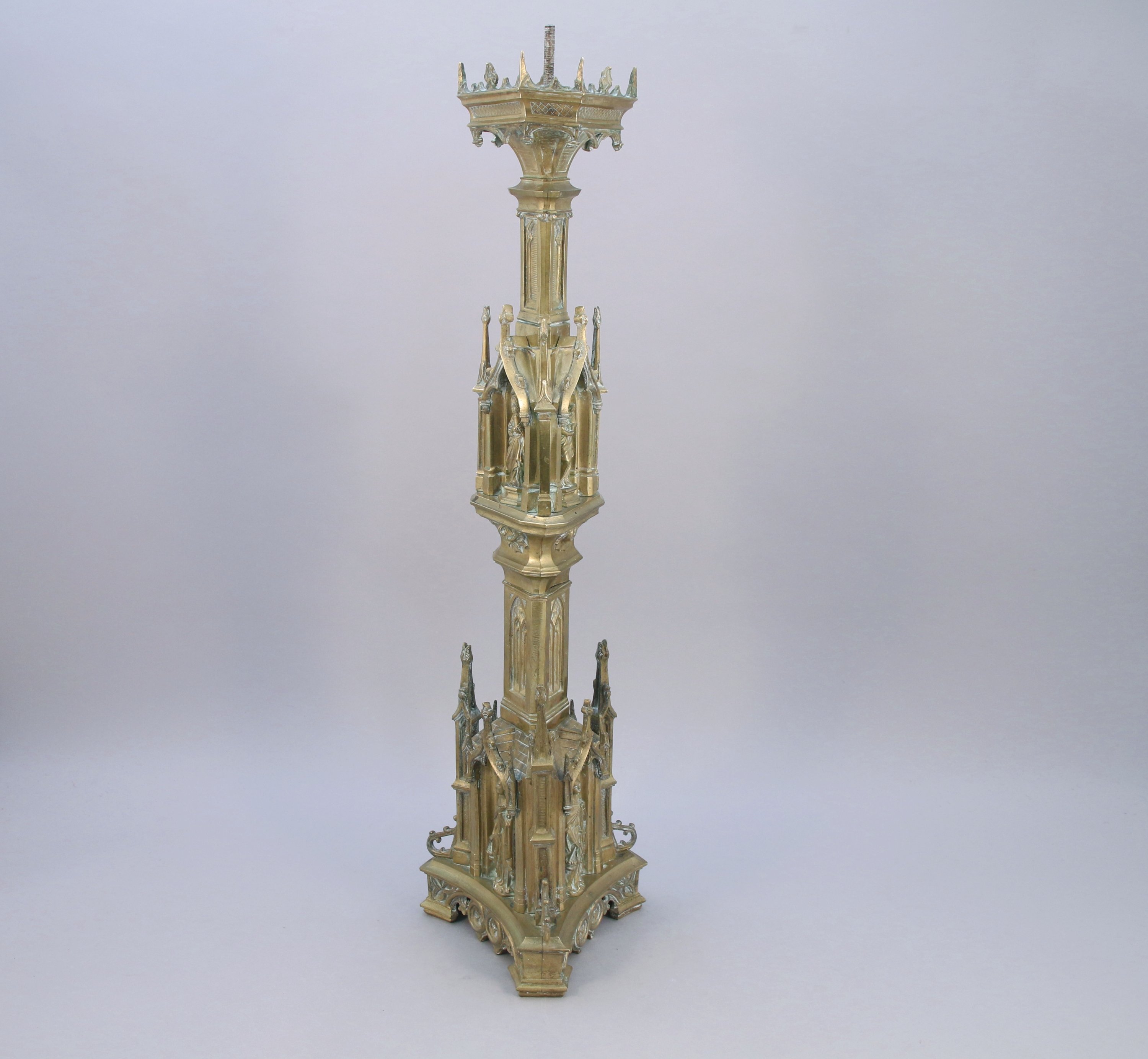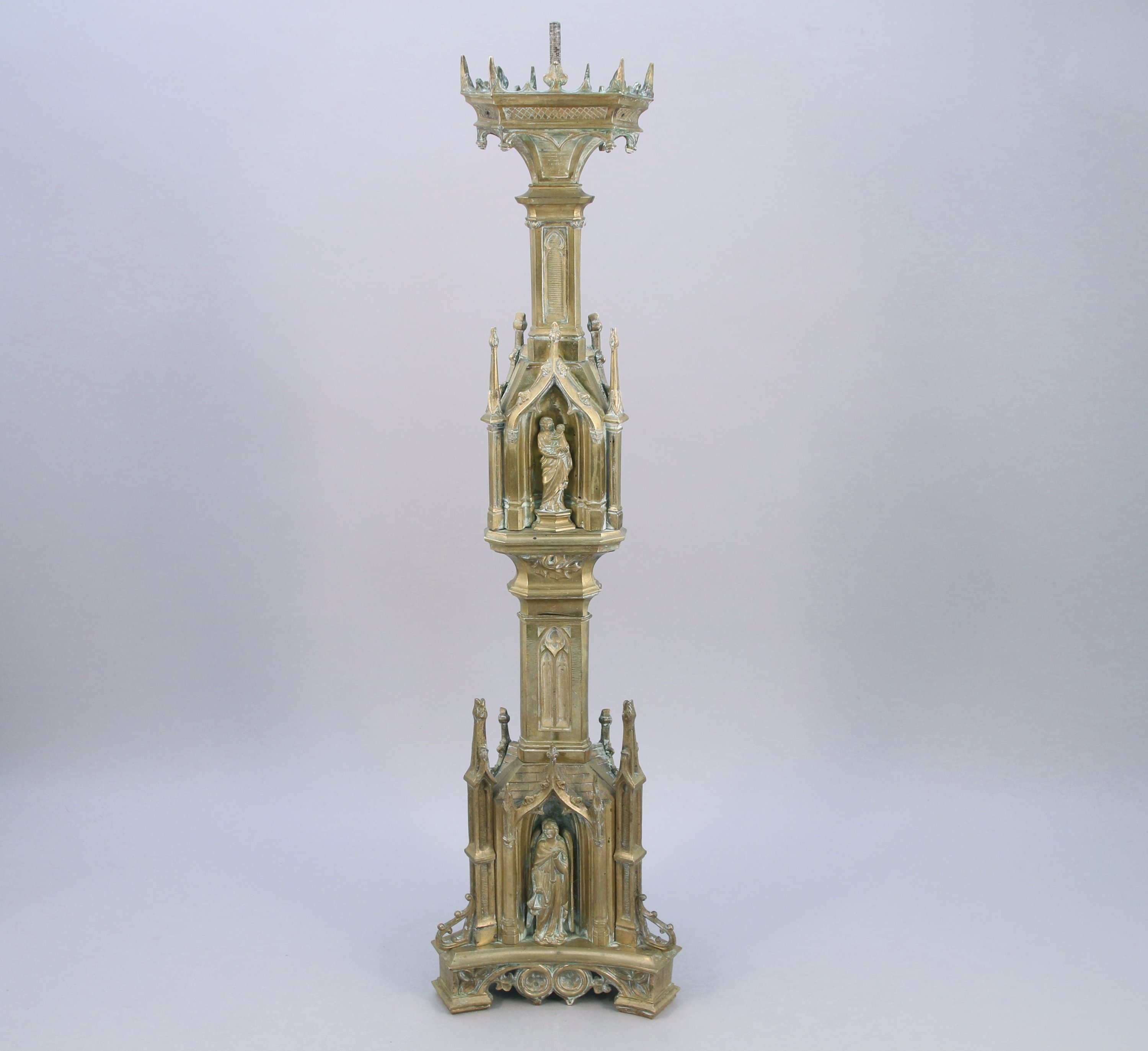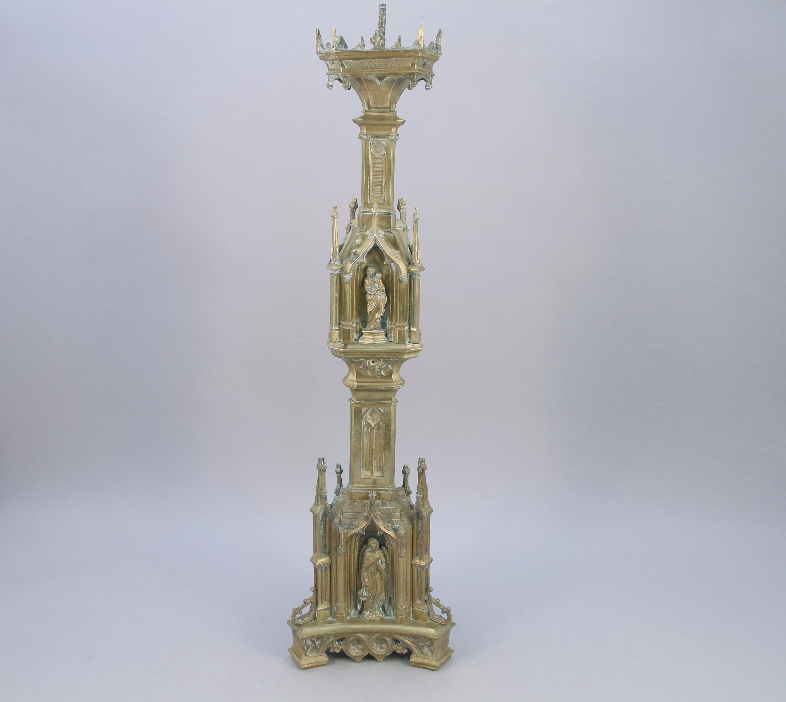 en bronze doré à décor architecturé sur trois niveaux. La base offrant trois niches surmontées d'arcatures trilobées dans lesquelles sont inscrits des archanges tenant chacun un encensoir. Des fenestrages à meneau central sont présentés sous trois autres arcatures abritant la Vierge à l'Enfant.