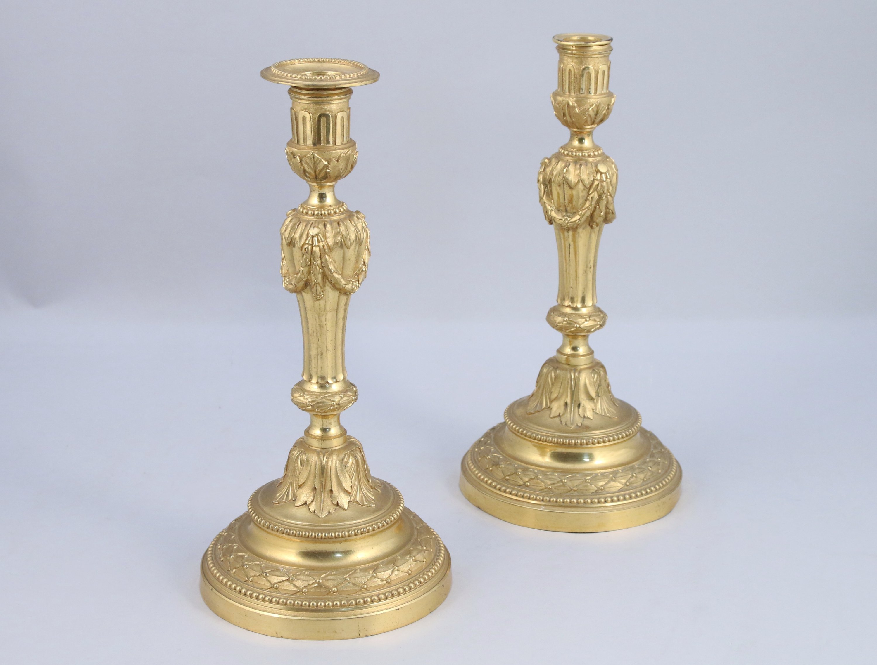 en bronze doré, le pied circulaire à décor de rang de perles et feuilles de lauriers, la terrasse séparée par une doucine, la cloche présentant des feuilles d'acanthe. Le fût cannelé est orné de guirlande de laurier. La tête offre un décor de feuilles d'acanthe et le binet de triglyphes.