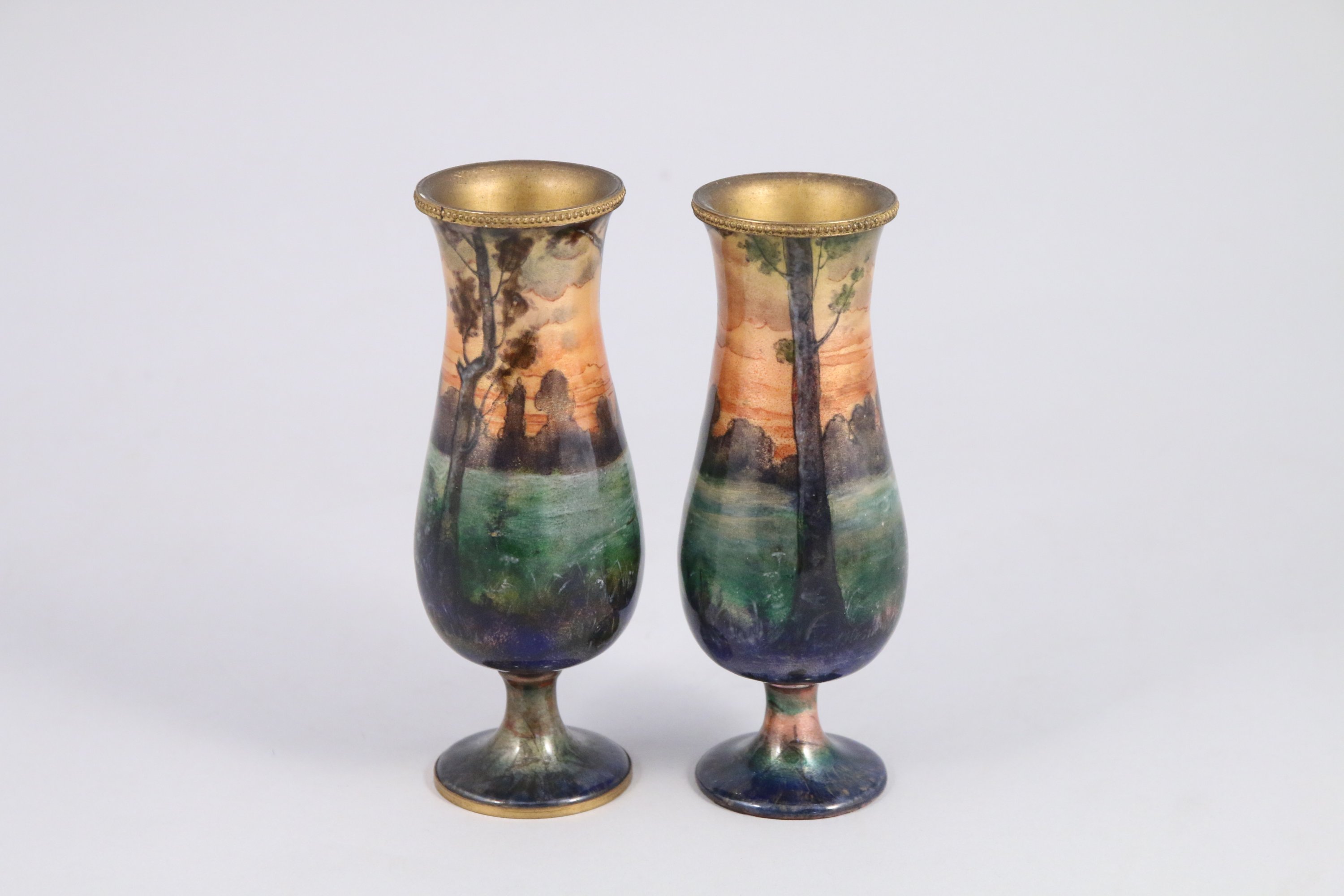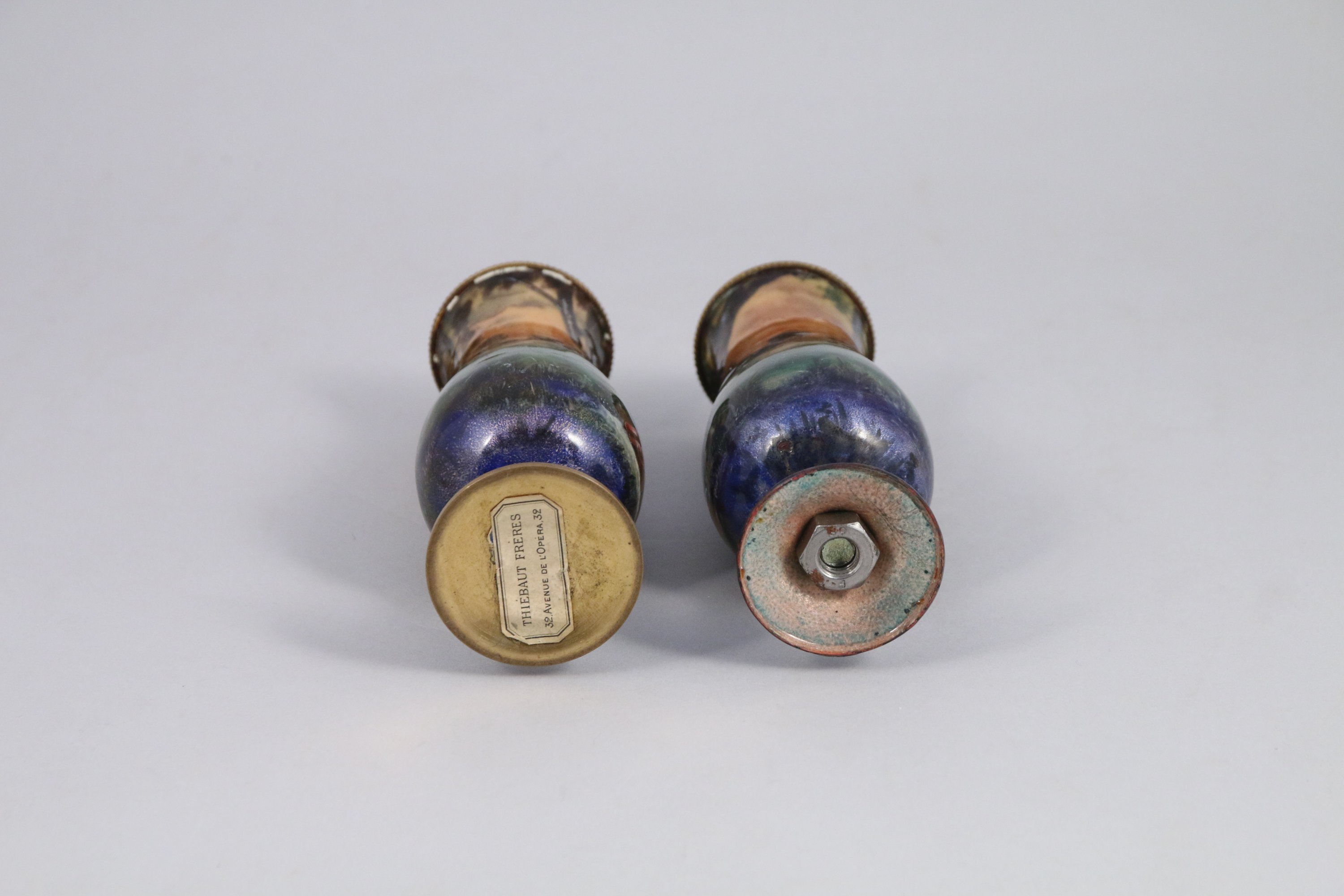 de forme balustre reposant sur piédouche à décor pour l'un d'une femme à la lyre pour l'autre d'une femme tenant une tablette. Ornementation de bronze doré au col à décor de rang de perles et au pied à l'un.