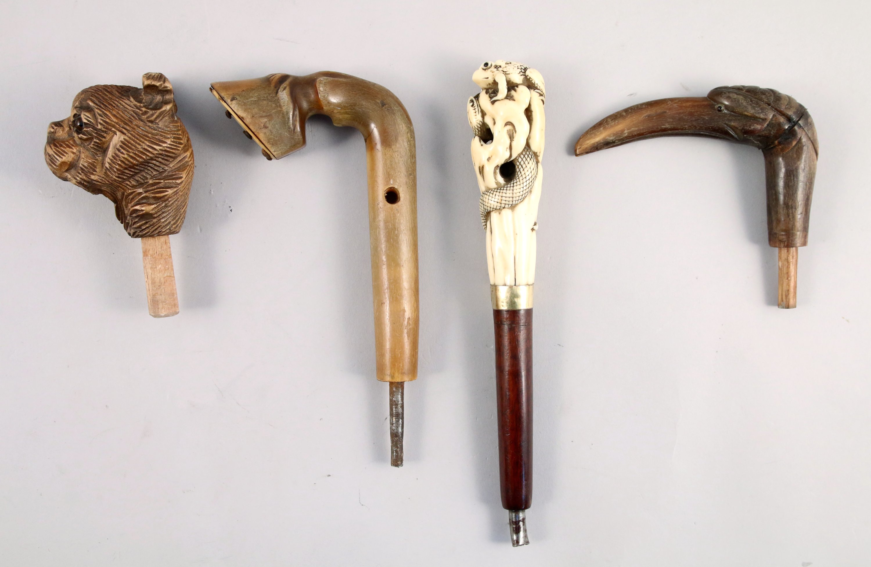 trois en corne sculptée à motif d'un sabot de cheval, d'une tête de flamand rose, d'une tête de bouledogue aux yeux de verre et un en os sculpté d'un serpent affrontant une grenouille.