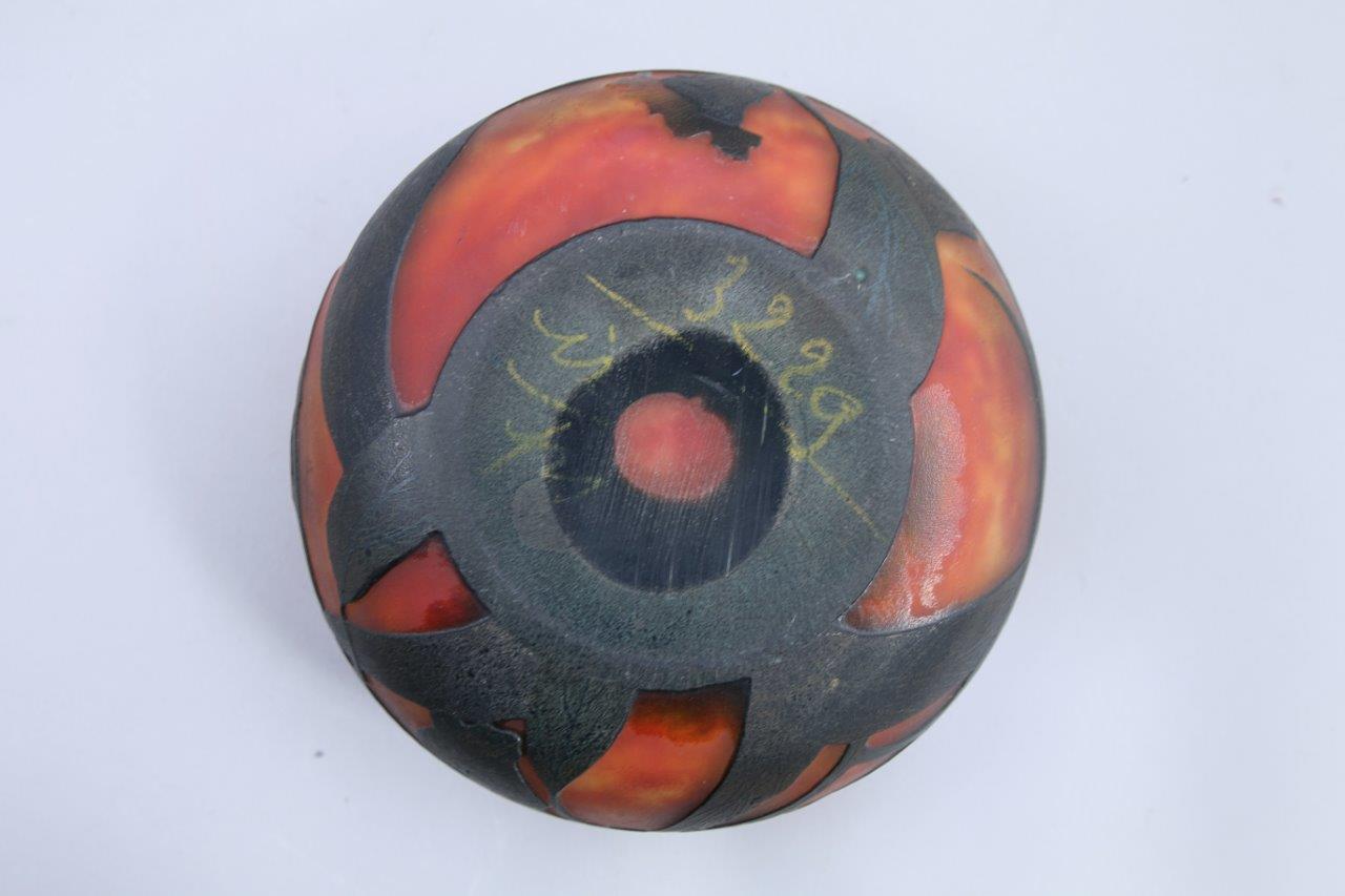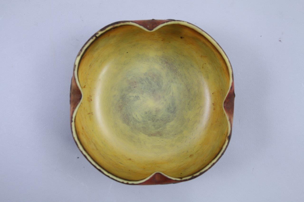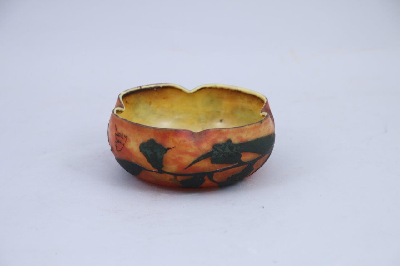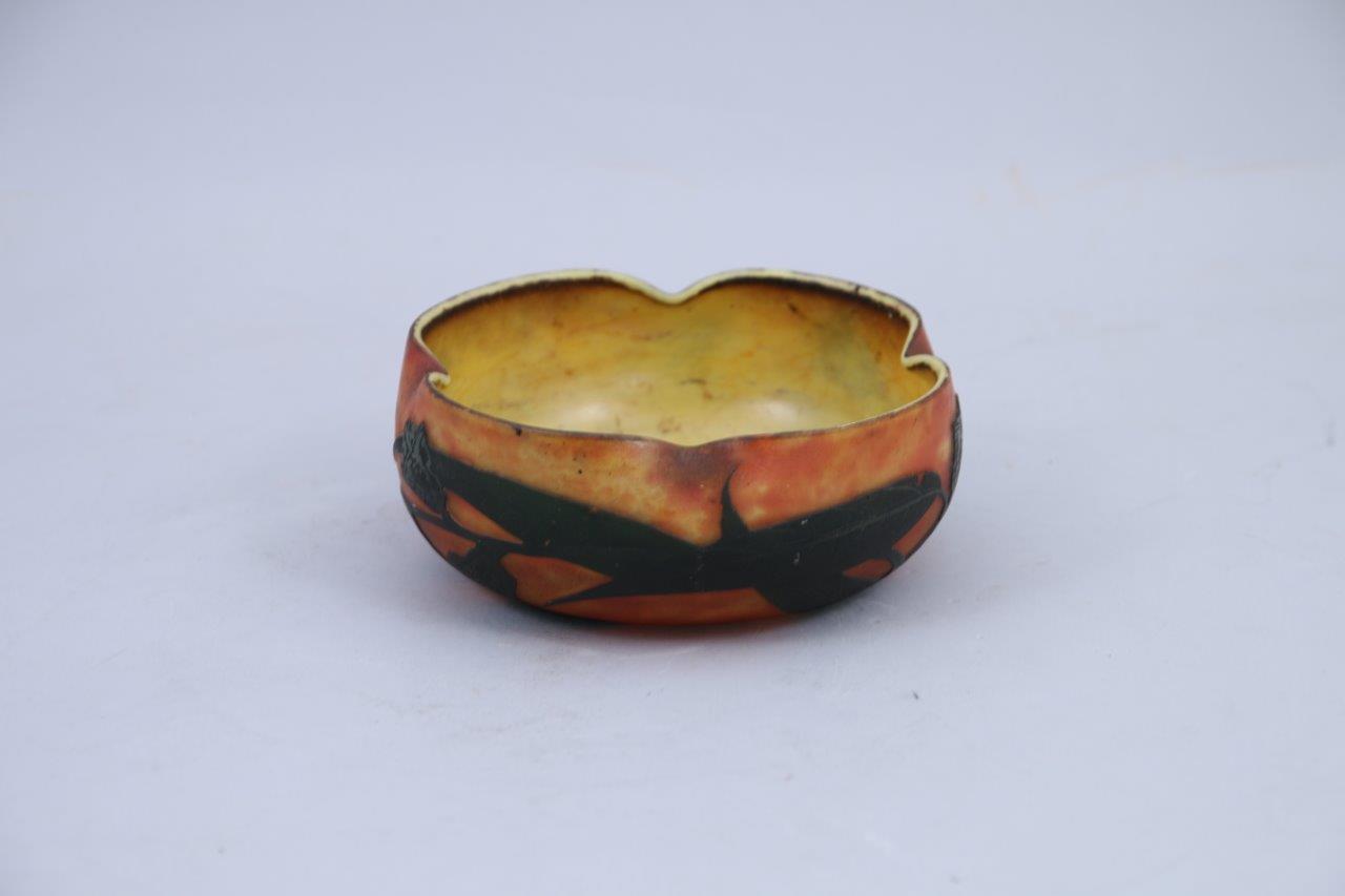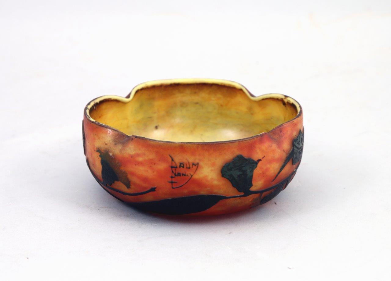 Coupe basse polylobée, à fond orangé avec applications de feuillages lancéolés.