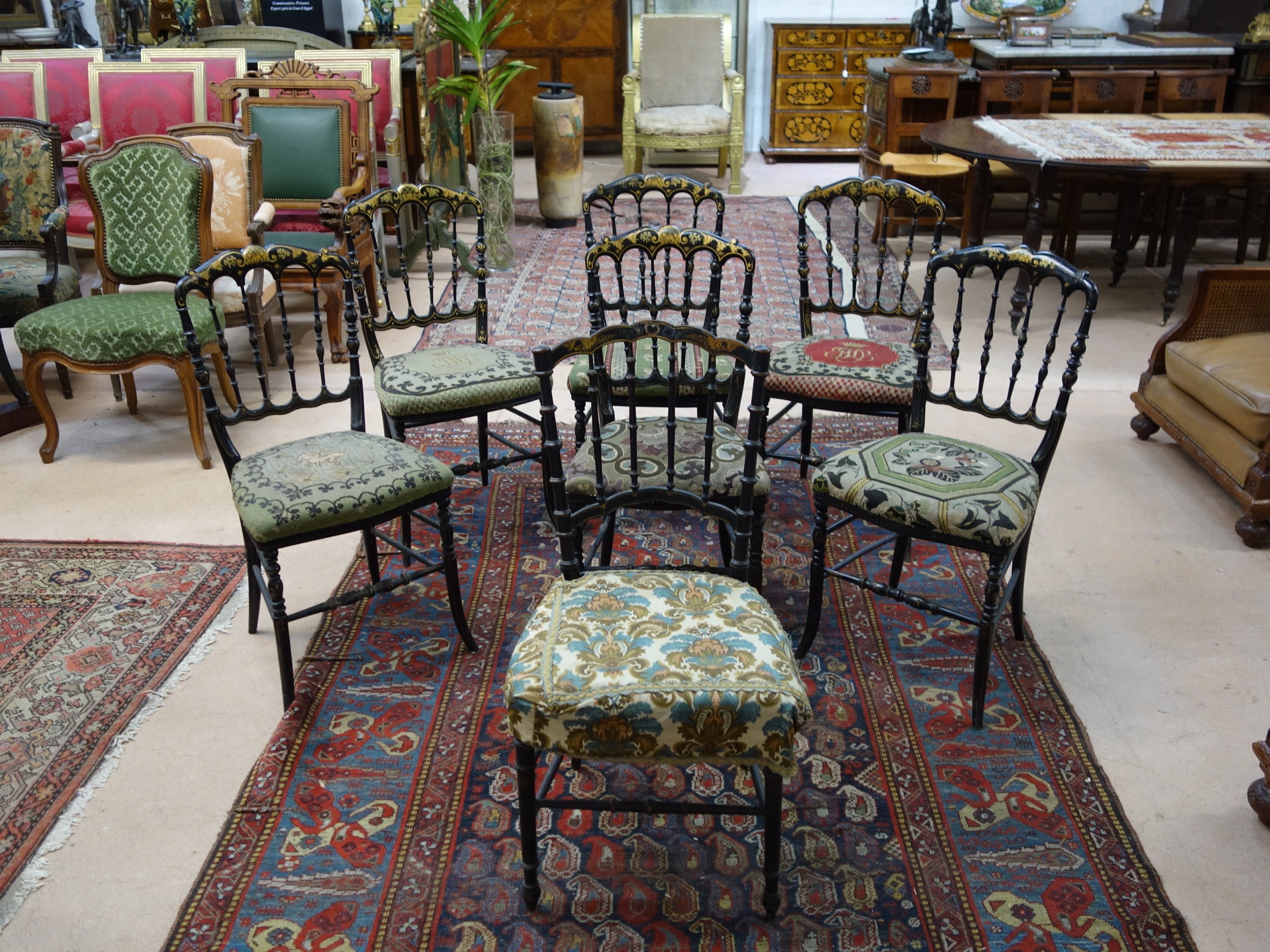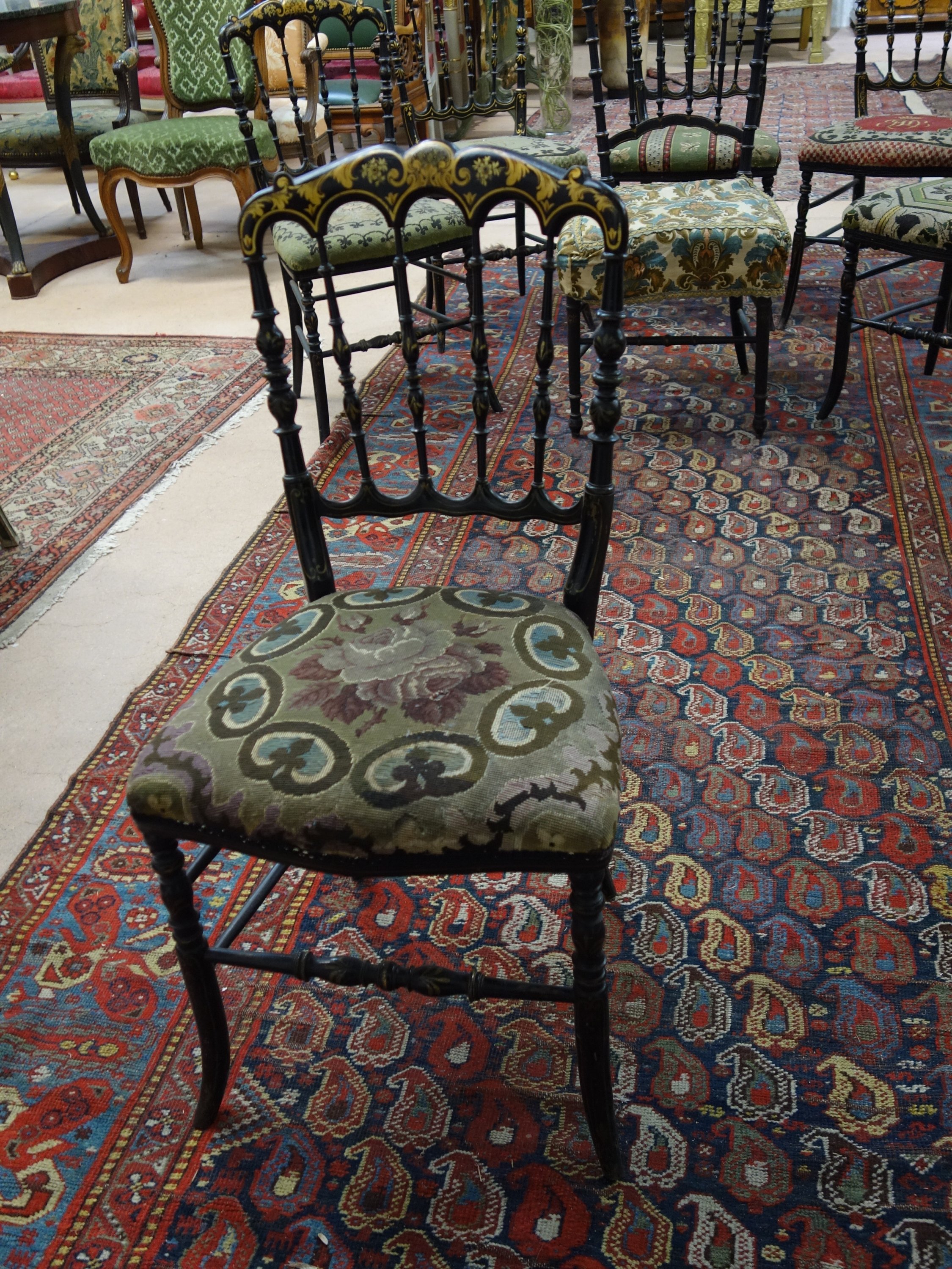 du même modèle et une autre en bois peint noir et application dorée. Dossier à colonnettes en fuseau.