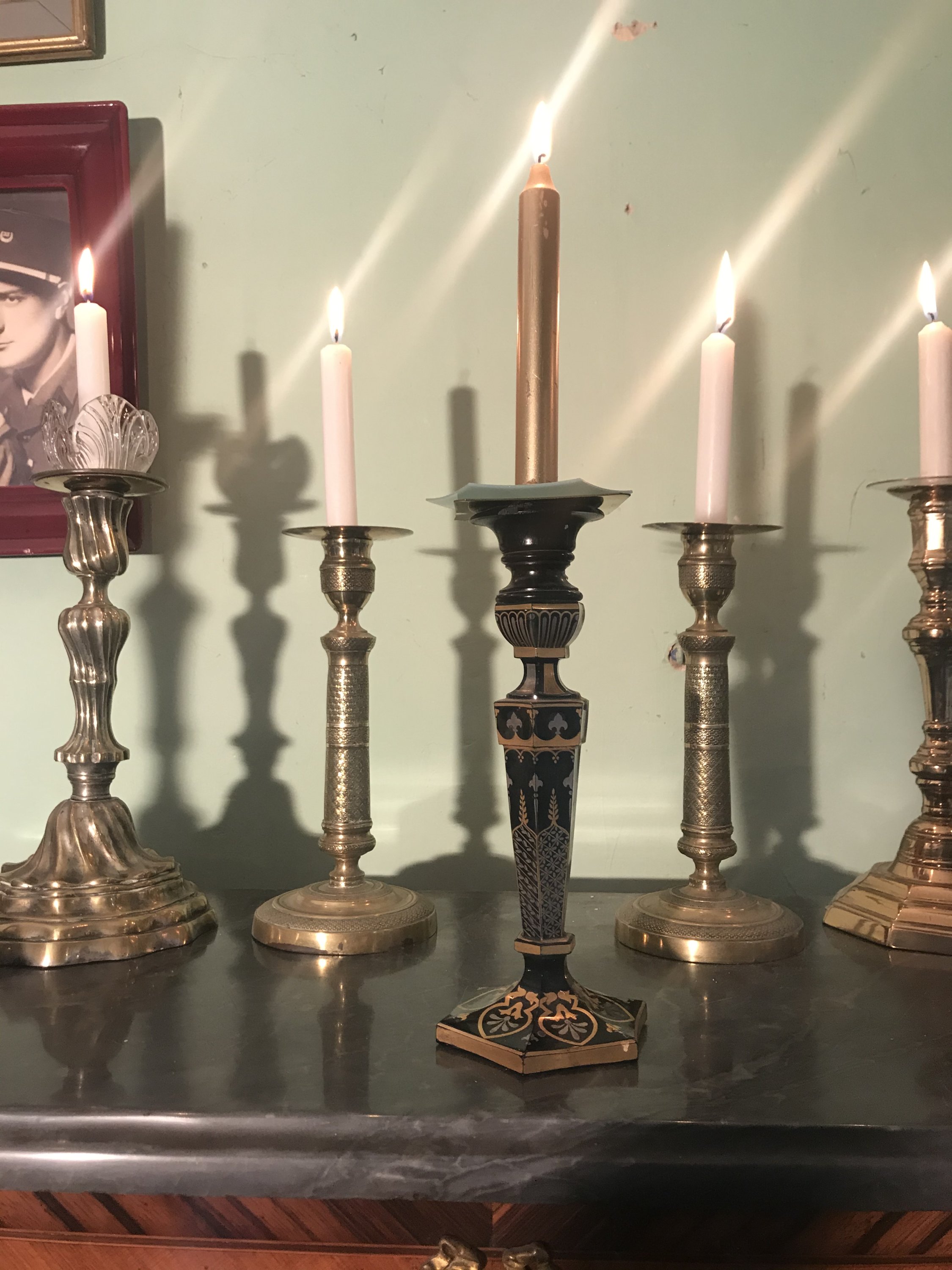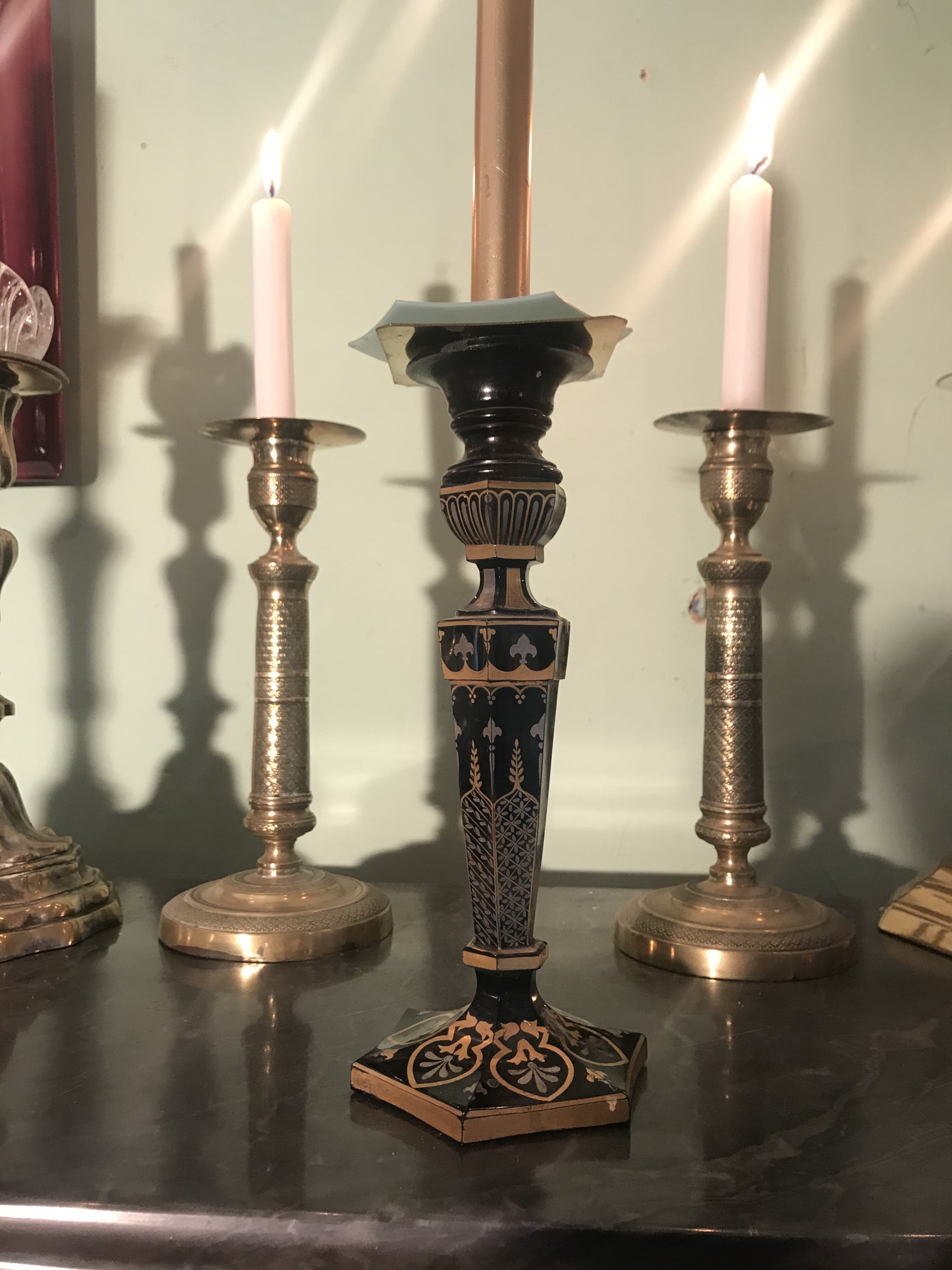 en verre à base hexagonale, le fût à pans coupés, décor or et argent de fleurs, épis, quadrillages.