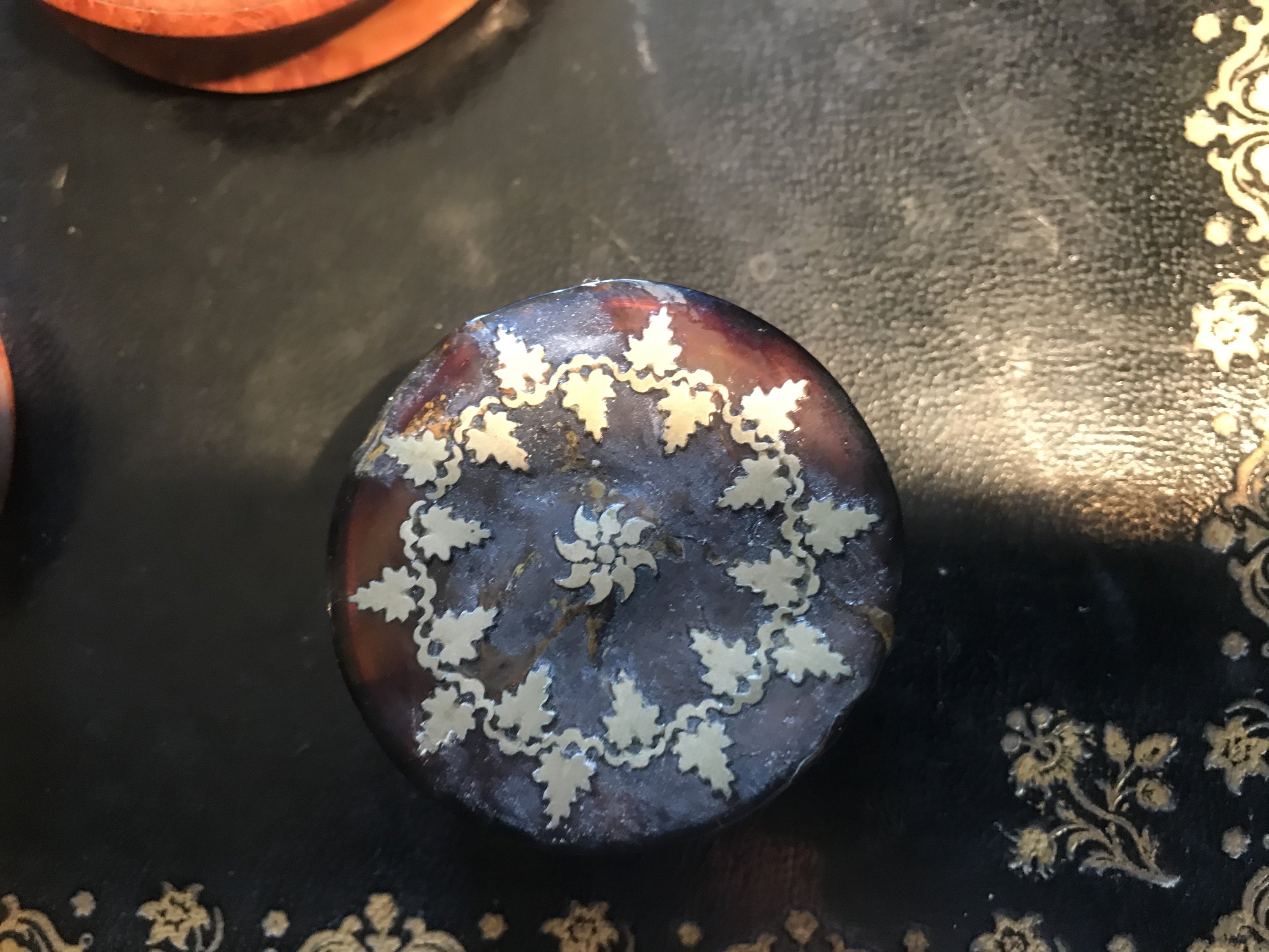 - Boîte circulaire en écaille-ambre (?), marqueterie de feuilles (accidents et restaurations).