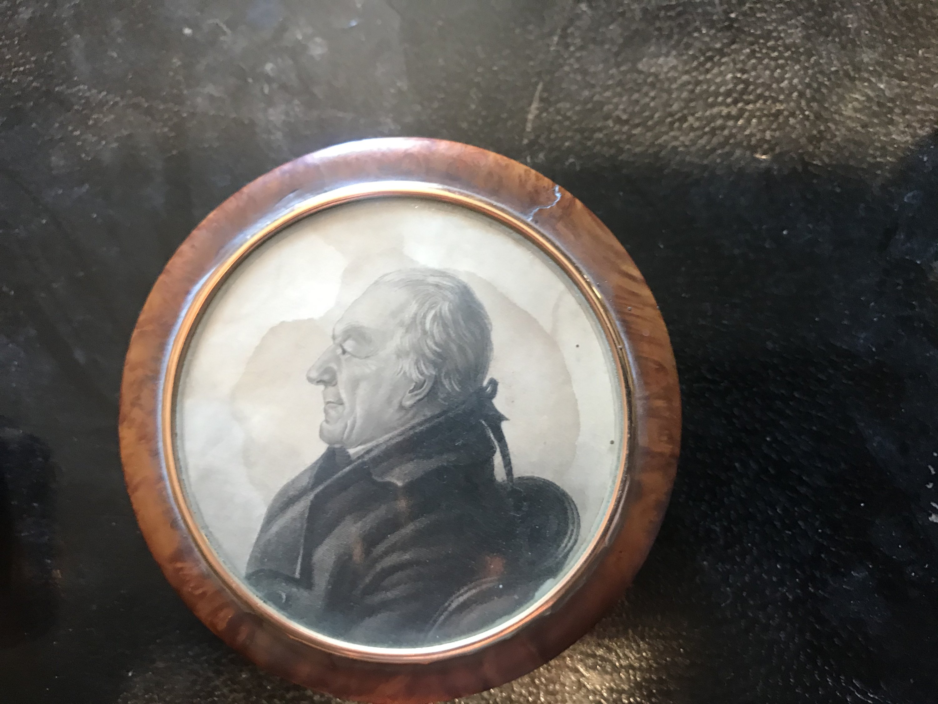 - Boîte circulaire en loupe, intérieur écaille de tortue, couvercle homme au catogan. XIXe.