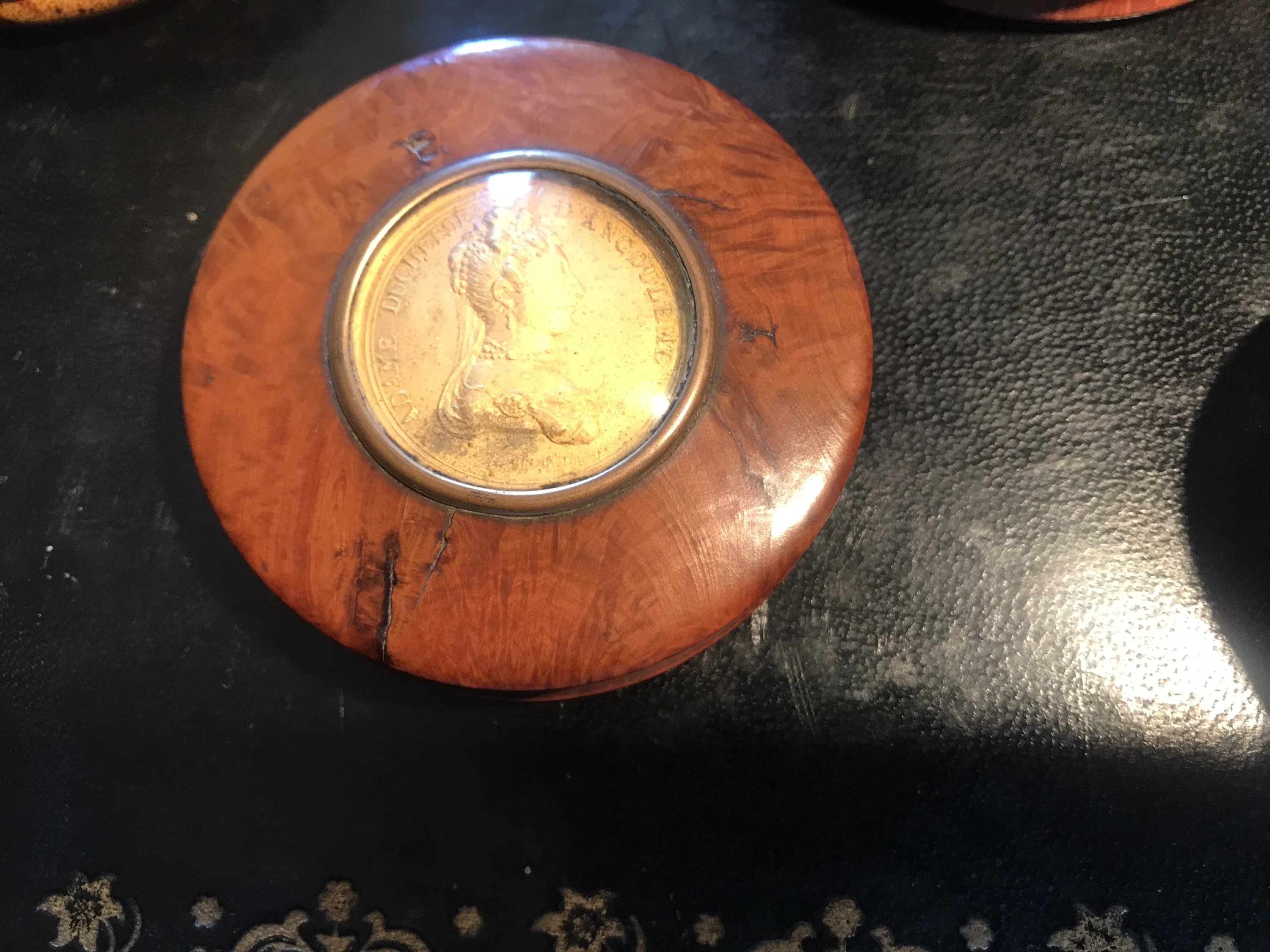 - Boîte circulaire en loupe, couvercle médaillon au profil de Madame la duchesse dAngoulême. Premier tiers XIXe (accidents).