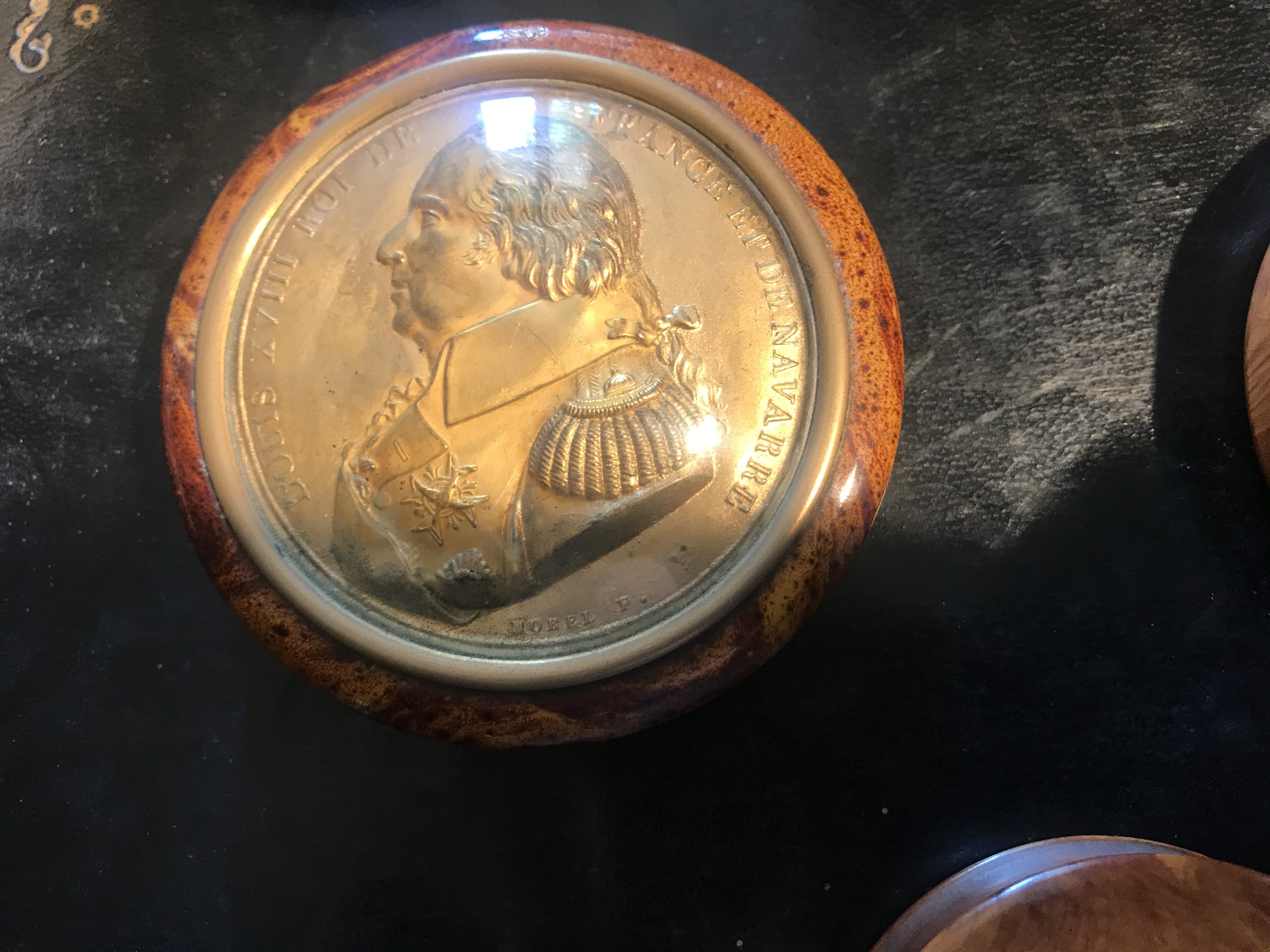 - Boîte en beau bois naturel veiné, le couvercle orné au profil gauche Louis XVIII roi de France et de Navarre. Signée Morel F.