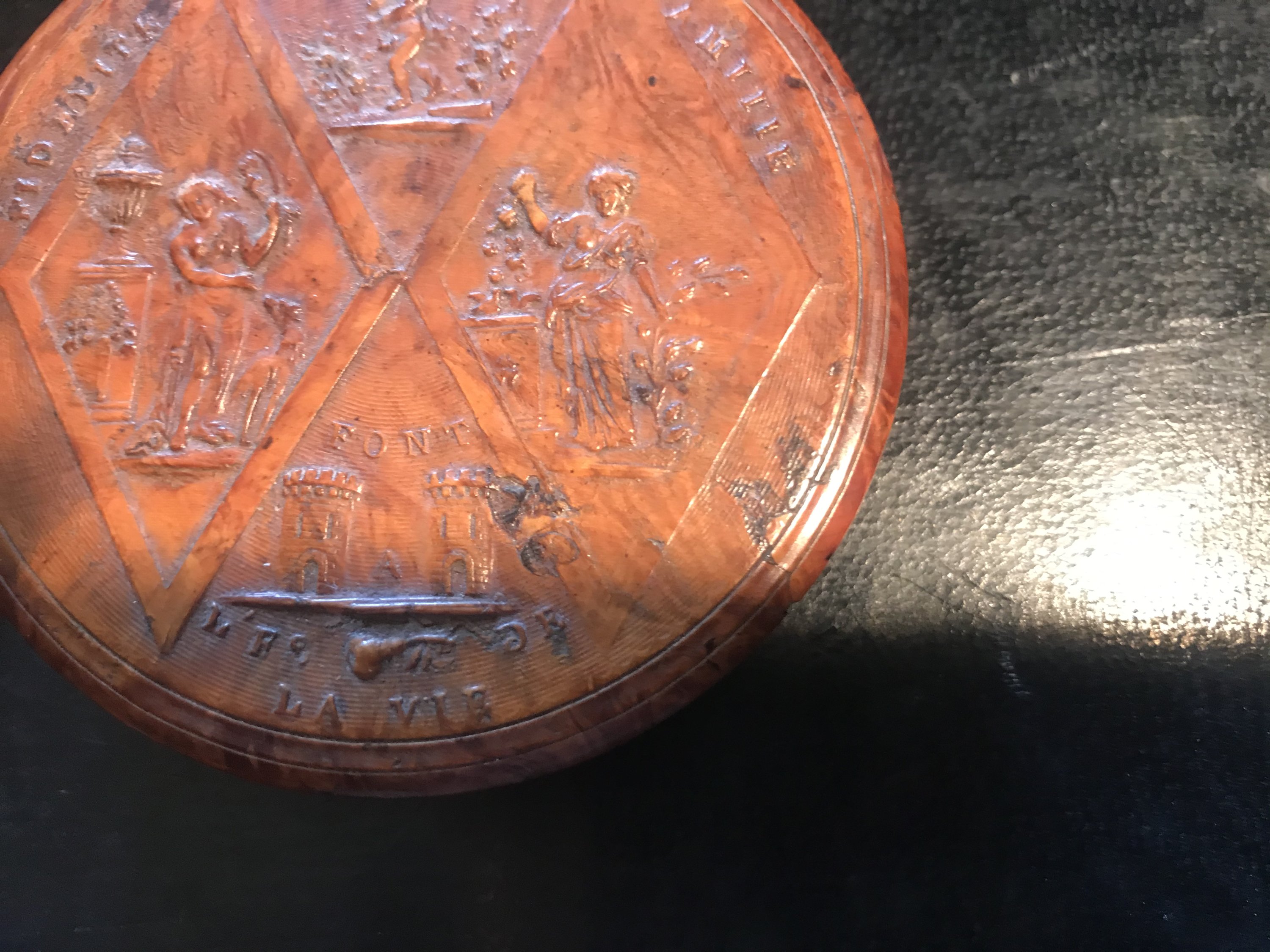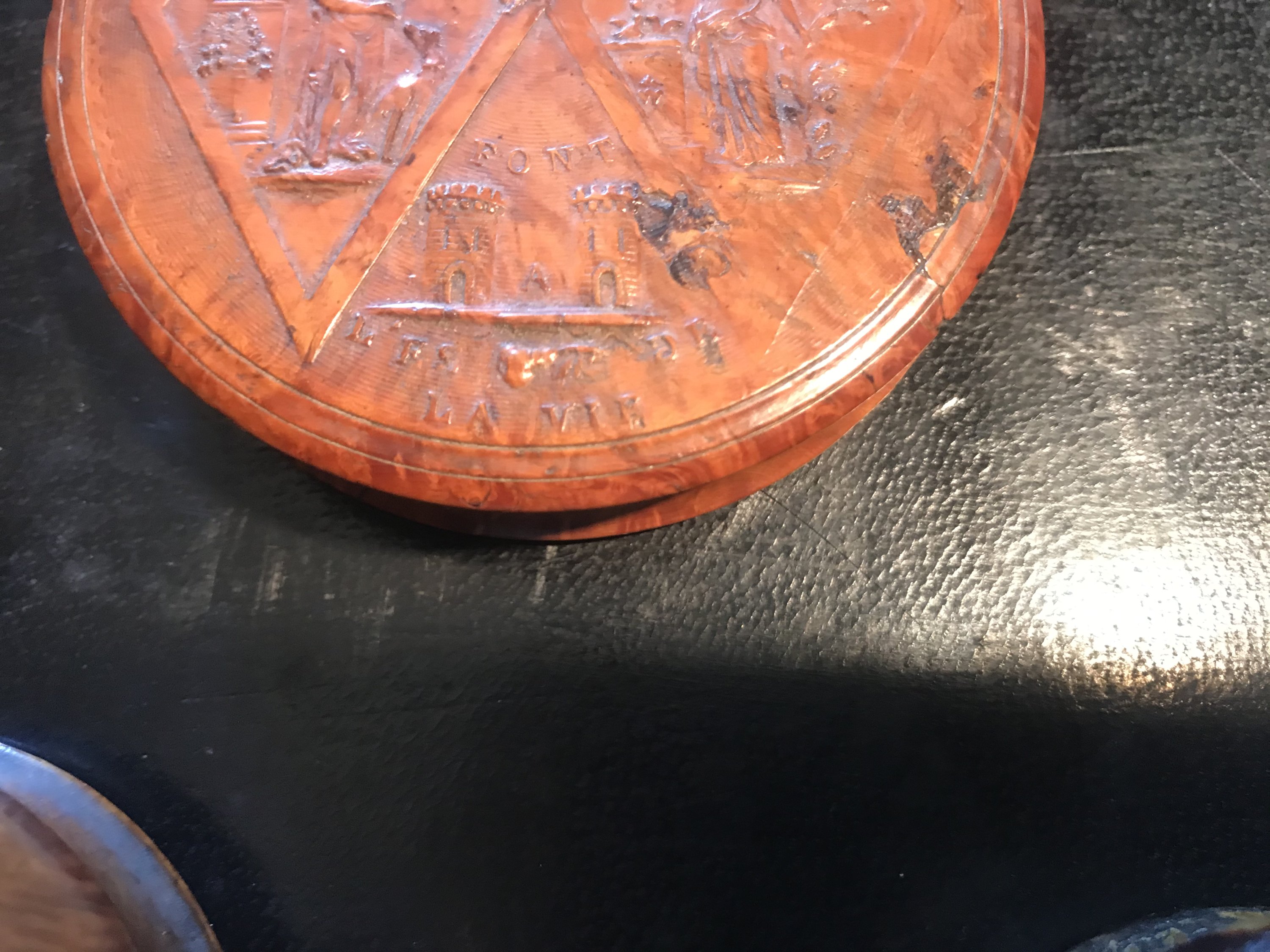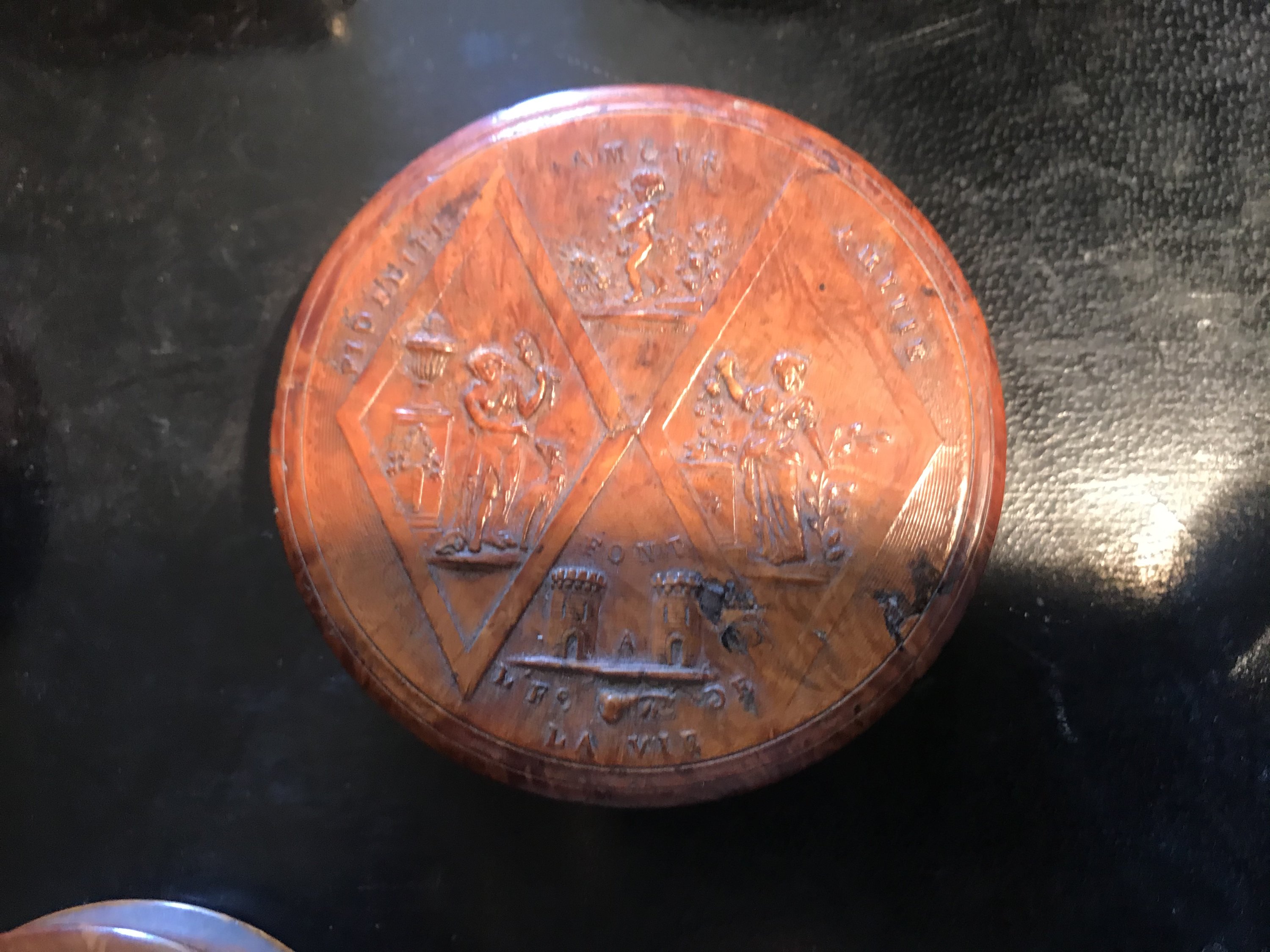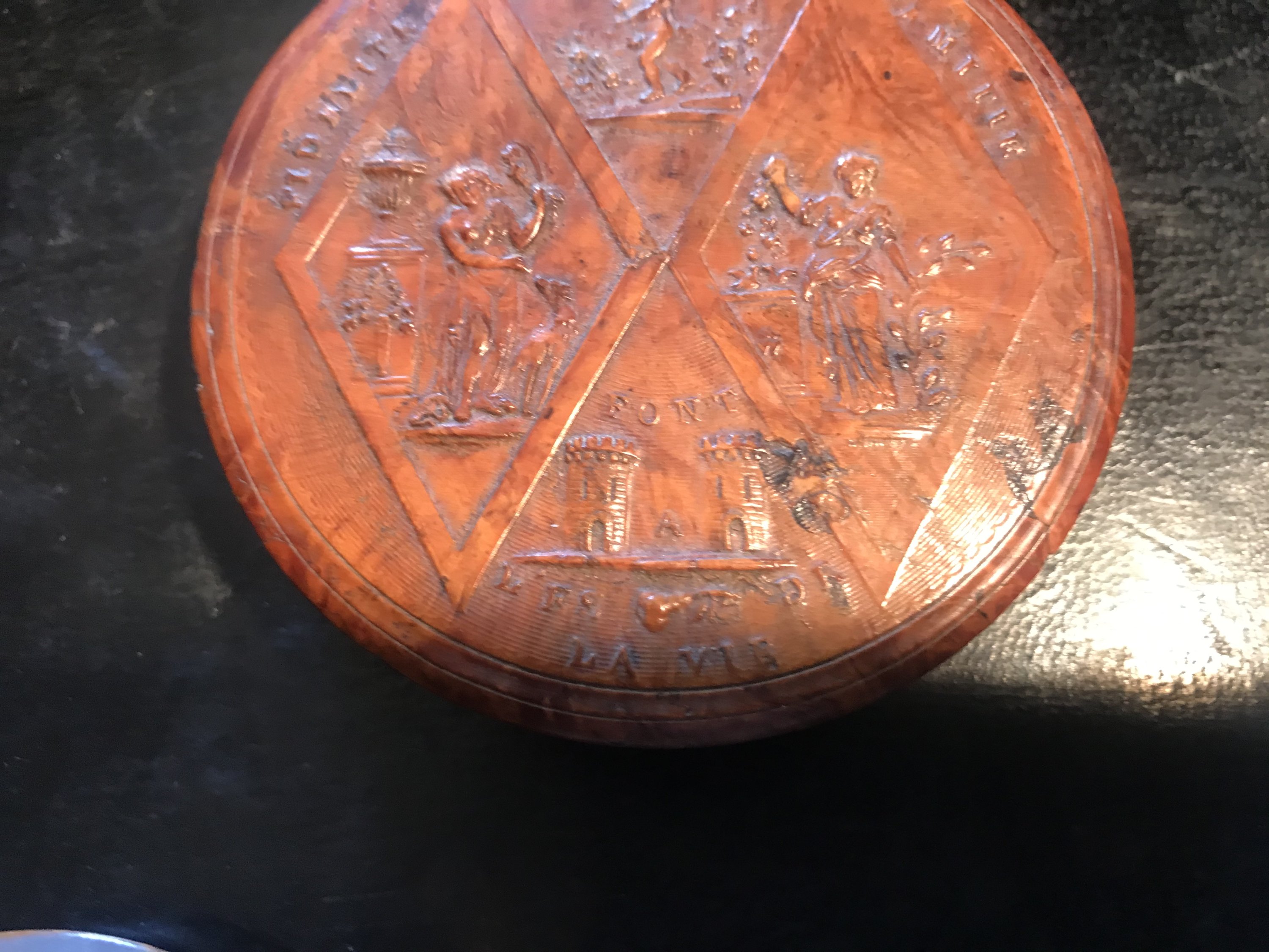 - Boîte circulaire en loupe, couvercle gravé aux trois vertus dans des losanges « Amour, Amitié, Fidélité, font les ... de la vie » surmontant une tour, intérieur écaille. XIXe.