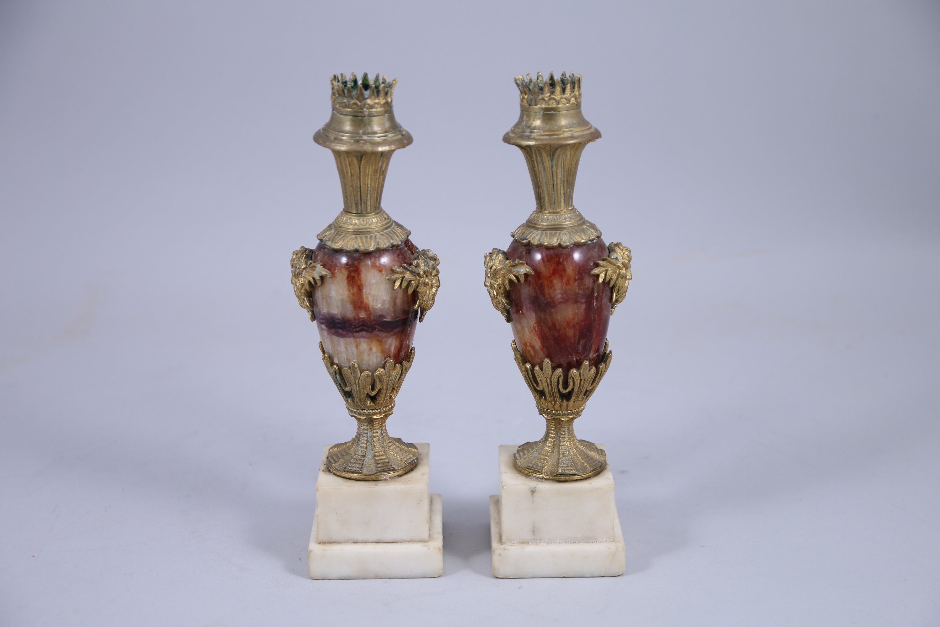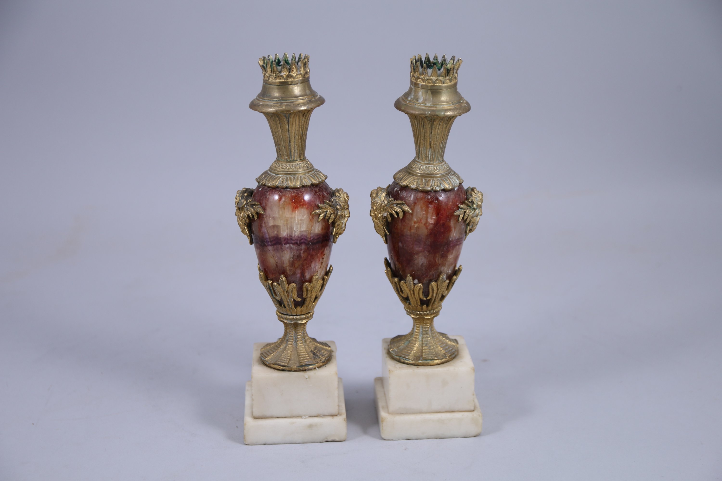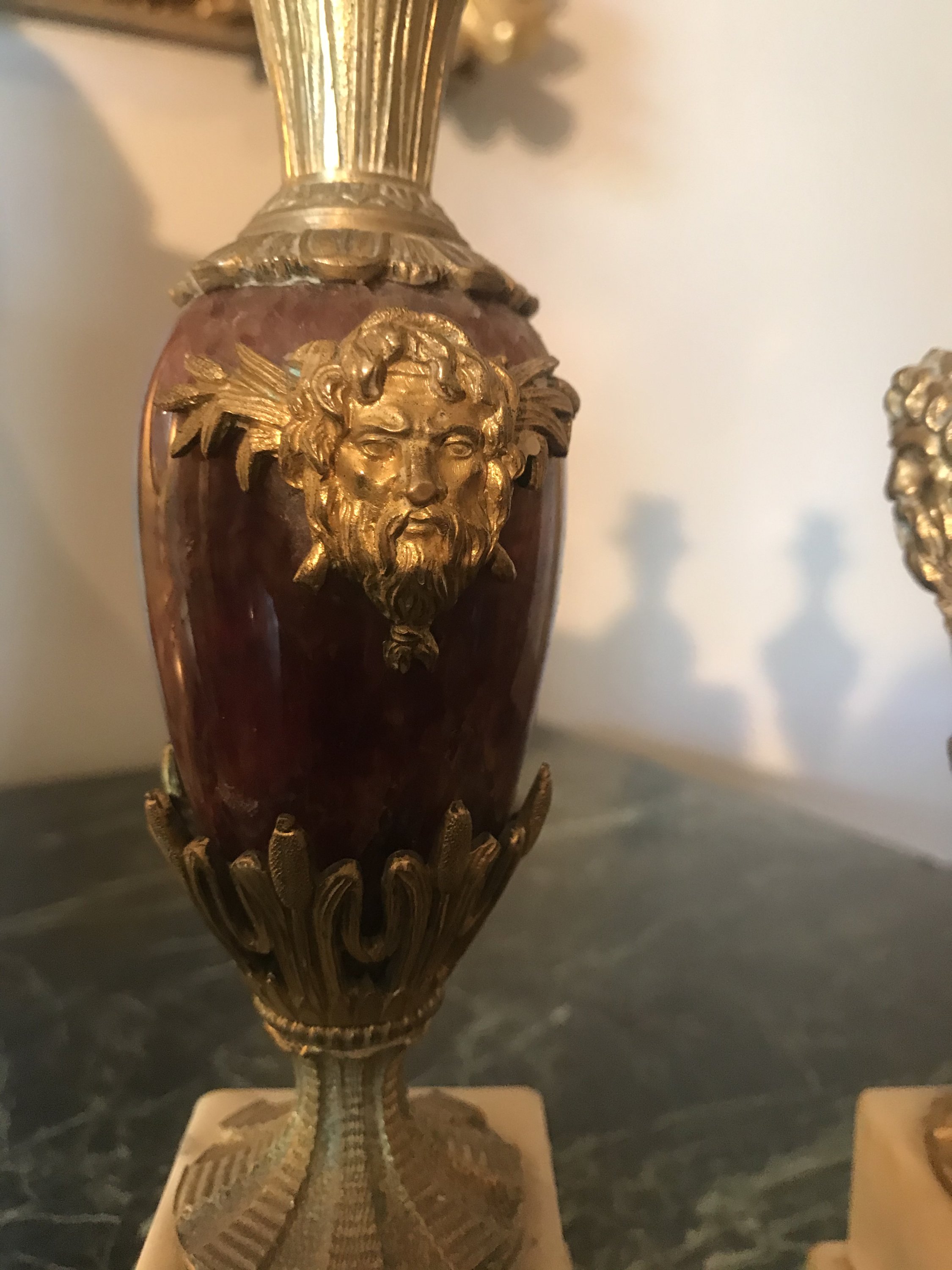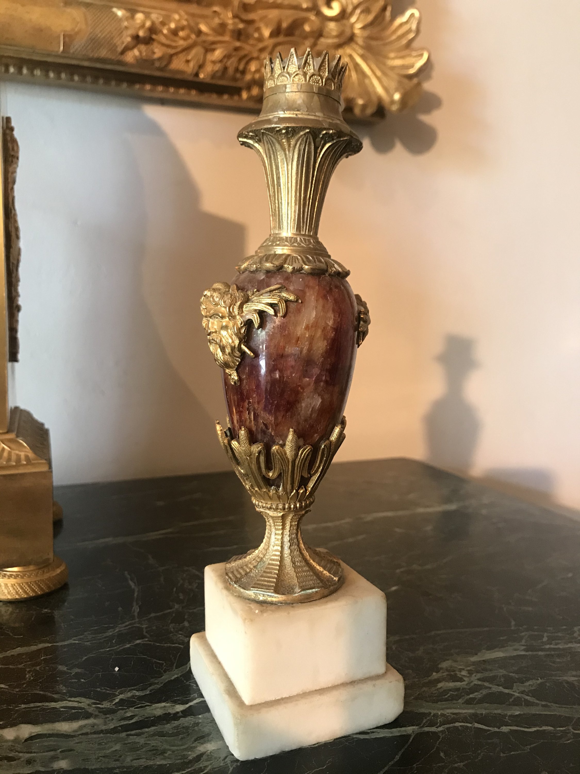 en marbre de couleur (porphyre ?), le fût en forme de vase balustre sur un socle carré. Riche ornementation en bronze doré et ciselé comme piédouches, fleurs de lotus, mascarons, feuilles de lotus, couronnes.