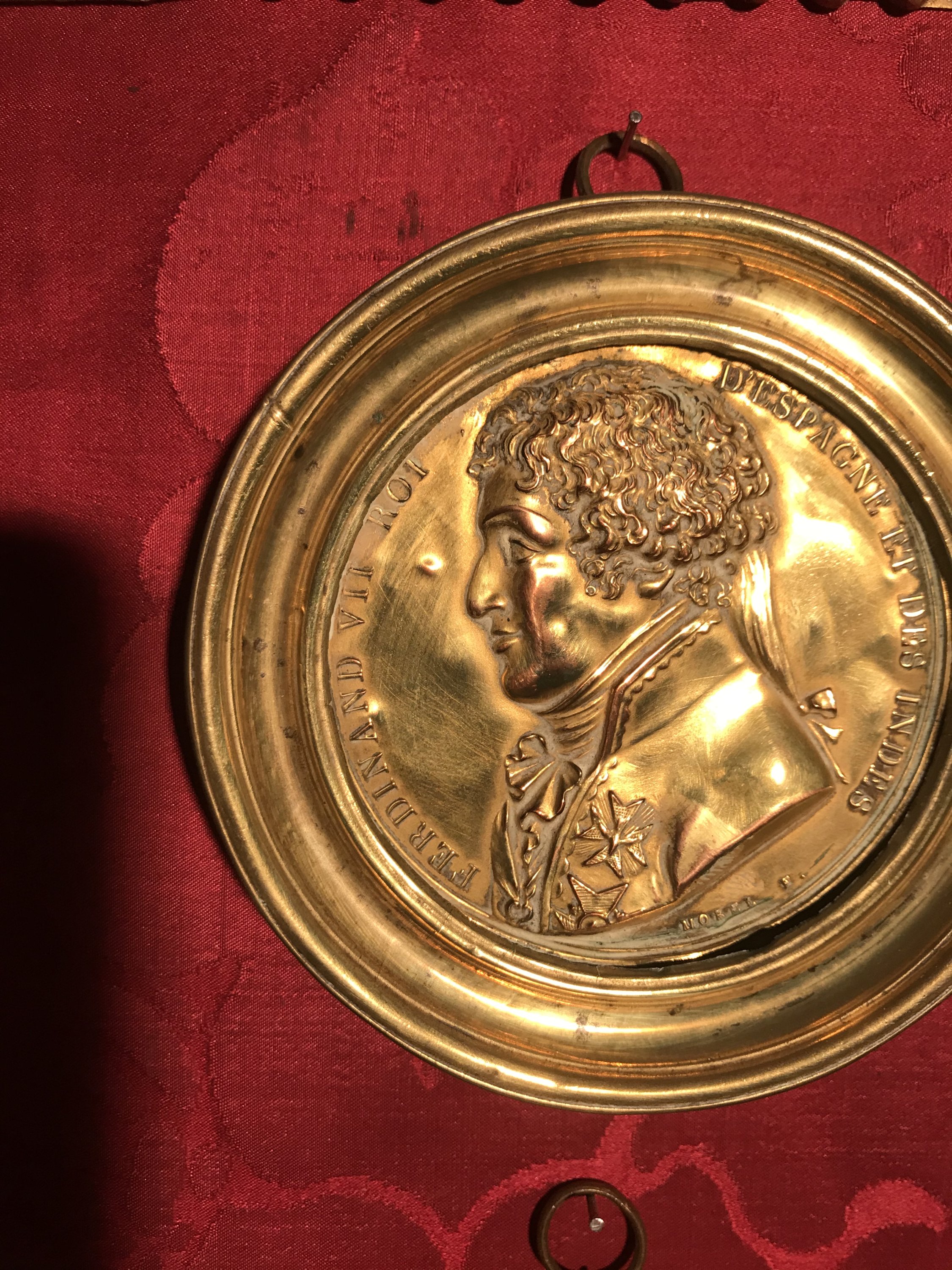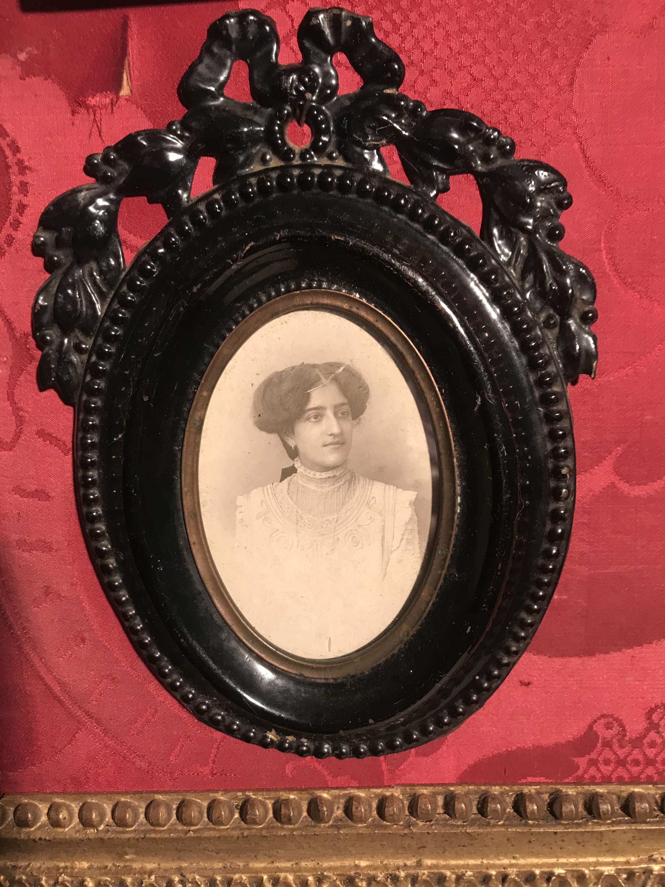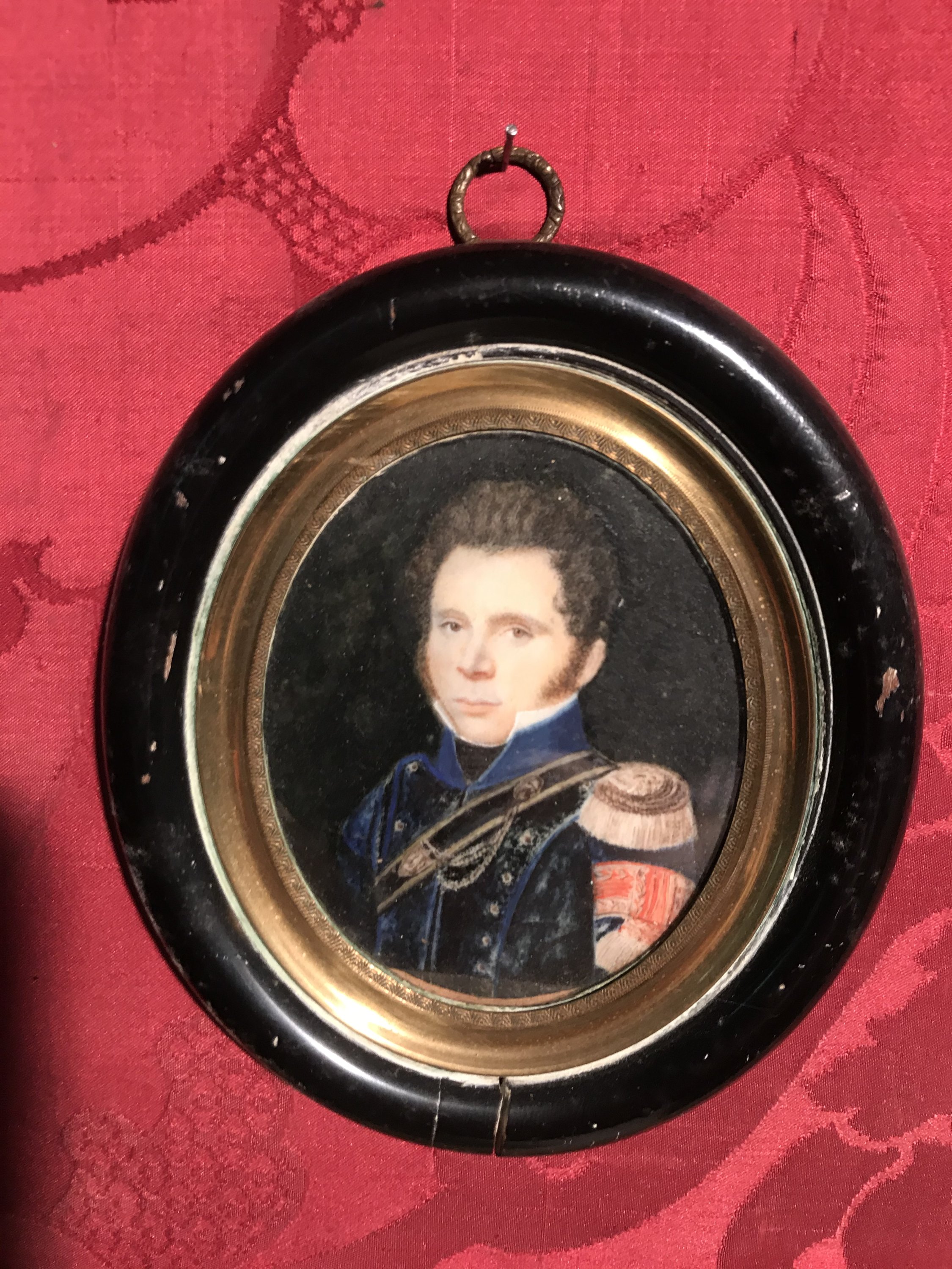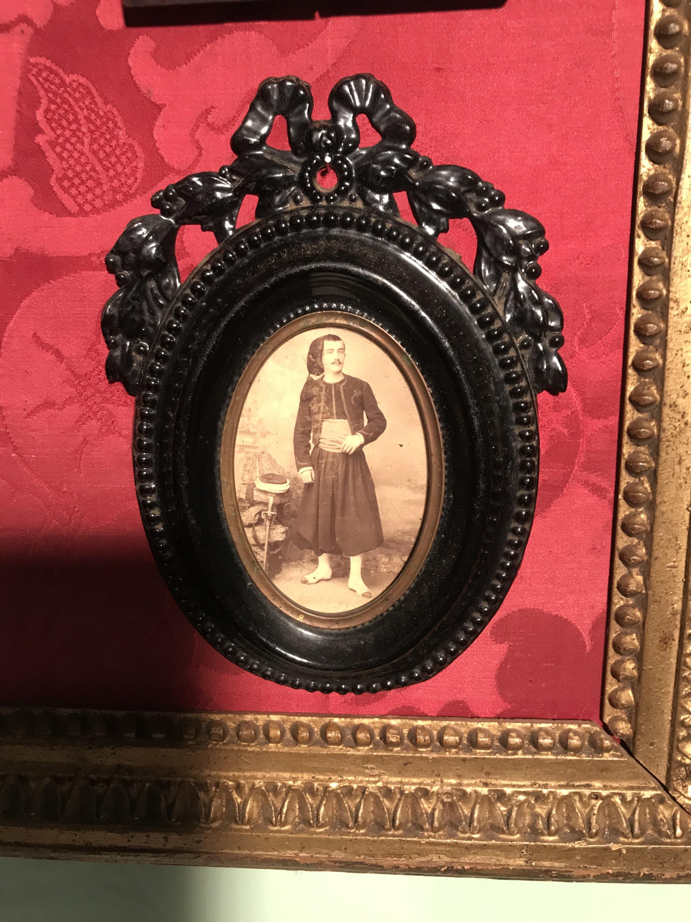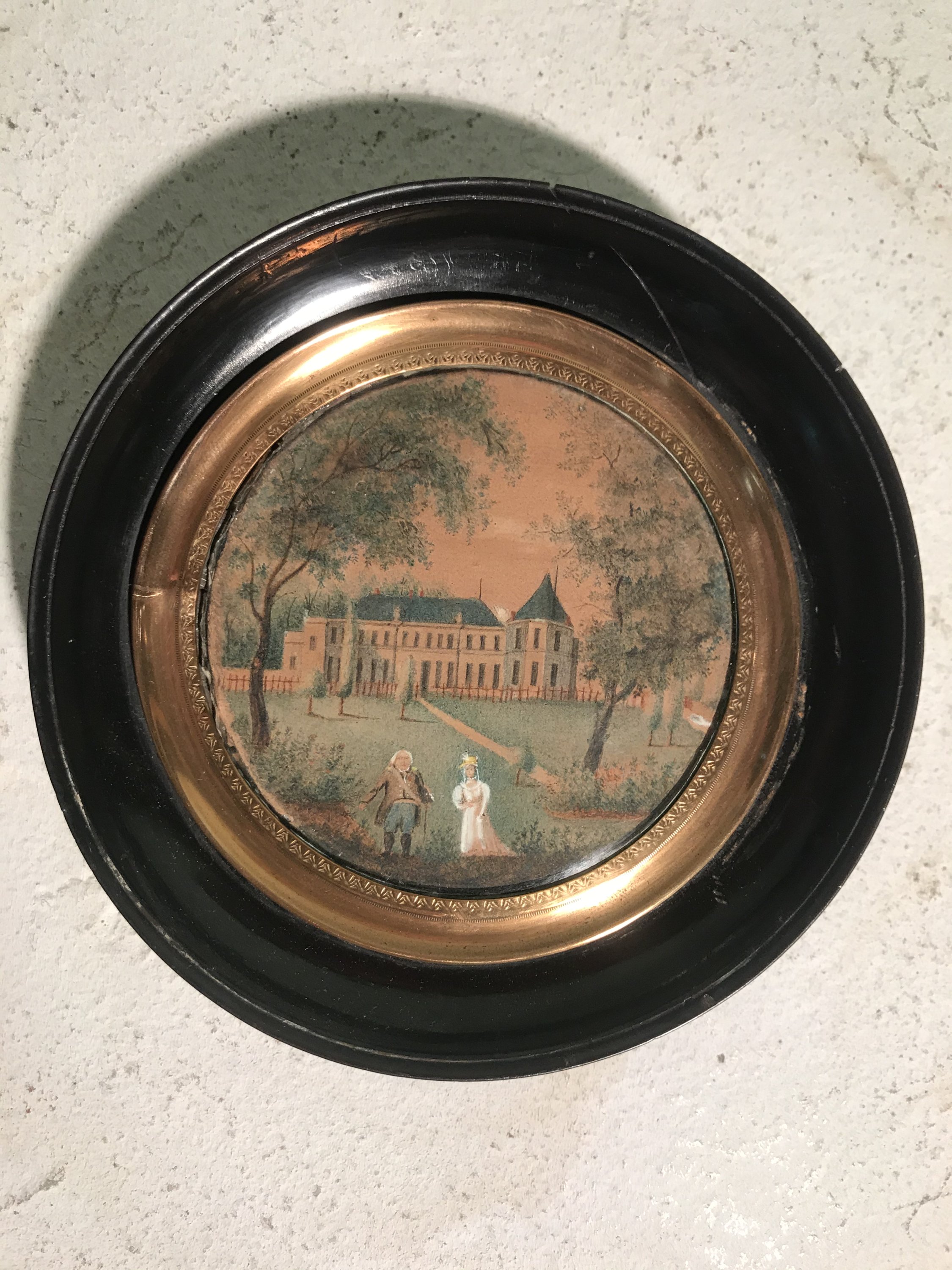 Dans un encadrement en bois doré de style Louis XVI : deux photographies représentant un zouave et une femme. Ferdinand VII roi dEspagne et des Indes, cuivre repoussé dans un cadre en métal doré. Deux miniatures sur ivoire représentant un portrait dabbé de cour et dame de qualité. Une miniature ronde représentant un portrait dhomme à la perruque. Autre miniature, dessin insolé, femme au bonnet de trois quarts. Portrait dofficier à la gouache ovale.