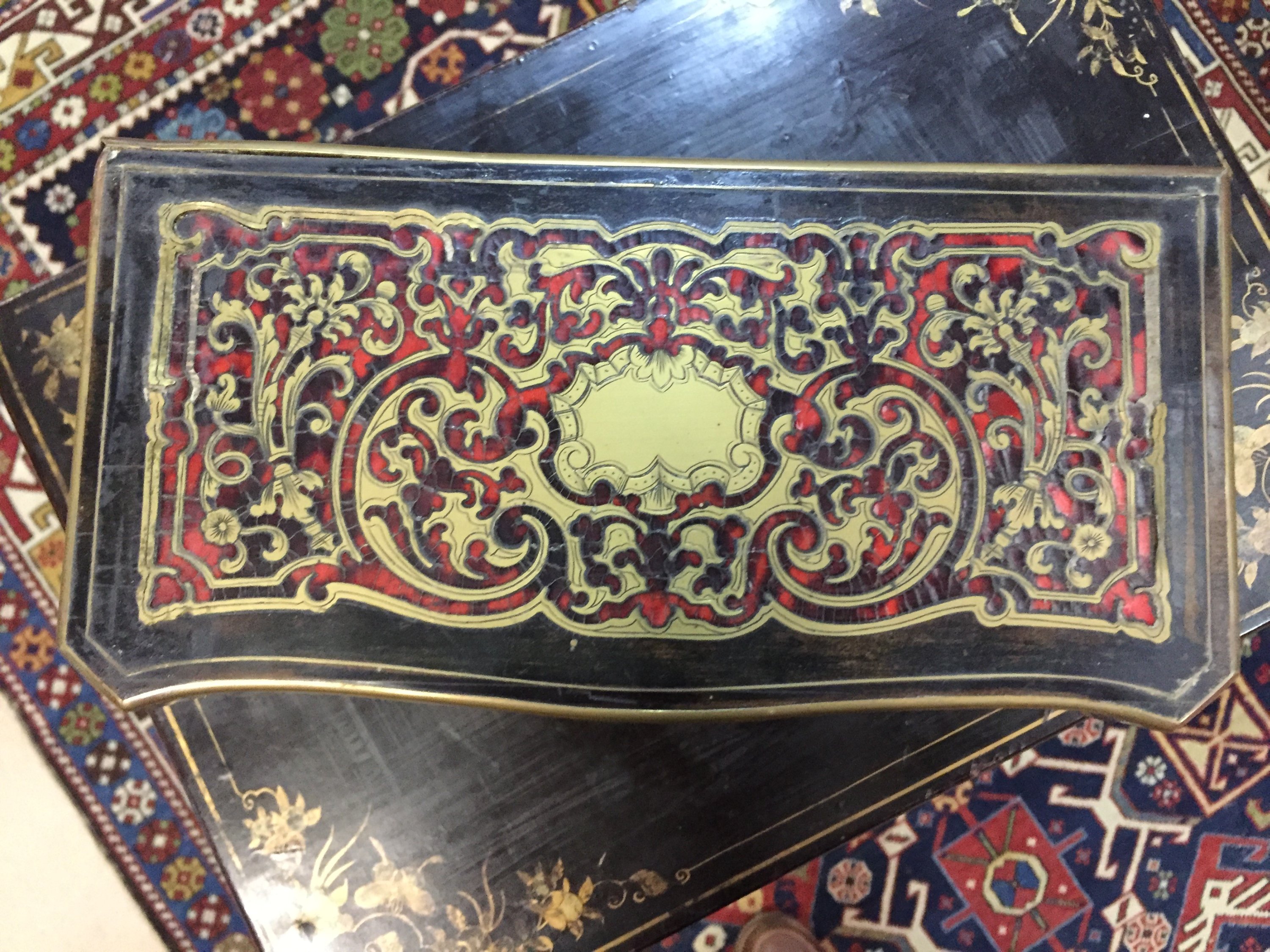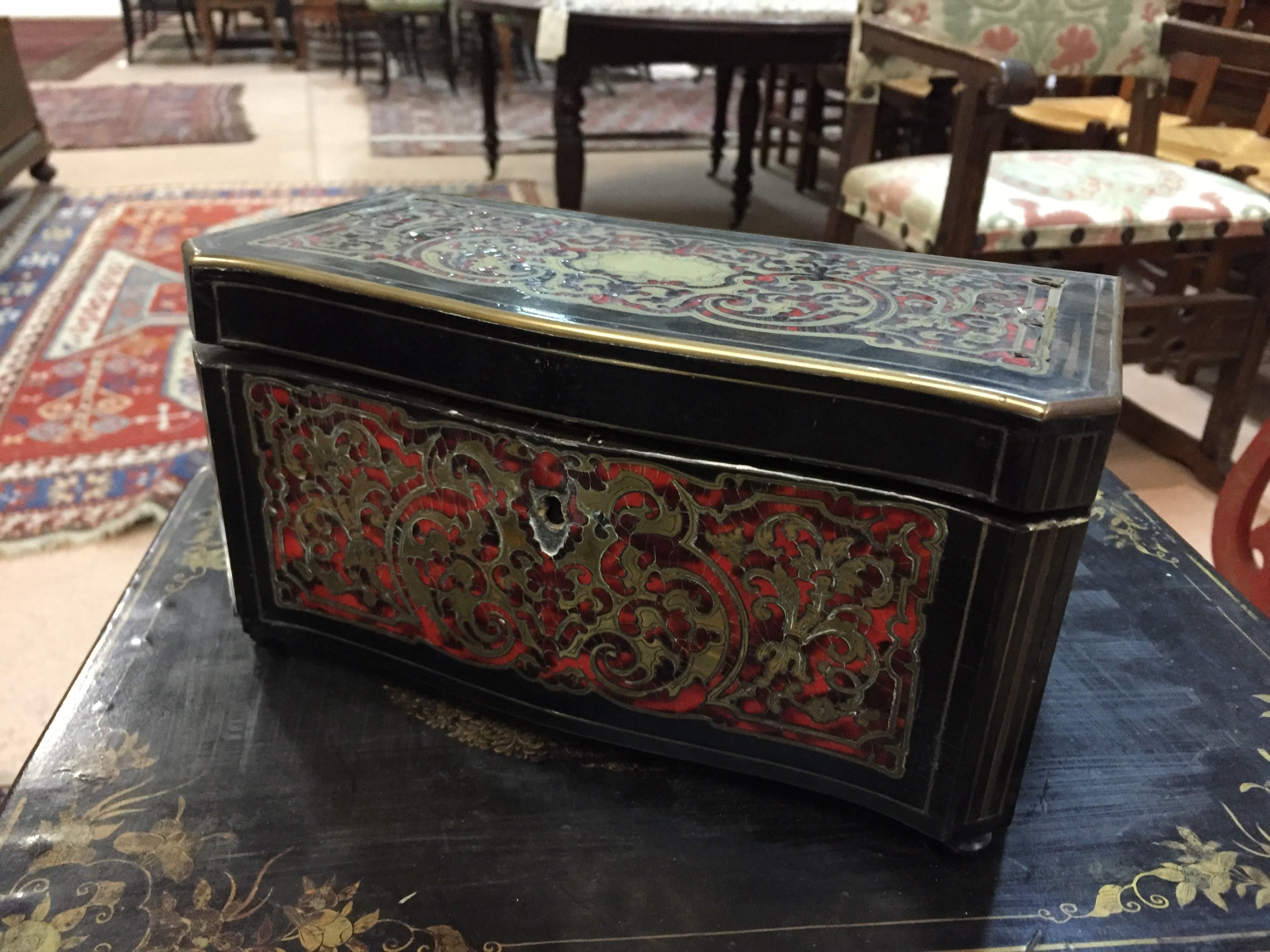 JOINT : coffret à thé en marqueterie de Boulle, fond écaille rouge. Style Louis XIV, XIXe. Haut. 11, Long. 23, Prof. 11 cm.