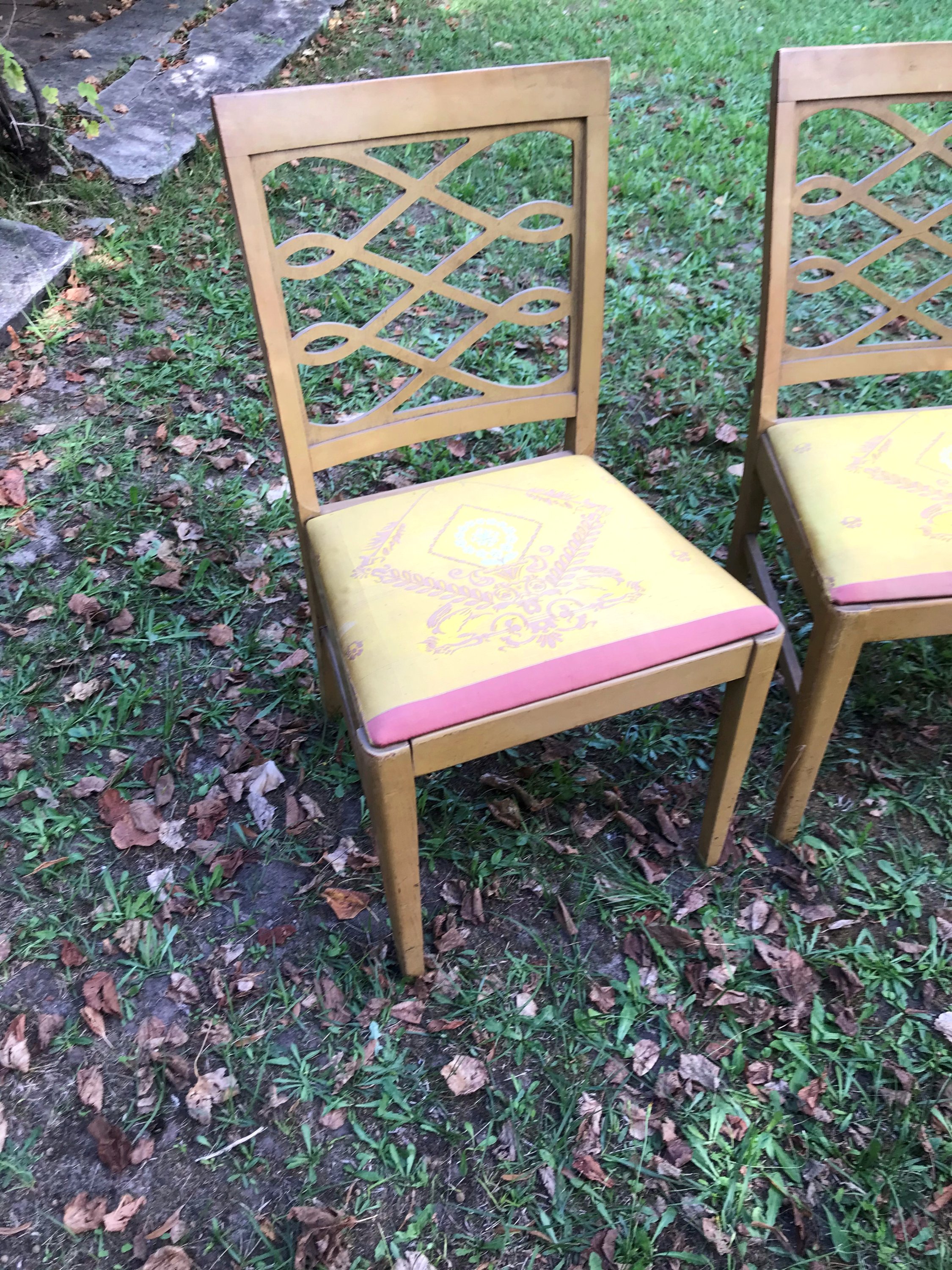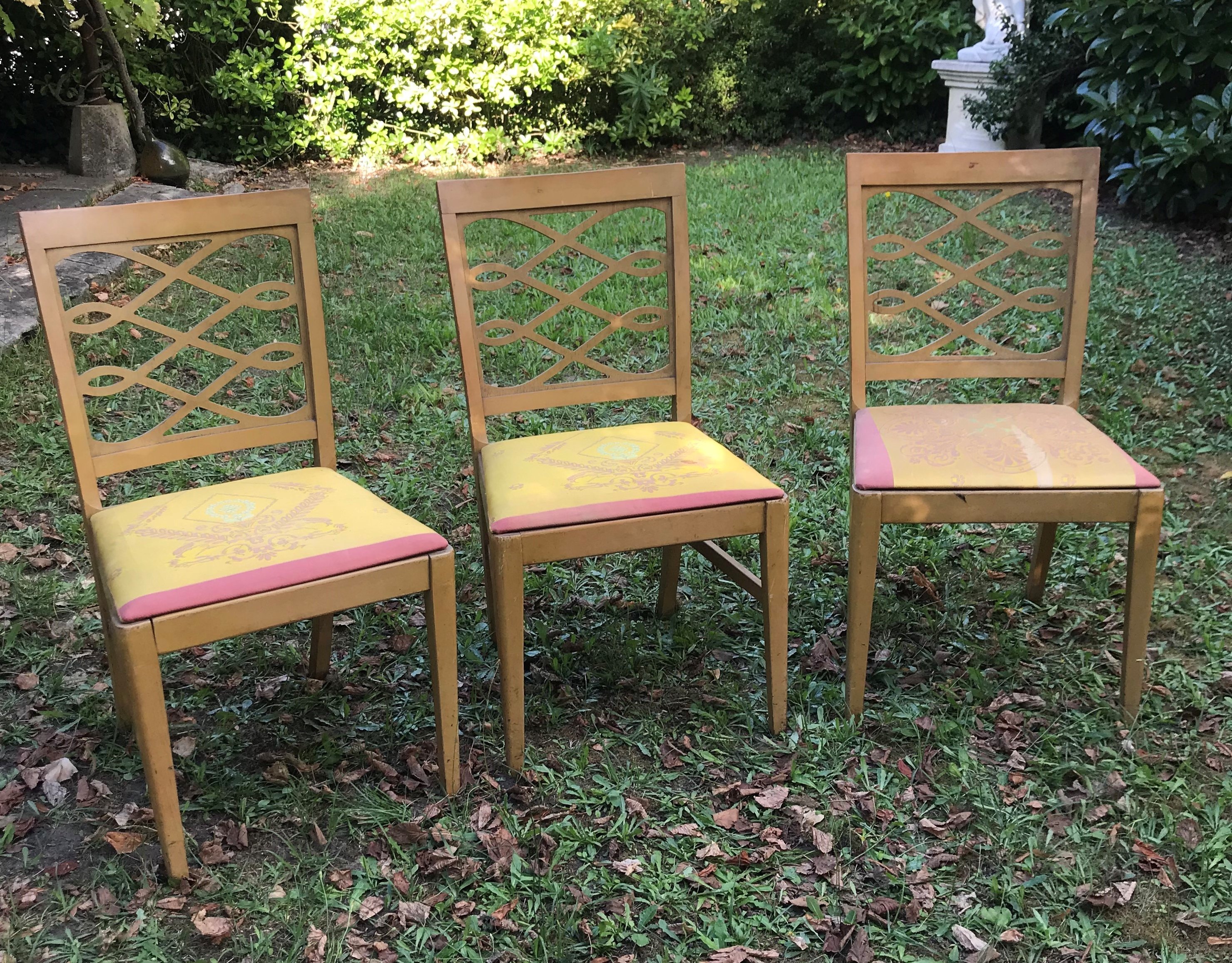 en bois laqué doré. De formes rectilignes, le dossier ajouré de losanges et d'enroulements.
