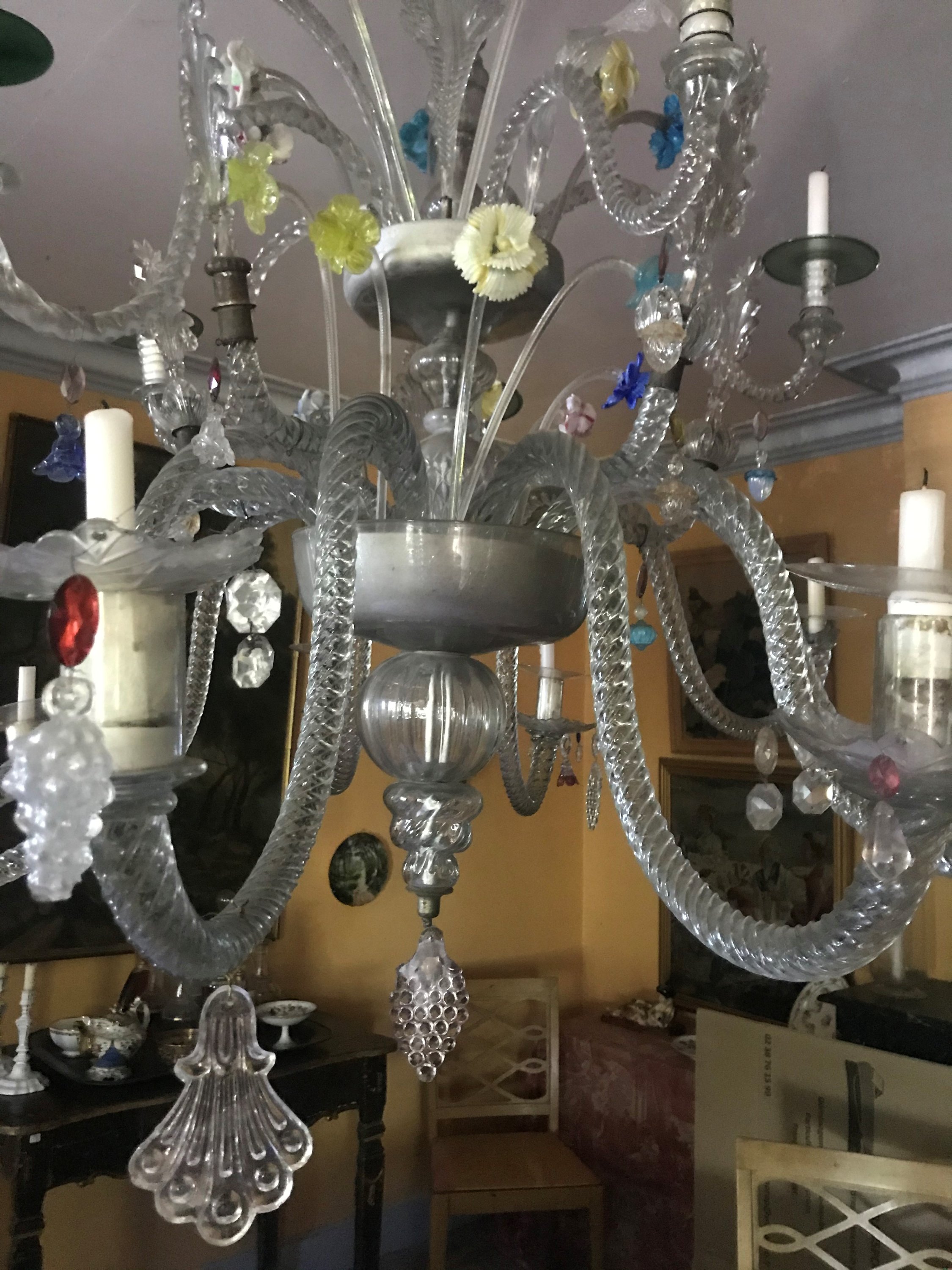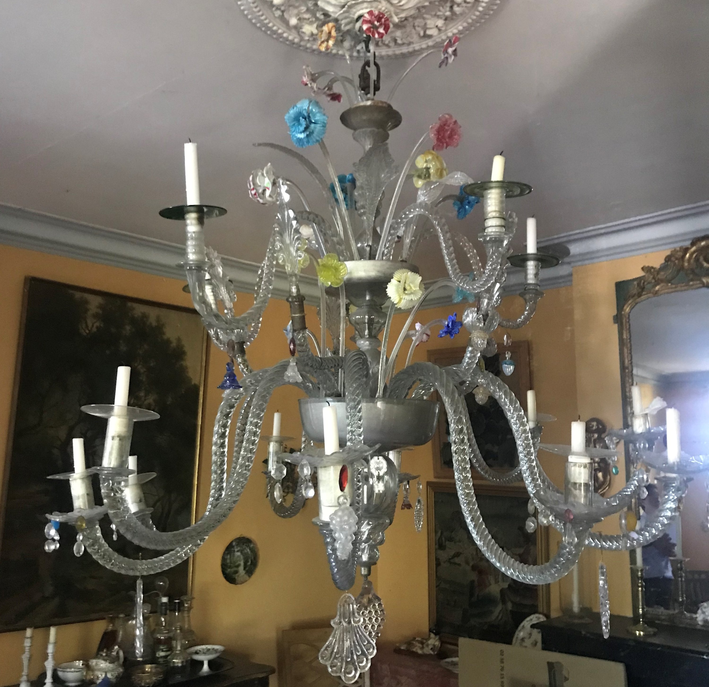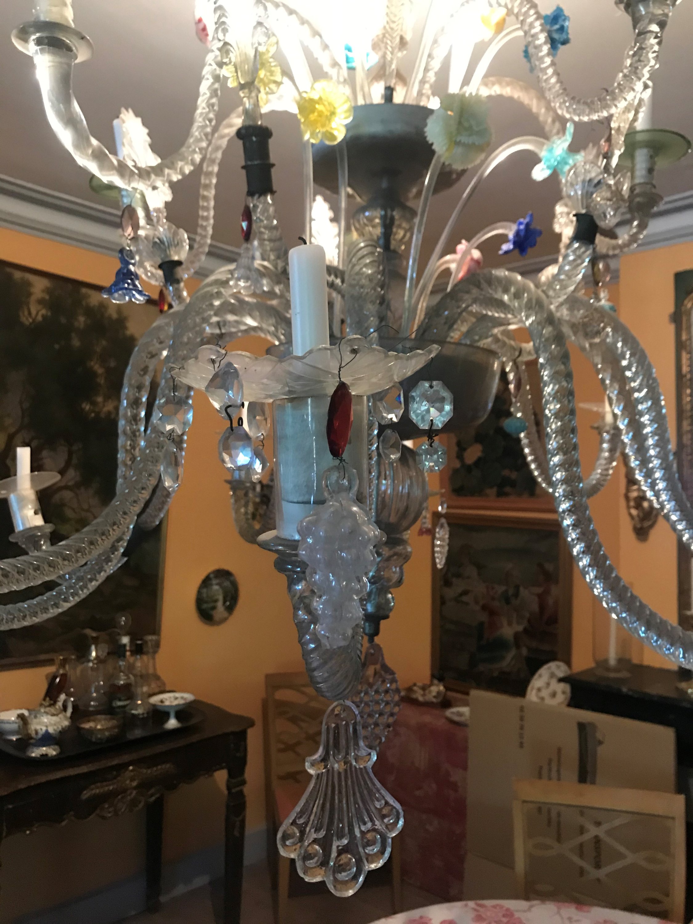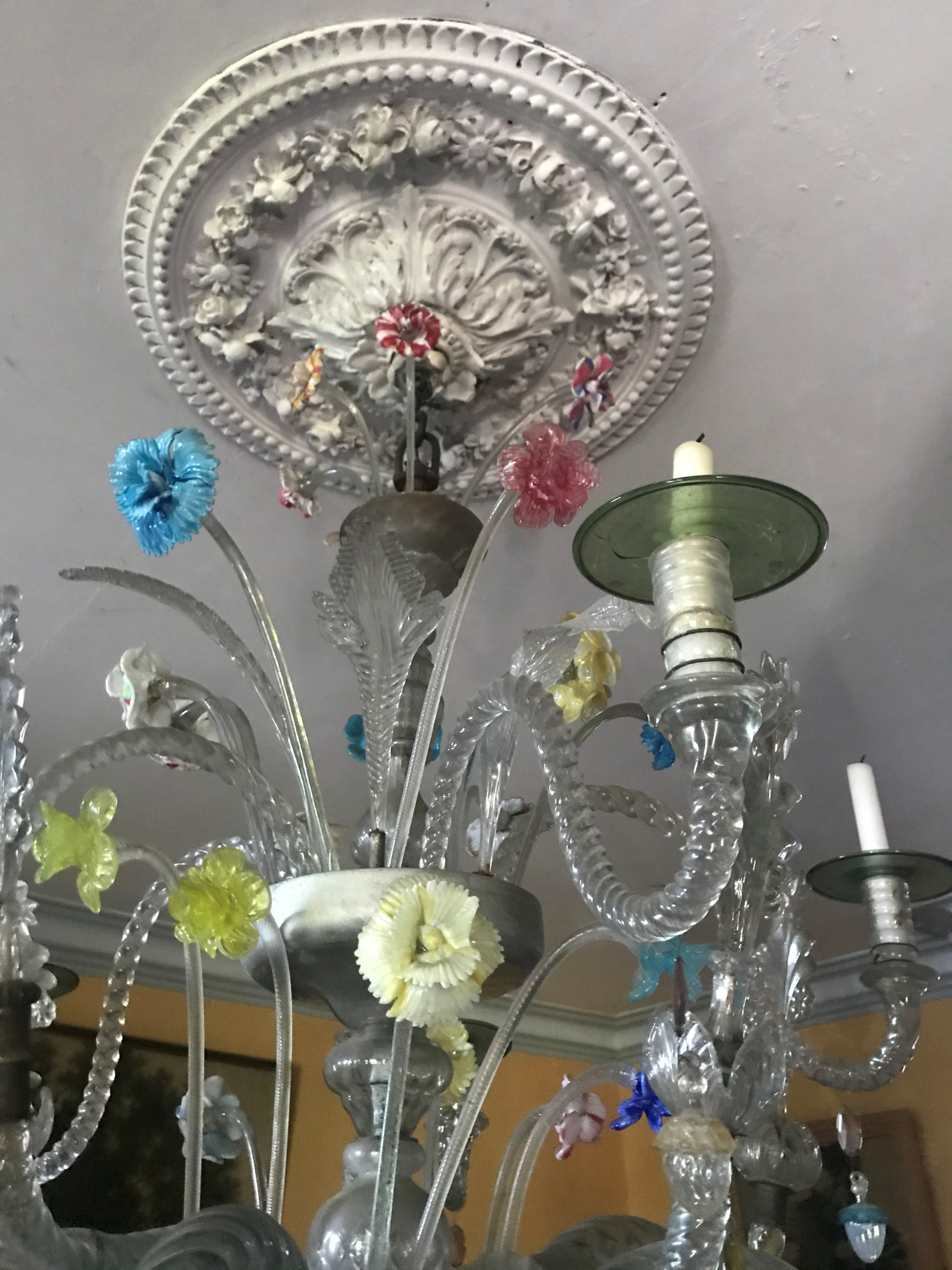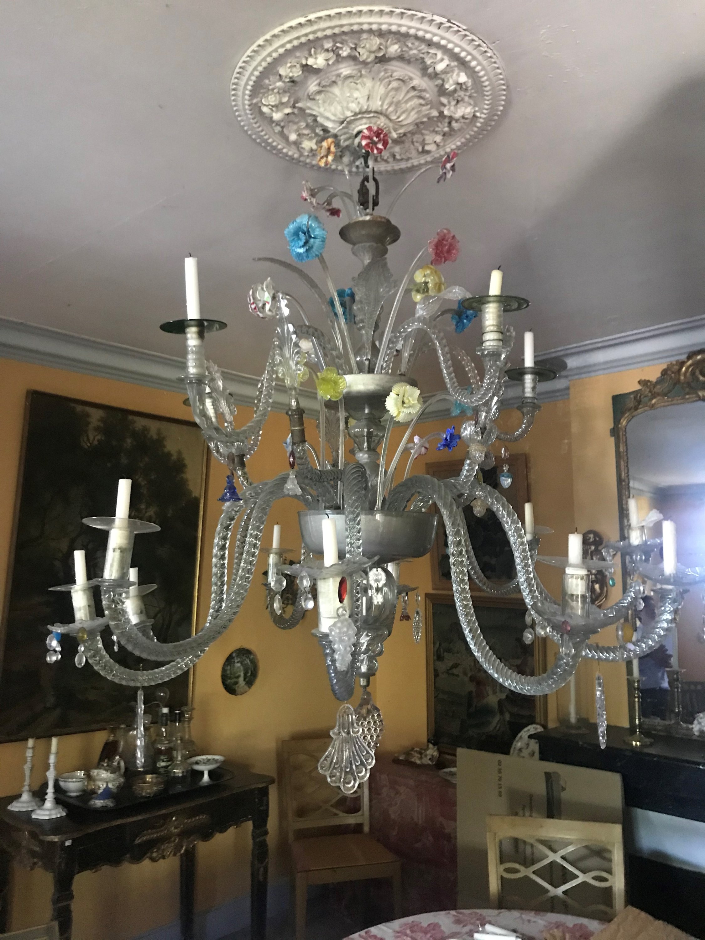 blanc et polychrome, à pampilles et pendeloques, trois couronnes comprenant vingt bras de lumière, dix bras de lumière dans la partie inférieure, cinq en partie intermédiaire, cinq dans la partie supérieure fixés dans des bassins. Les couronnes intermédiaire et supérieure composées denviron vingt-et-une fleurs épanouies et trois feuilles de palmes