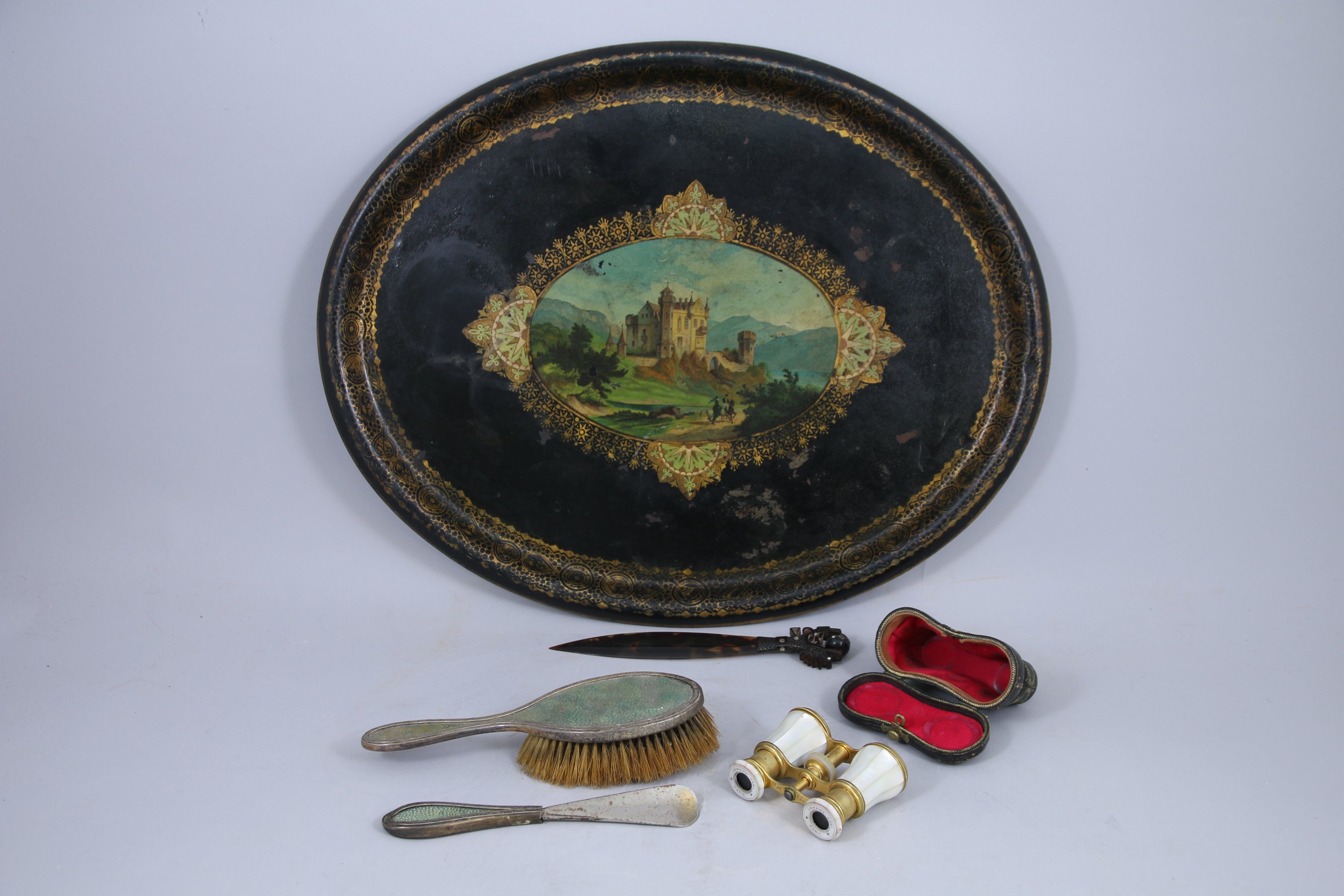 - Un PLATEAU ovale en tôle noire et or avec en son centre un château dÉcosse, fin XIXe. 56 X 45 cm.