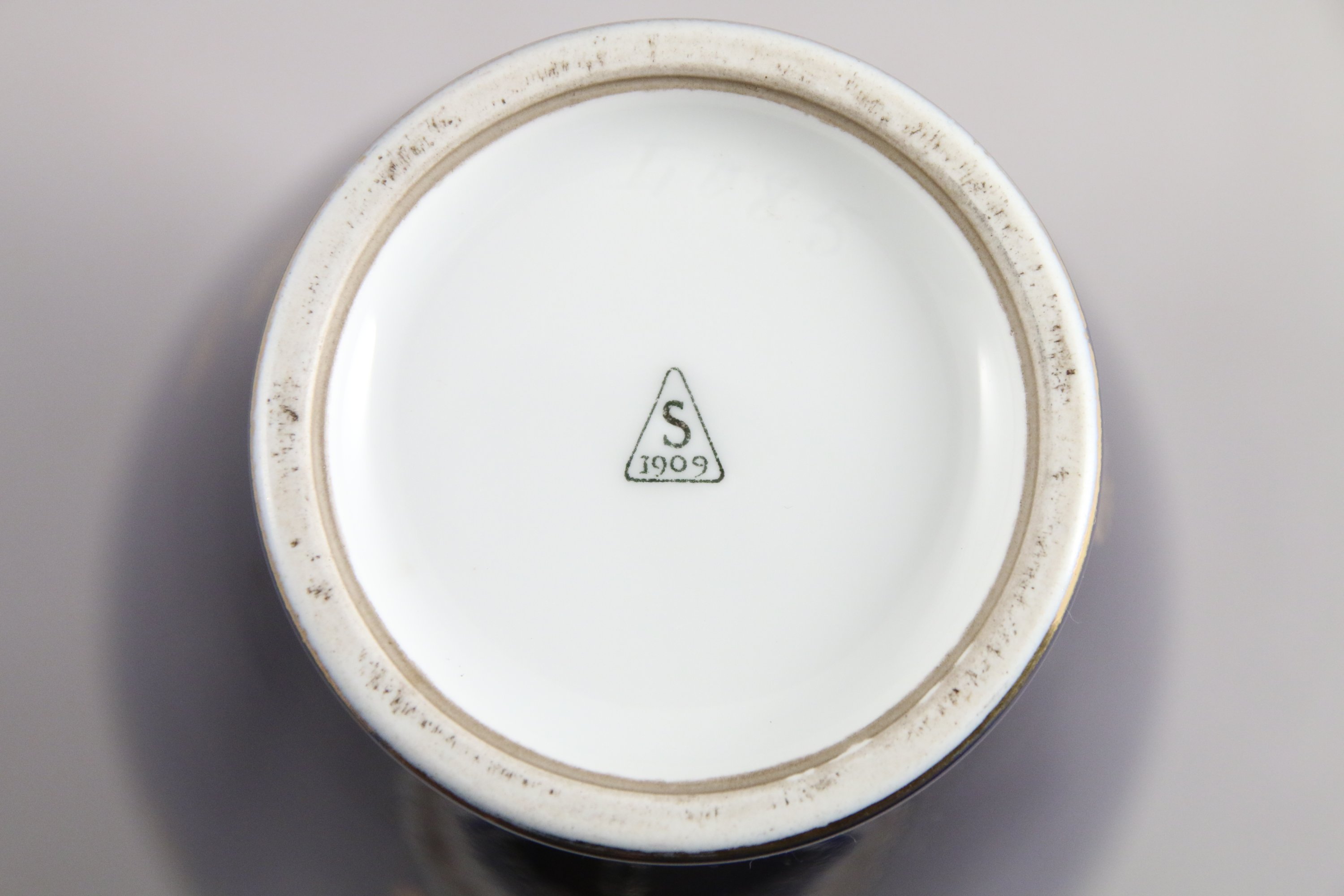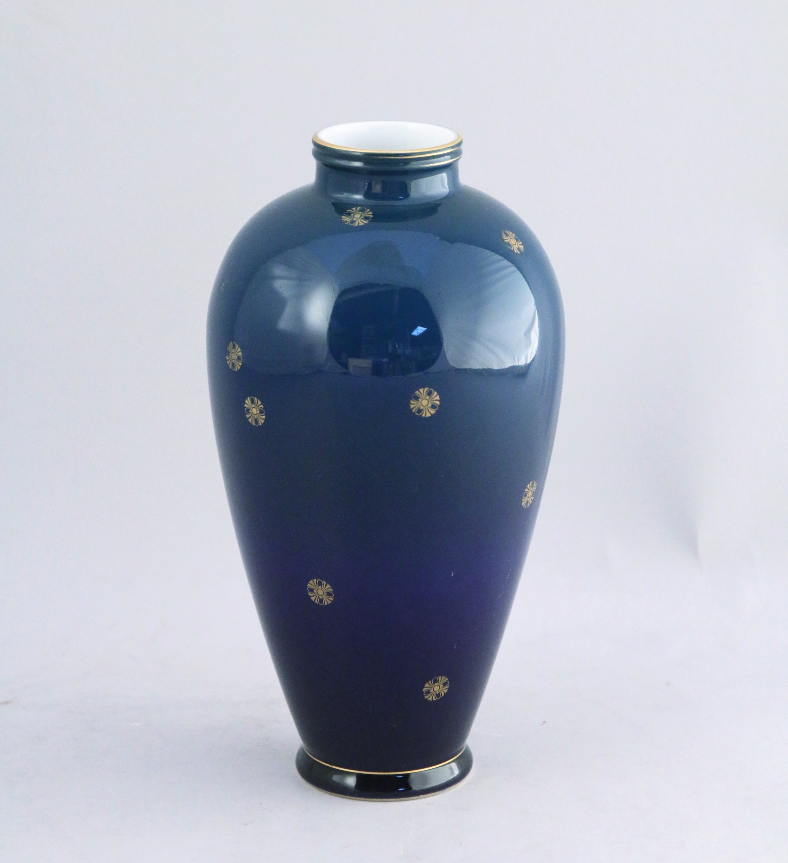 en porcelaine émaillée d'un très beau dégradé de bleus, rehaussé à l'or de fleurs à la façon des môns.