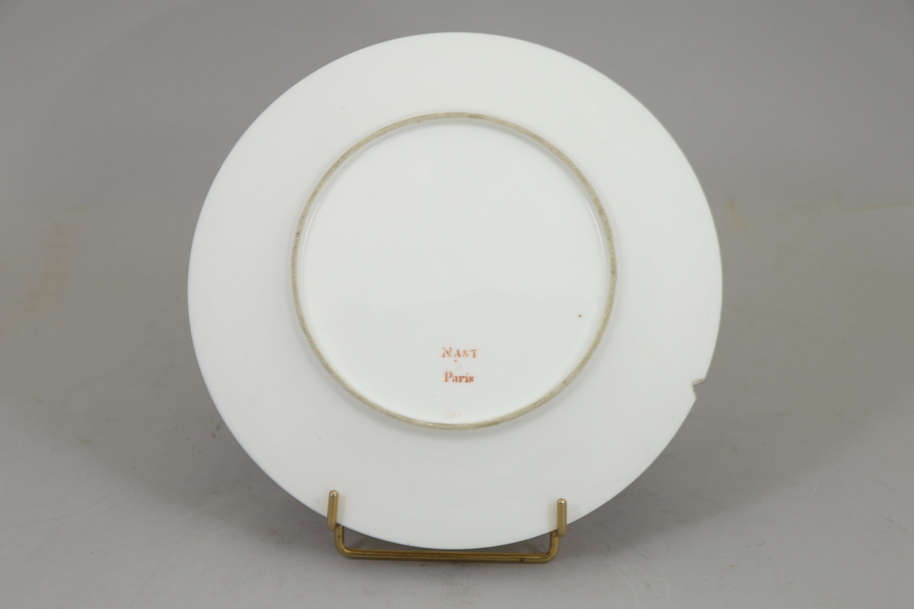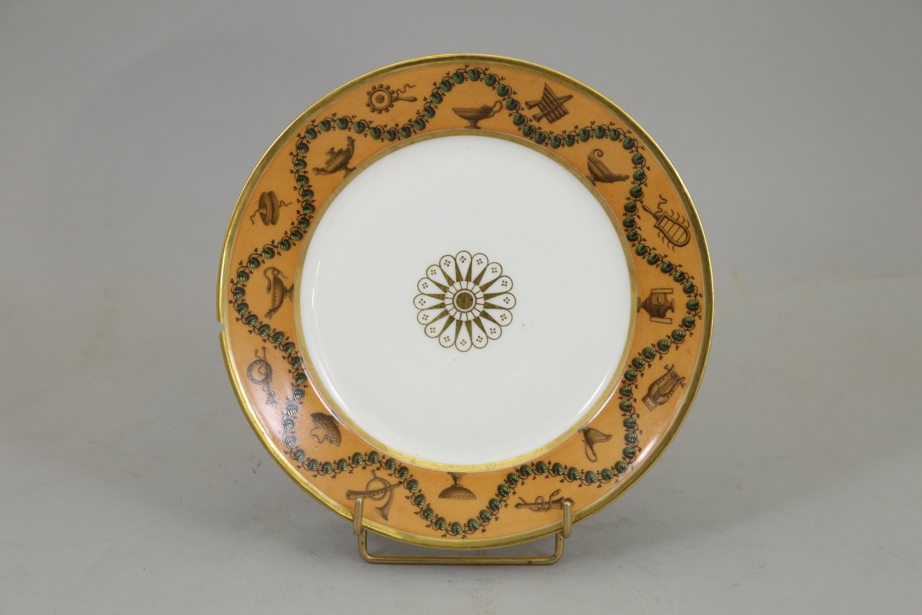 en porcelaine et filet dor offrant sur le marli un décor aux instruments de musique et vases de formes antiques en alternance dune frise de feuilles de lotus. Le centre présentant une fleur stylisée épanouie.
