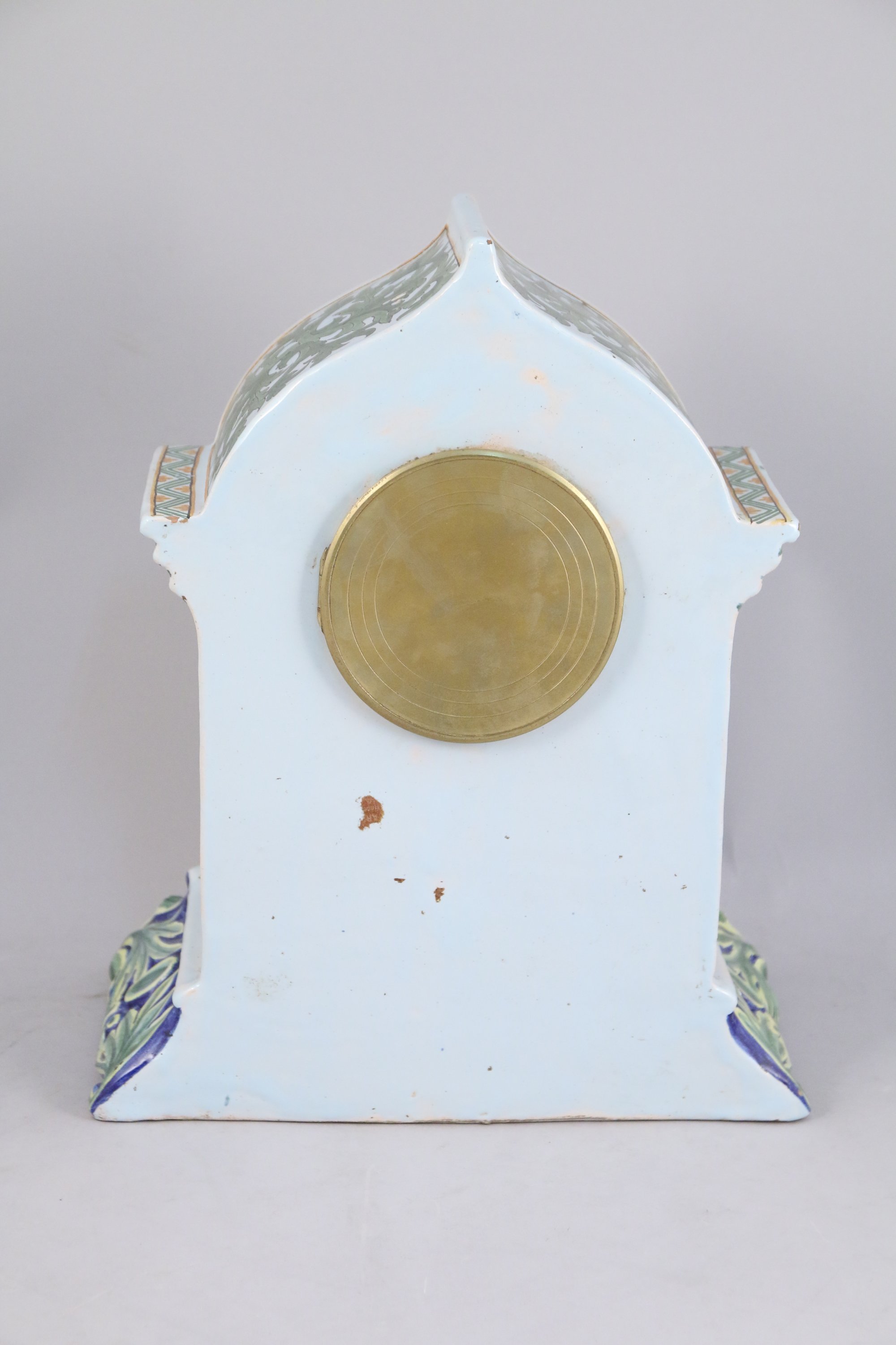 Bibliographie : Philippe LE STUM & Bernard Jules VERLINGUE, "Encyclopédie des Céramiques de Quimper", Tome II le XIXe siècle, éditions de la Reinette, 2004, p. 405, pour une pendule identique aux feuillages de couleurs différentes, datée entre 1875 et 1898.