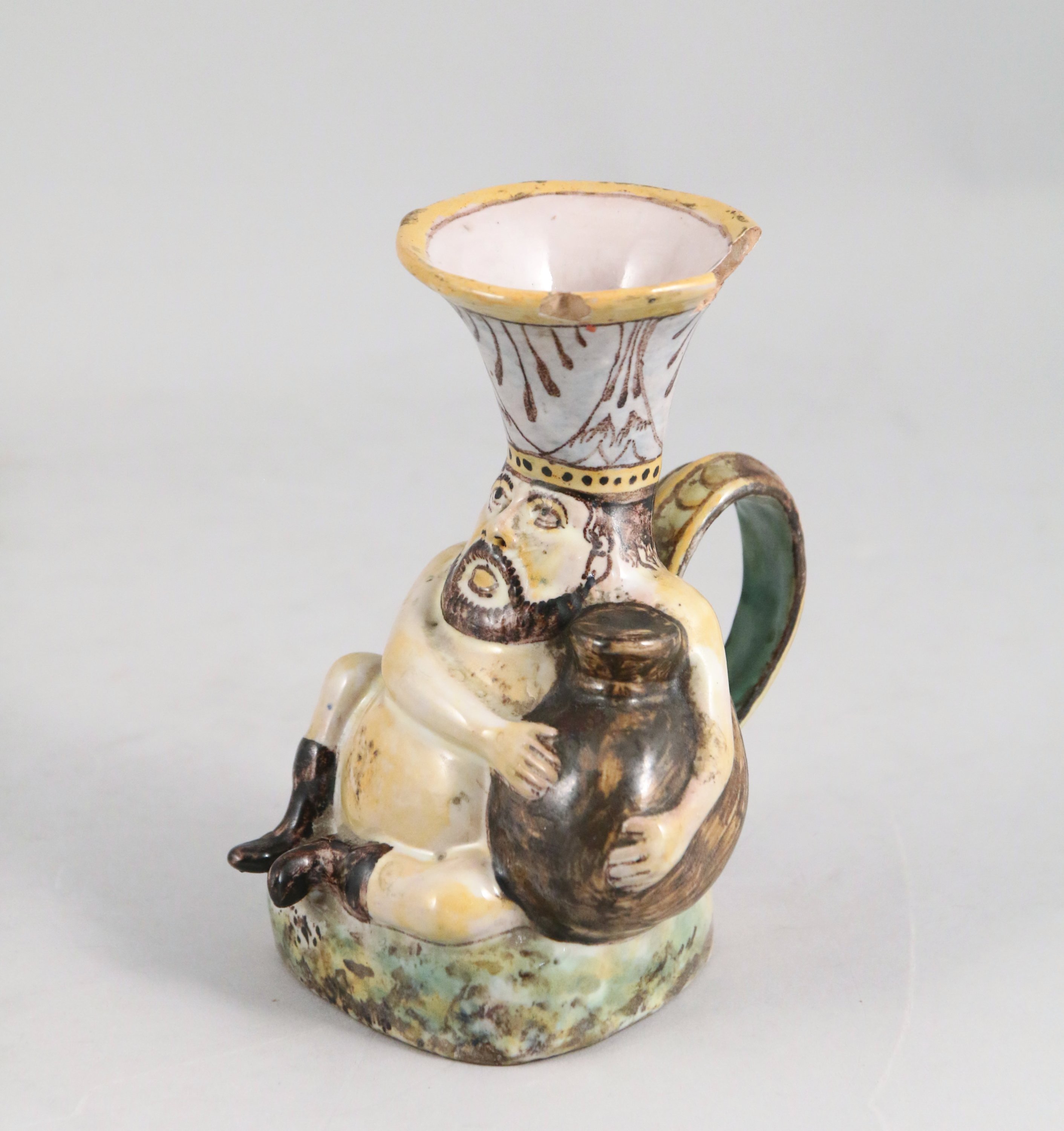 en faïence émaillée de forme anthropomorphe figurant un homme barbu, simplement chaussé de bottes, accoudé à une outre et assis contre la prise ornée d'une frise écaillée. Le col évasé à décor géométrique.