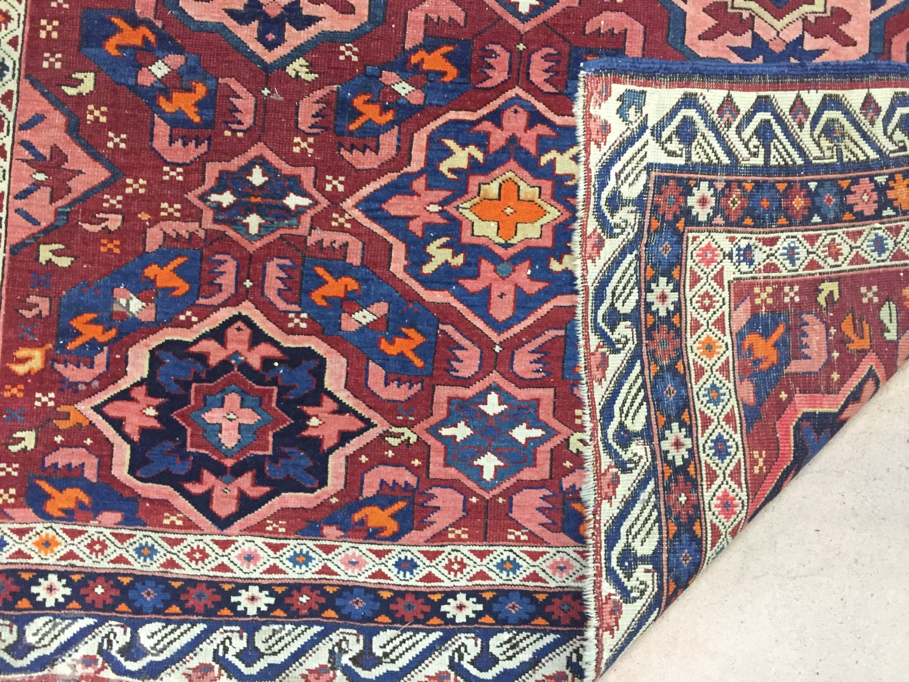 TAPIS KAZAK en laine. Décor géométriques aux motifs bleus sur fond rouge.